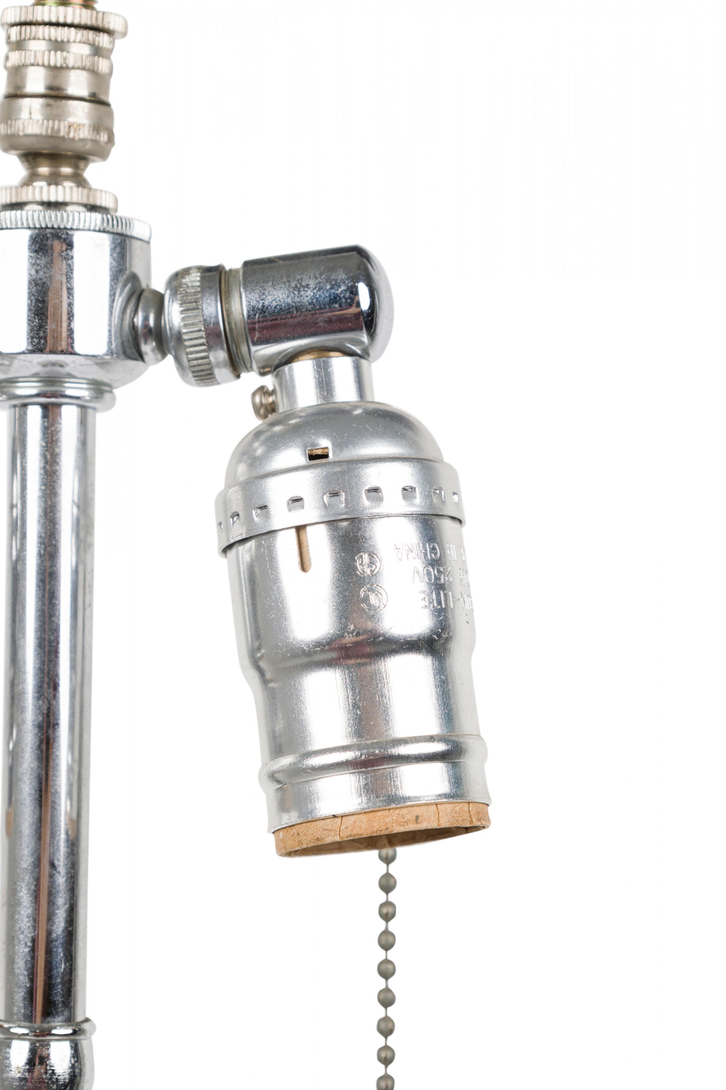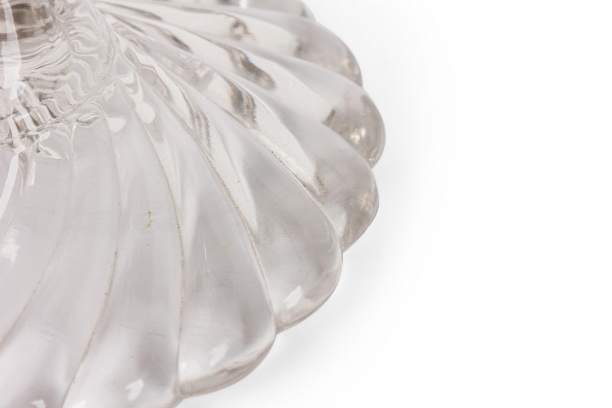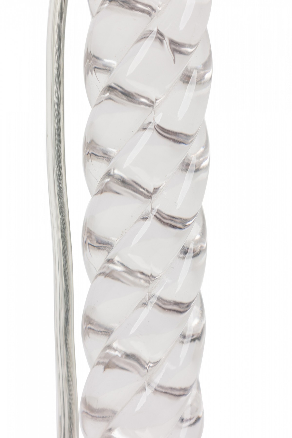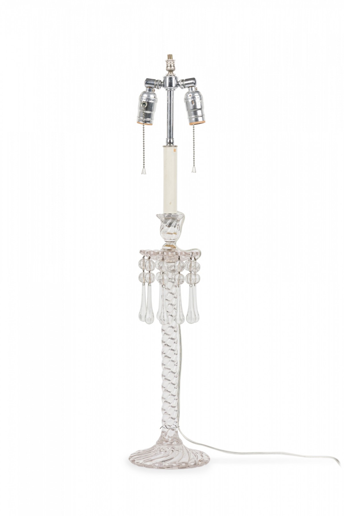 2 English Victorian style crystal glass table lamps featuring two adjustable silver metal light sockets, supported by a machine cut glass faux rope form column which includes sphere/teardrop ornaments suspended from an upturned flower form bowl ending in a circular base. (PRICED EACH)