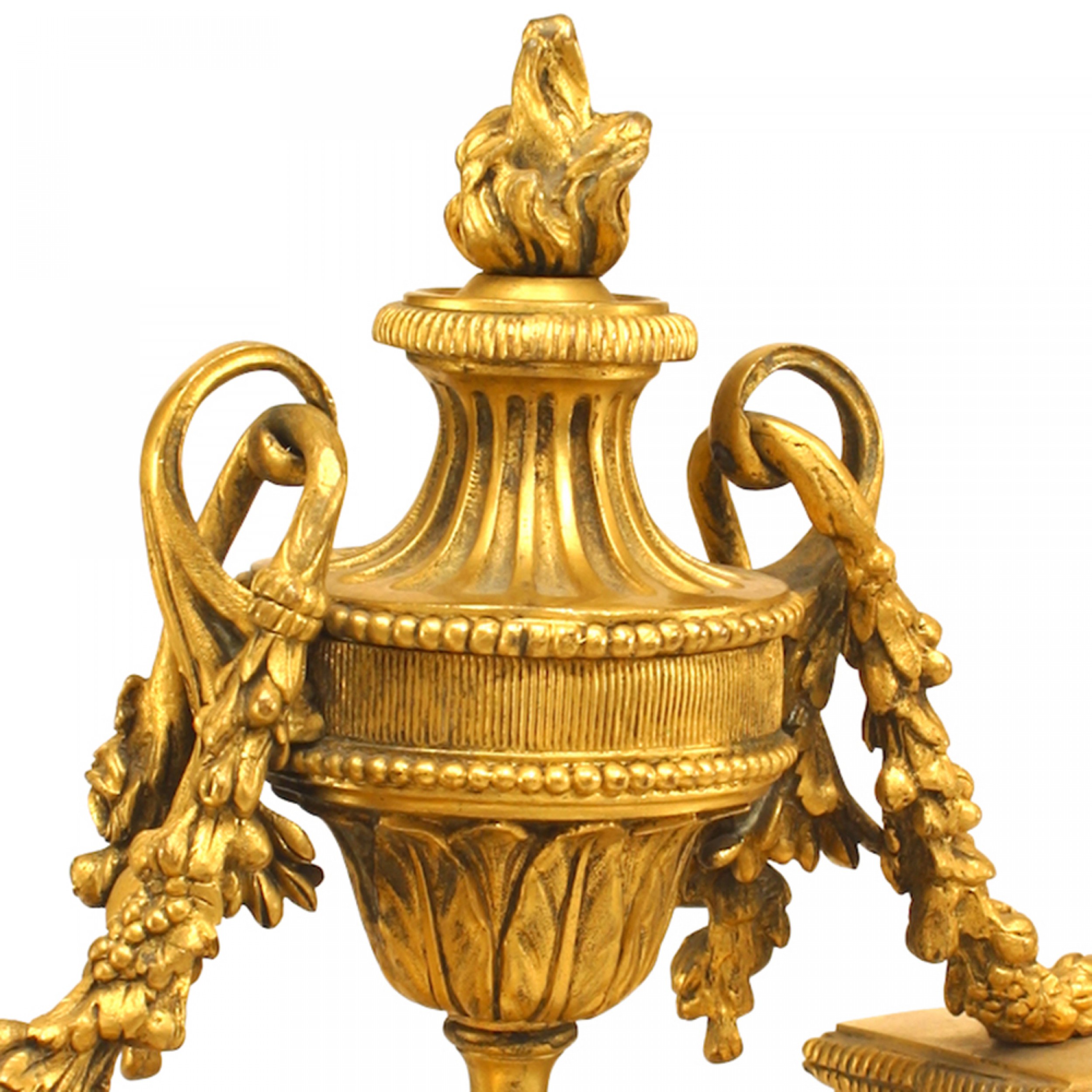 PAIR of French Louis XVI-style (19th Century) bronze andirons/chenets with centered urn having festoons through each side handle with a flame finial top. (PRICED AS PAIR)