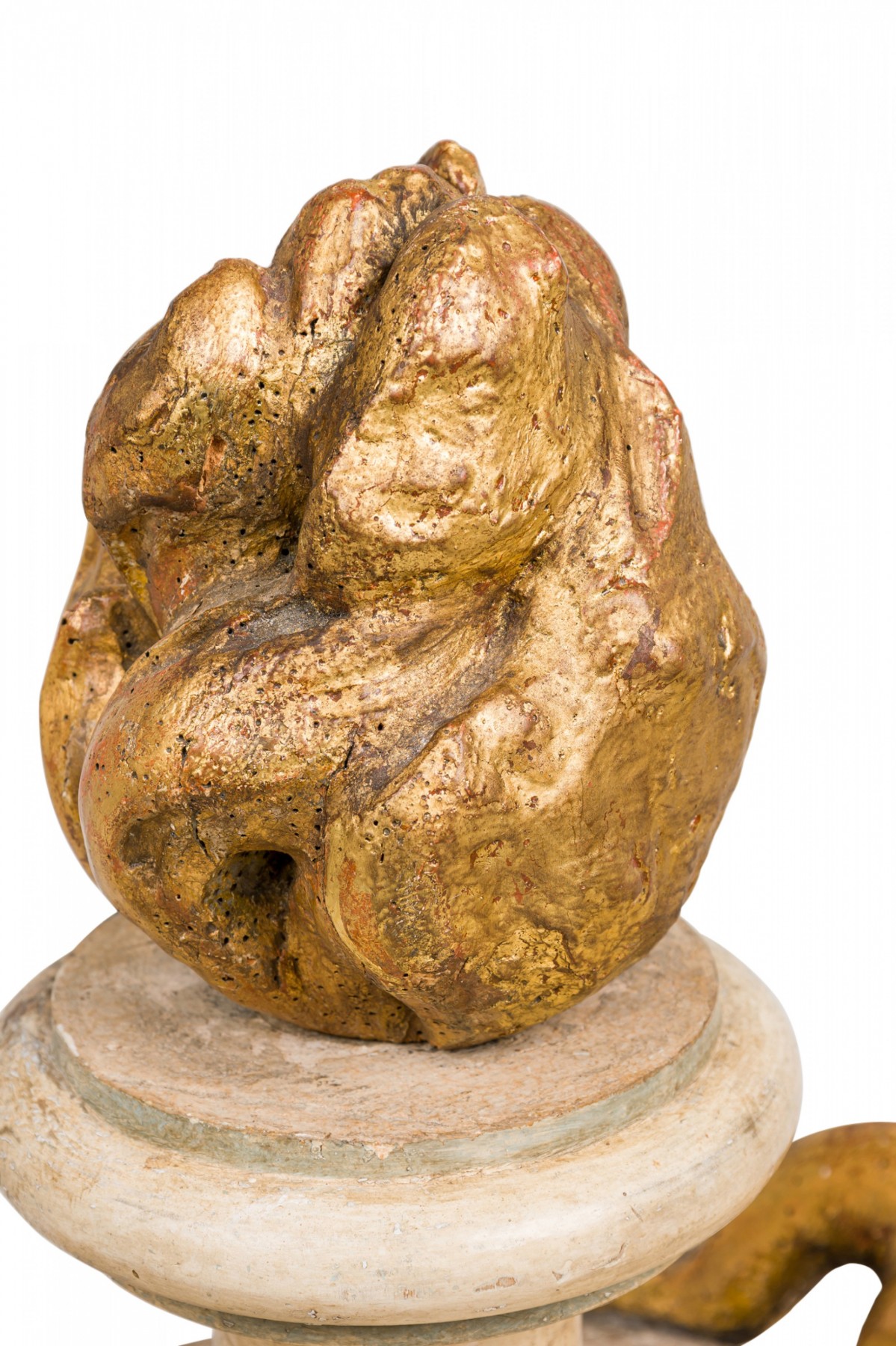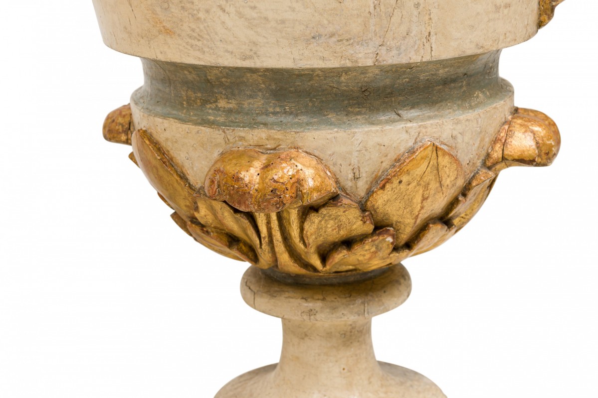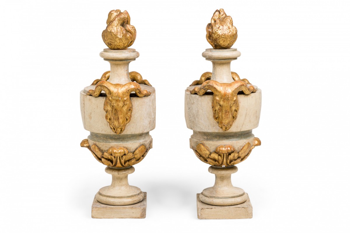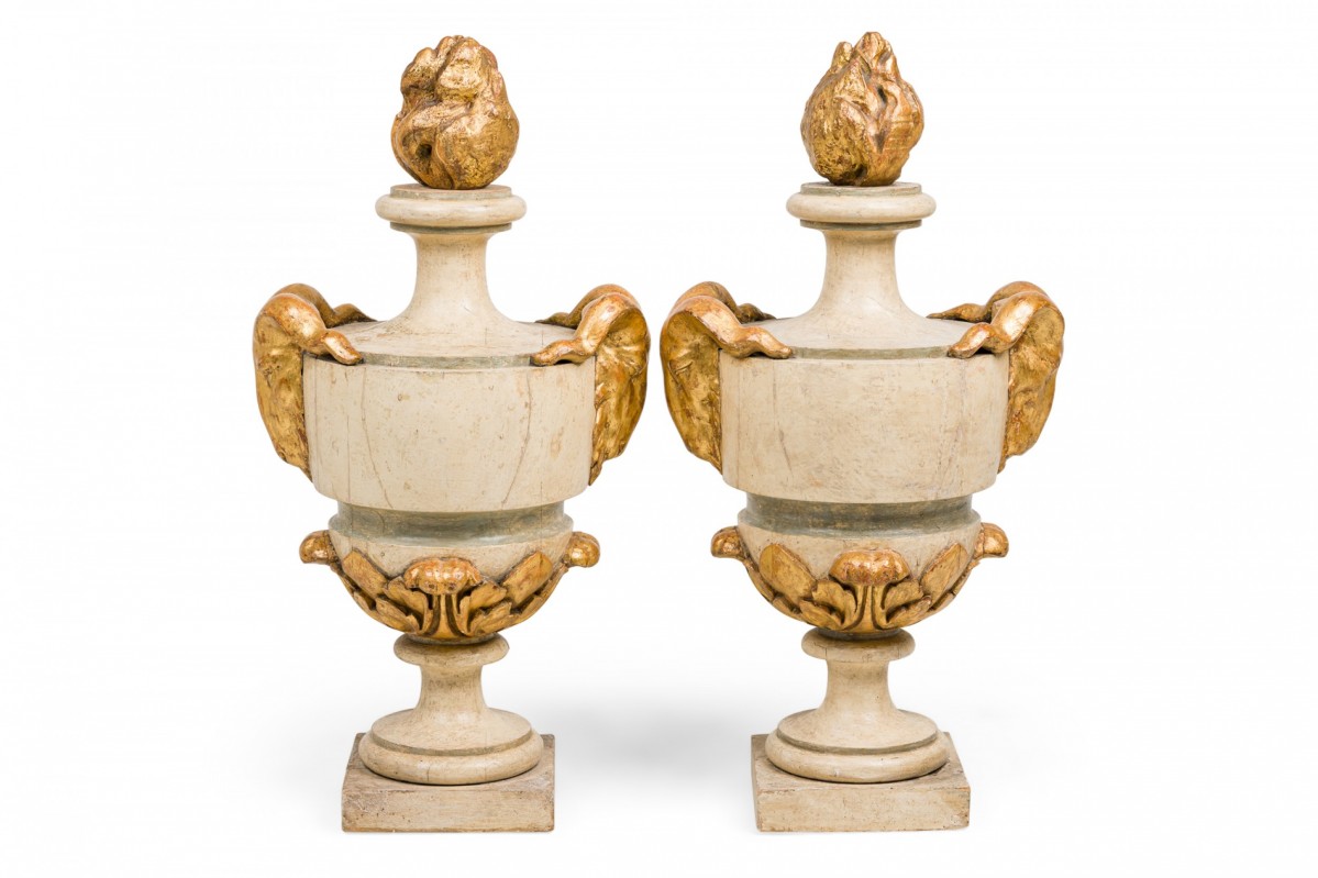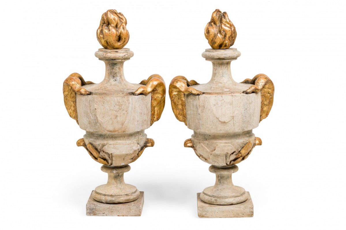 Choose one of the options below.Pair of Italian Neo-classic Parcel Gilt Painted Wood Flame Finial Decorative Urns