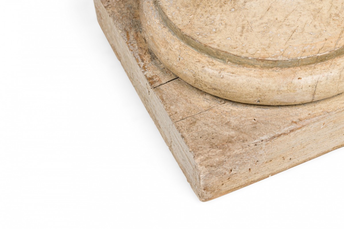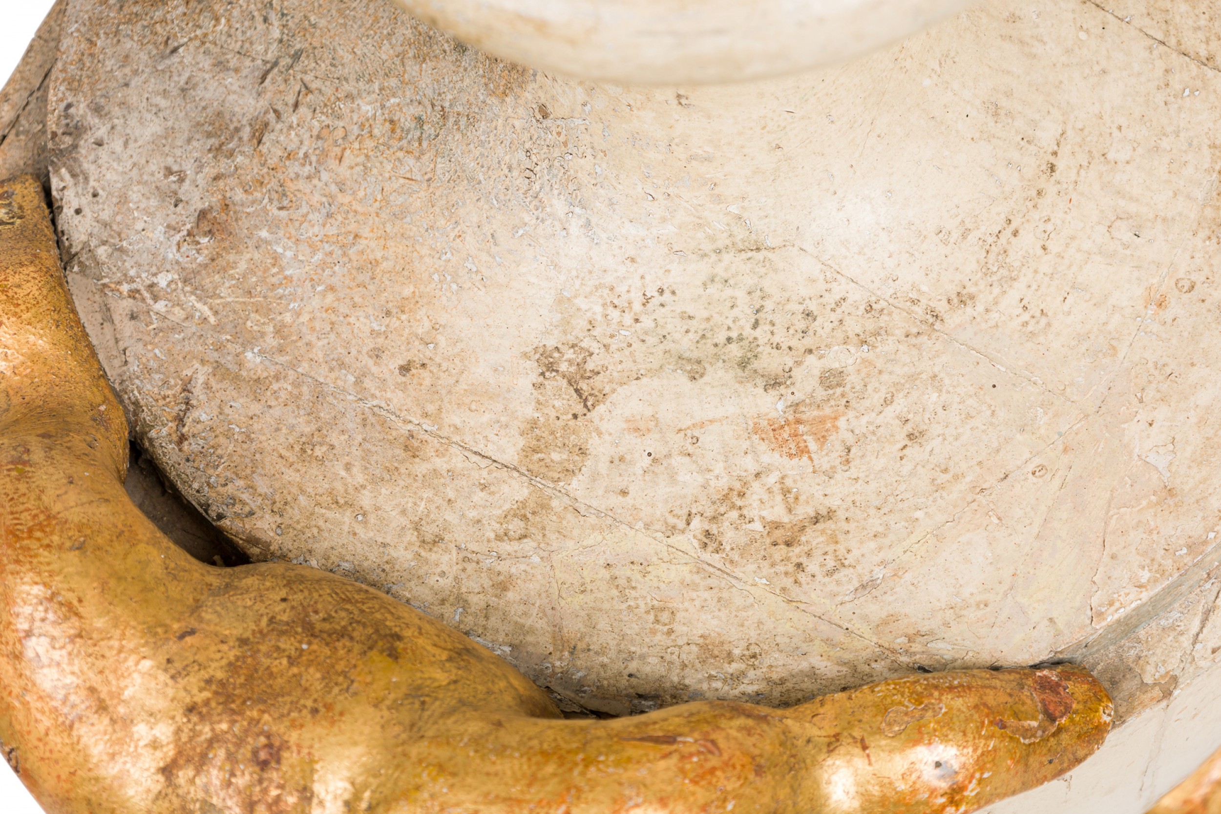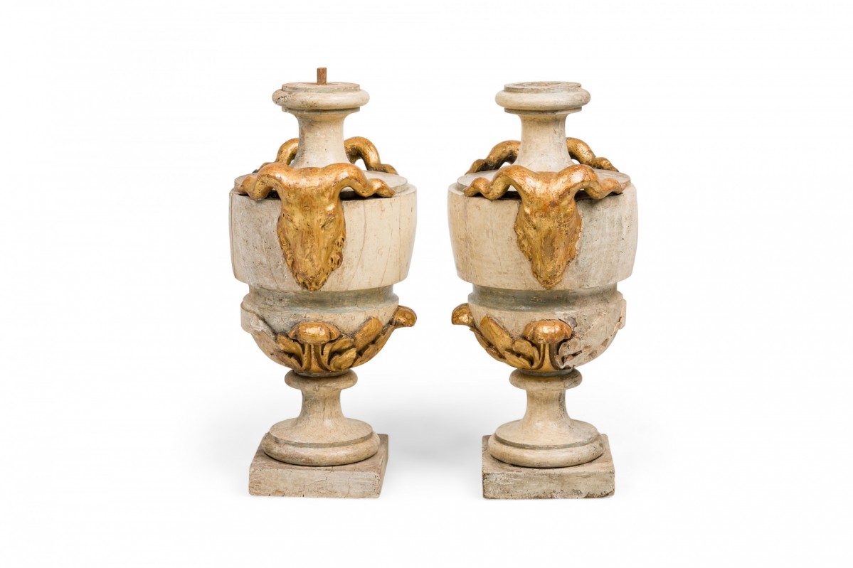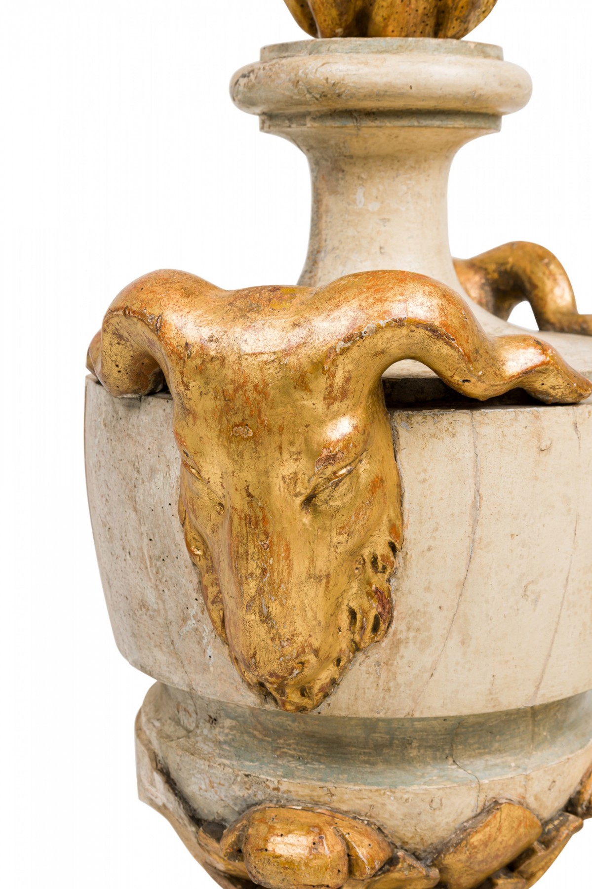 PAIR of Italian Neo-classic (18th Century) Monumental white painted wooden decorative floor urns in baluster form with parcil gilt flame finials, ram's head faux handles plus scroll & foliate bordered square bases (PRICED AS PAIR)