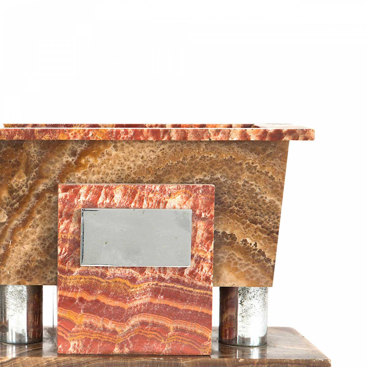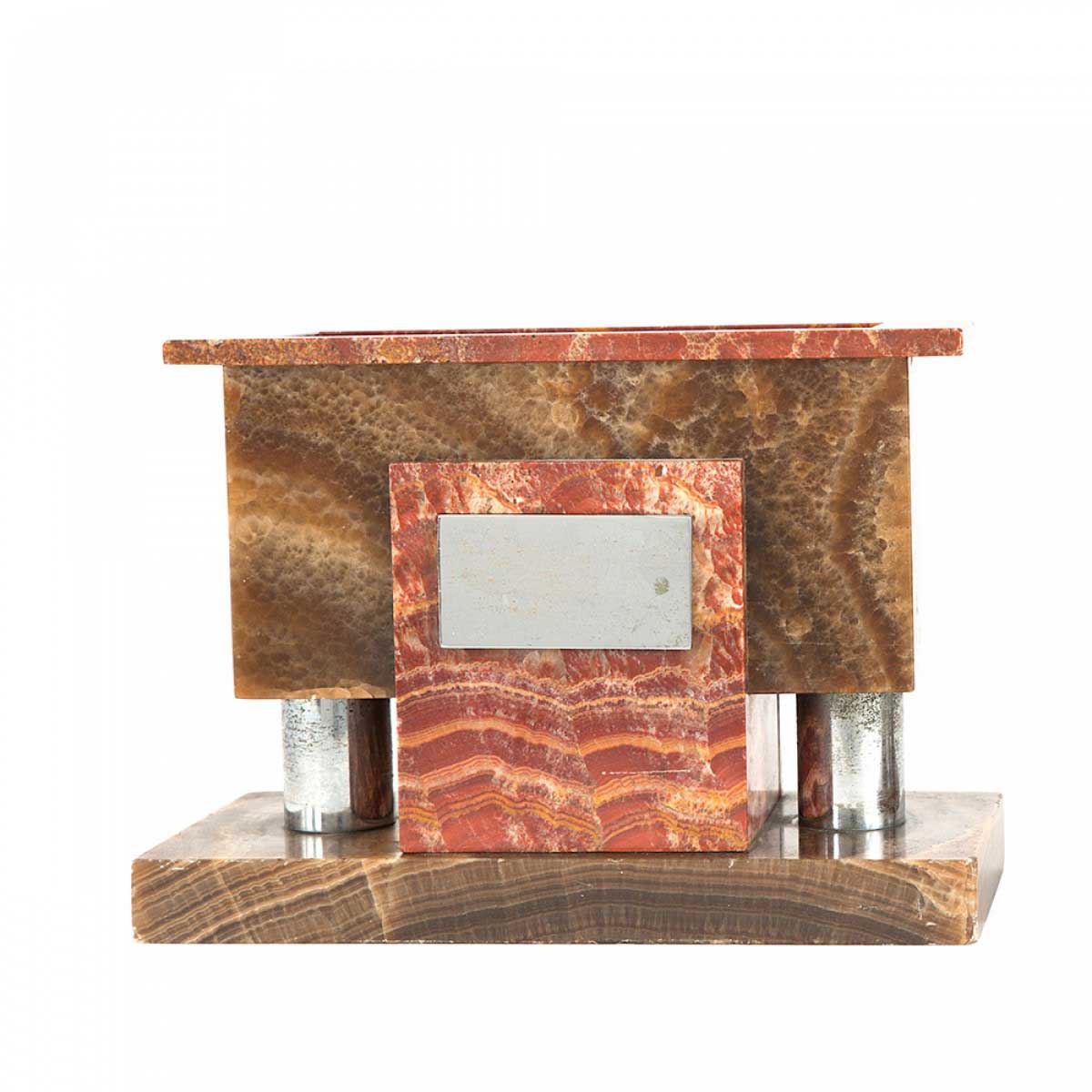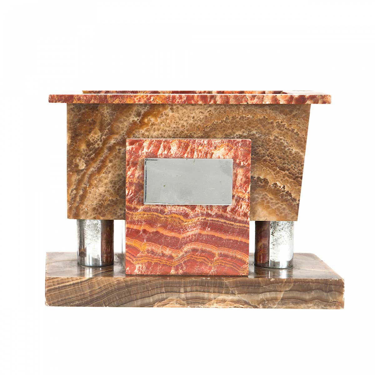 PAIR of Art Deco solid red and brown marble rectangular bookends with a decorative silver metal plate on the front and a recessed compartment in the top. (PRICED AS PAIR)