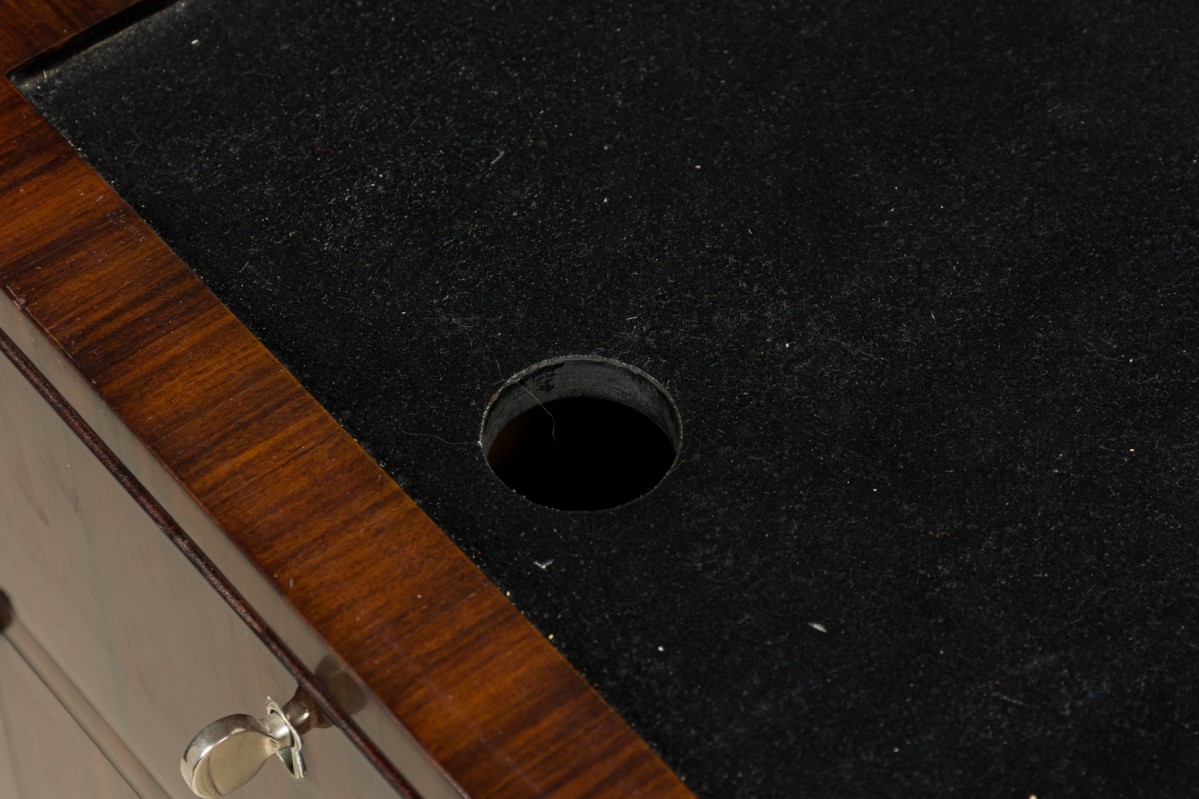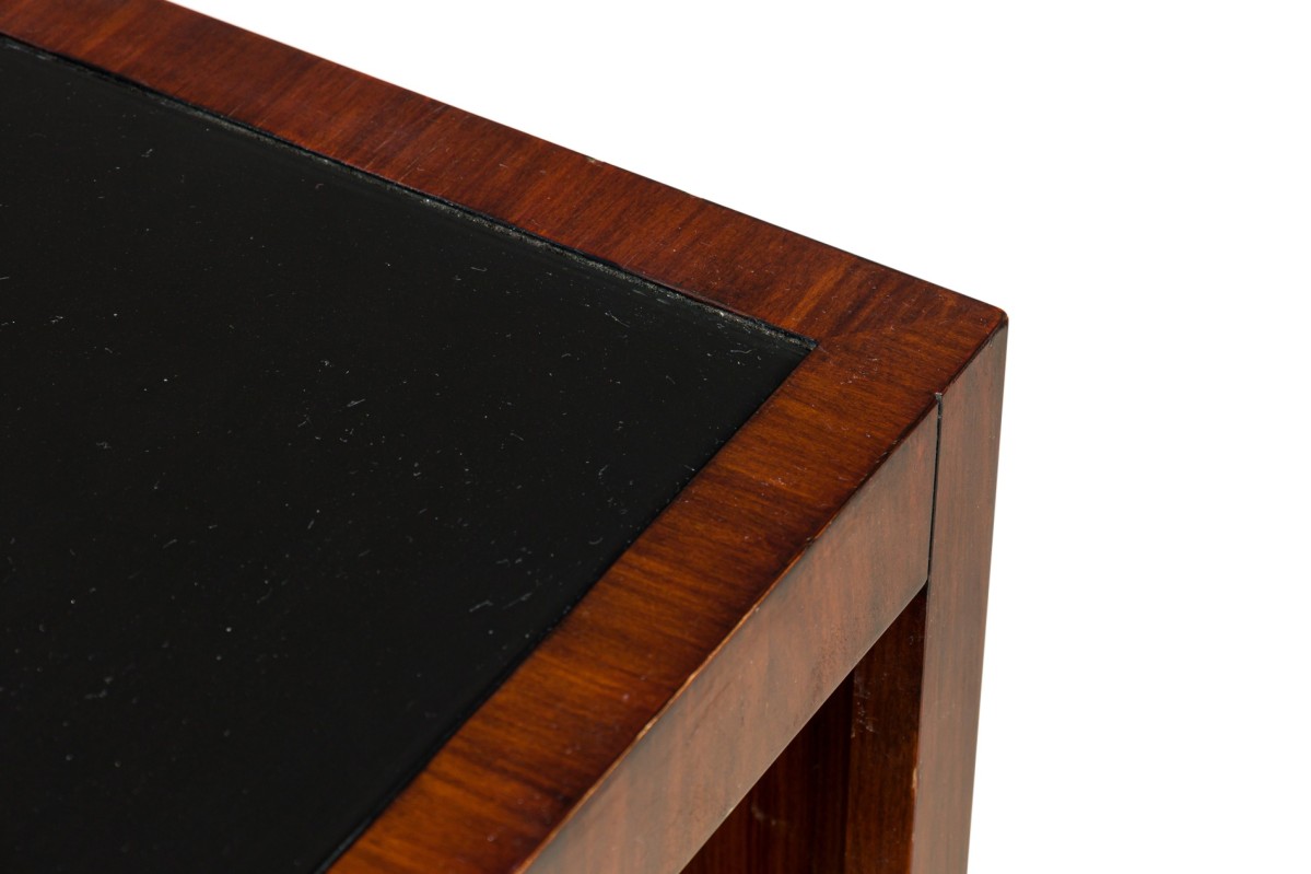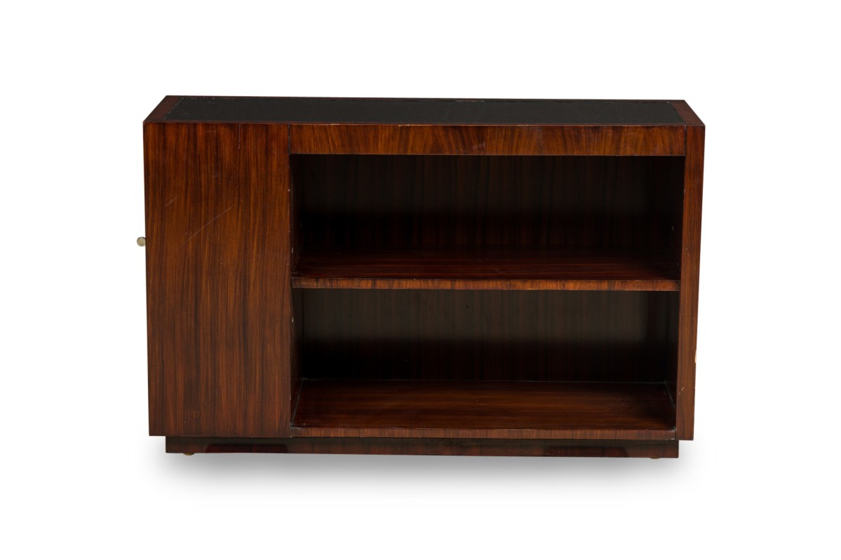 2 Art Deco style Mid-Century American ebony de macassar cabinets featuring an open front storage area with one shelf plus a pullout drawer and compartment on the left side. One cabinet has an inlaid glass top. (PRICED EACH)