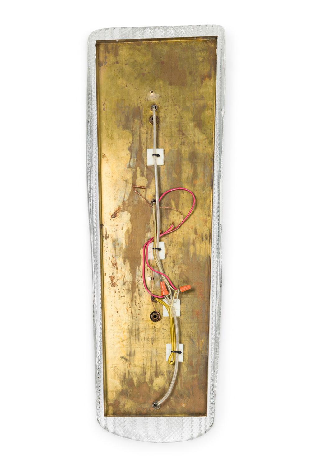 PAIR of Italian Mid-Century textured glass wall sconces having four bulbs in each with a patinated brass base and iconic venetian textured glasswork in an elongated form (PRICED AS PAIR)