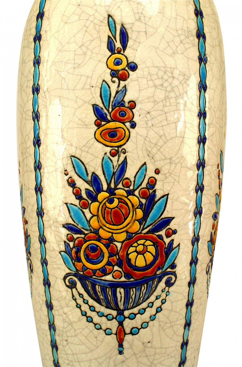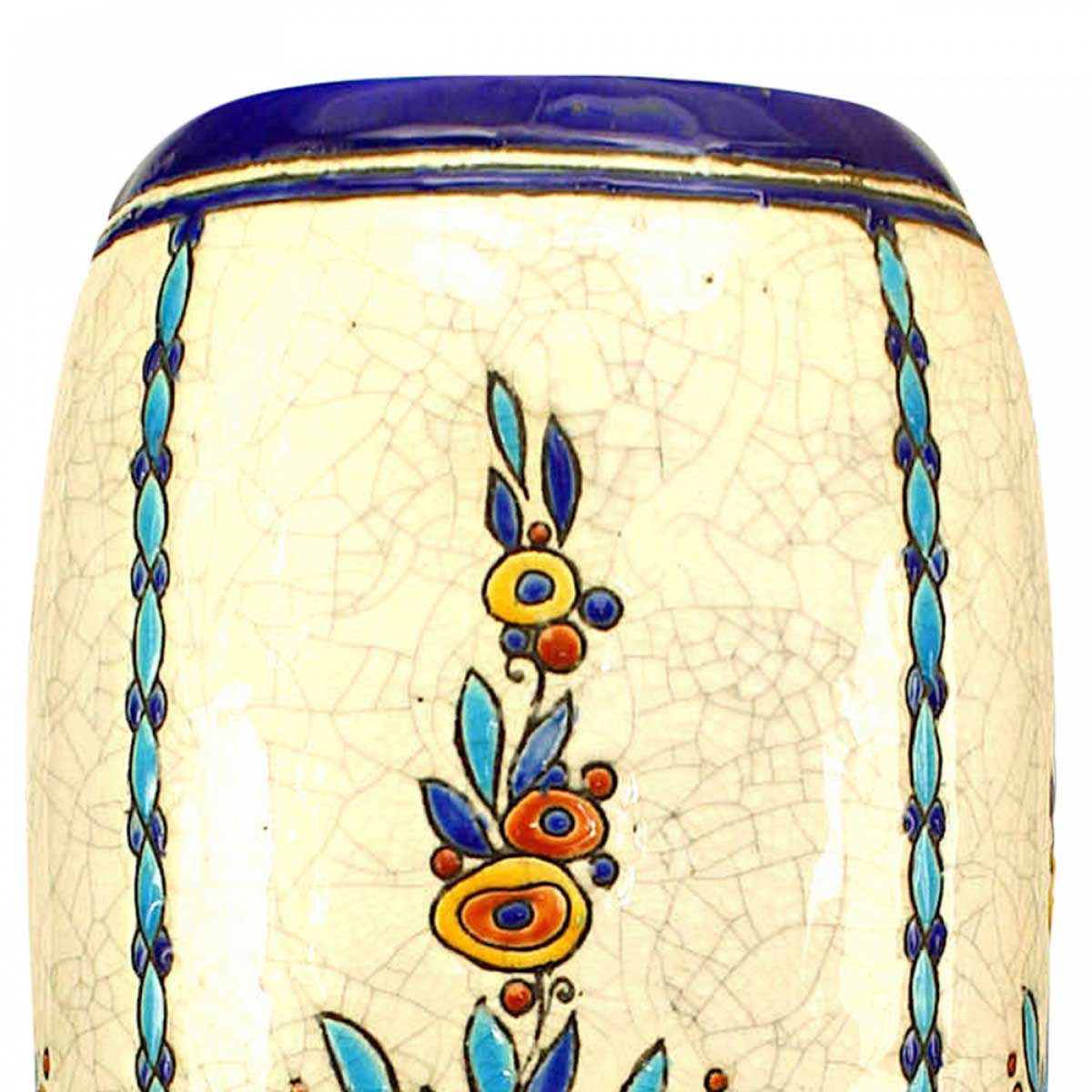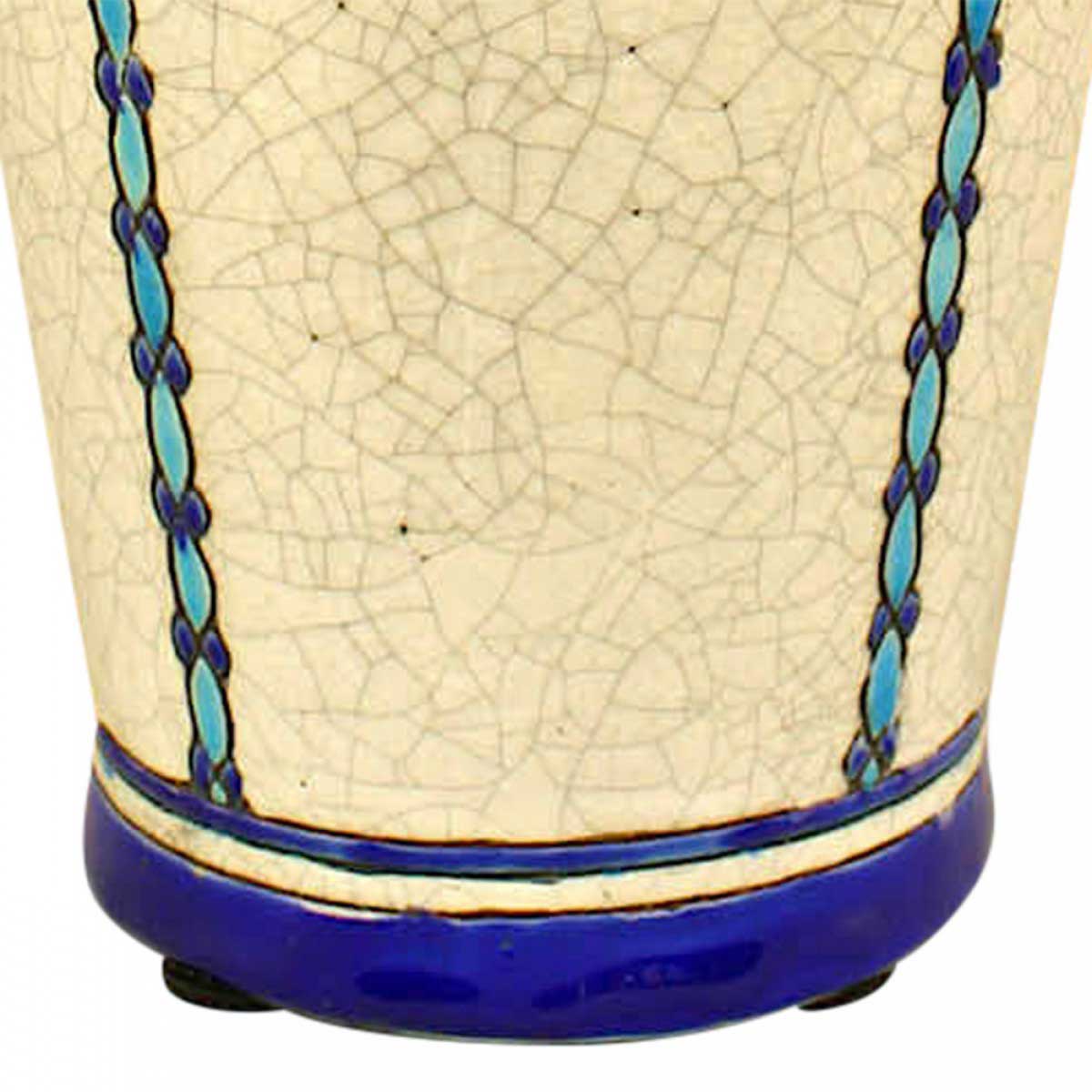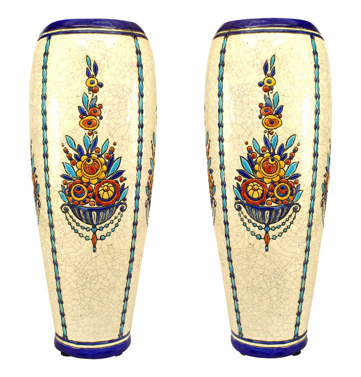 PAIR of Art Deco (Belgian) crackled earthenware vases with blue floral motif (stamped Boch Frs/La Louviere, #D944) (PRICED AS PAIR)