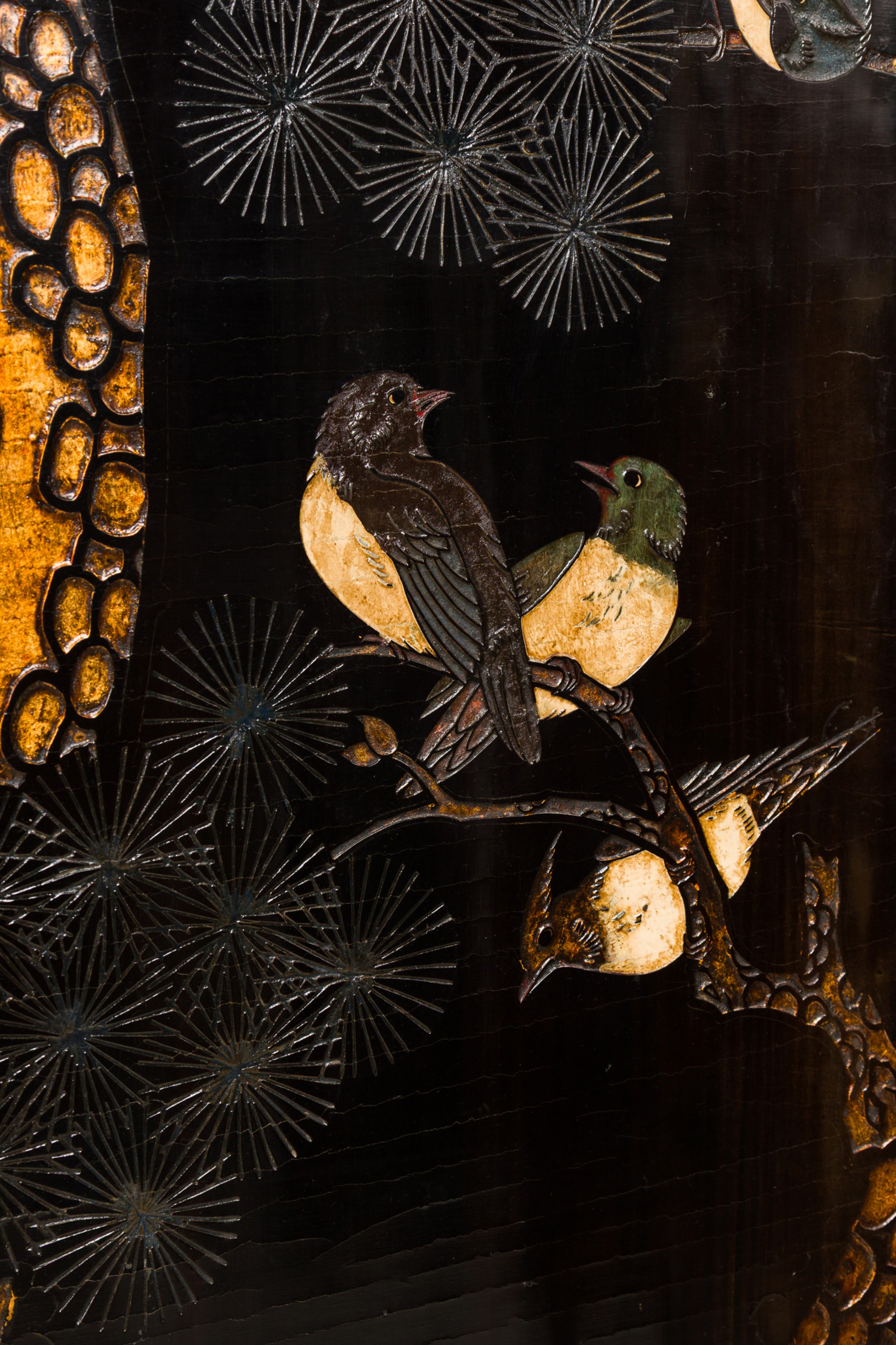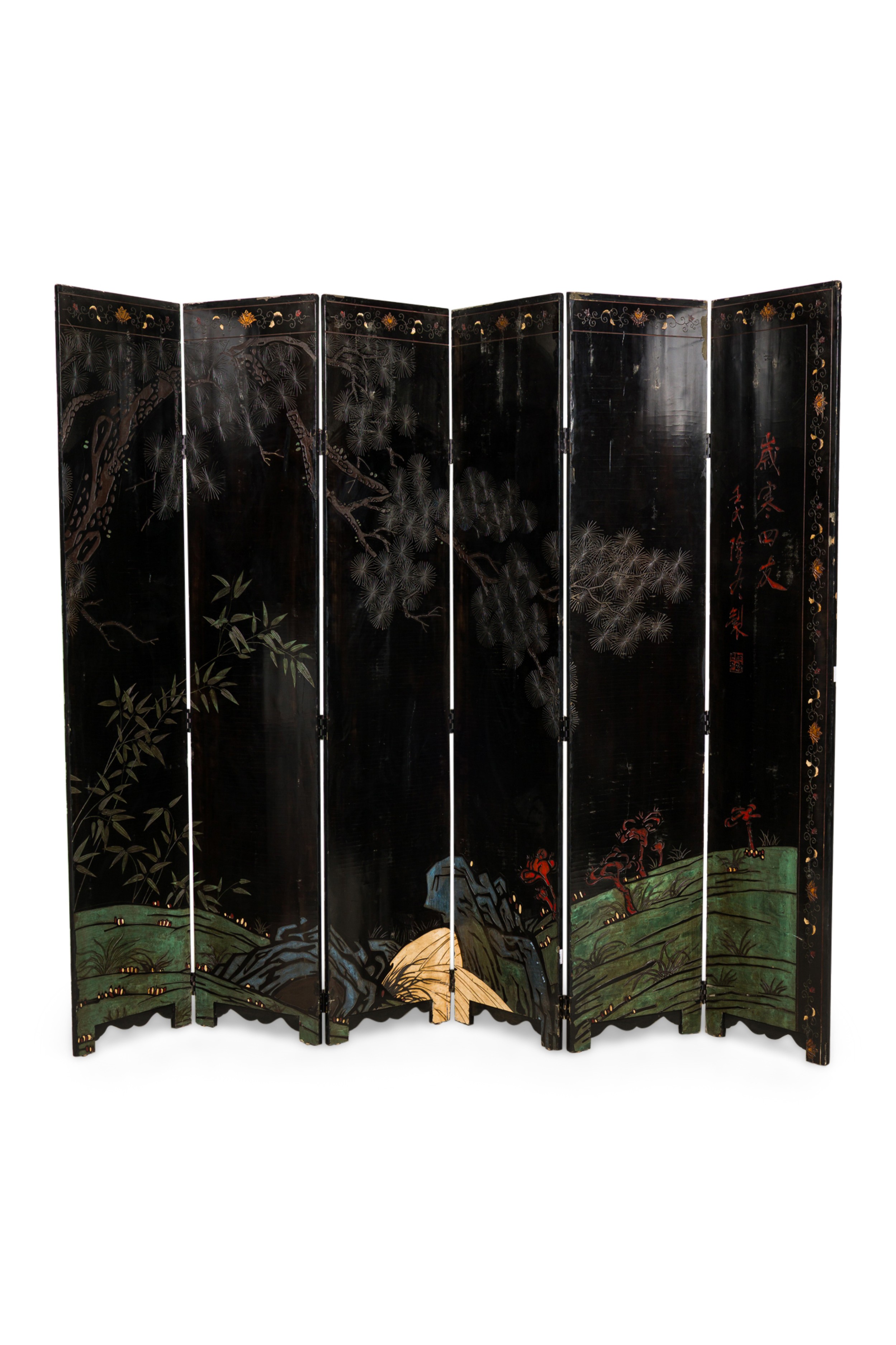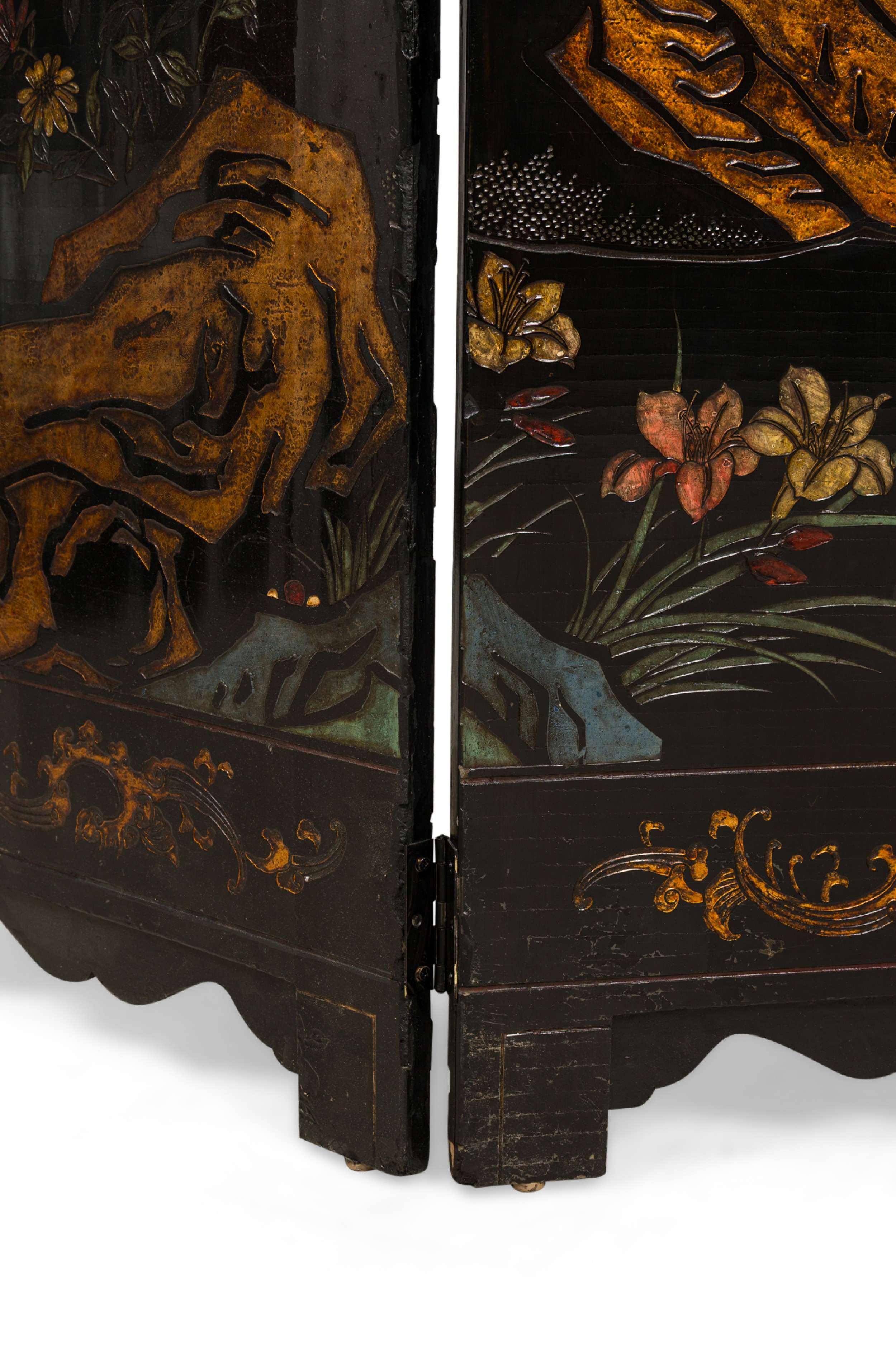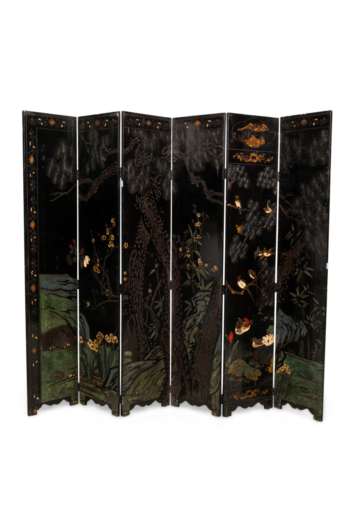 2 Chinese 6-paneled folding black lacquered screens having gilt and decorative painted figural variety of perched birds on branches, pine, insects, prunus, flowers, reeded marshland and calligraphy with a scroll & foliate border (PRICED EACH)