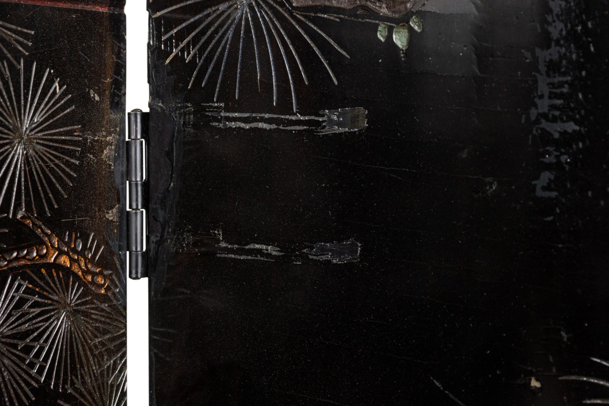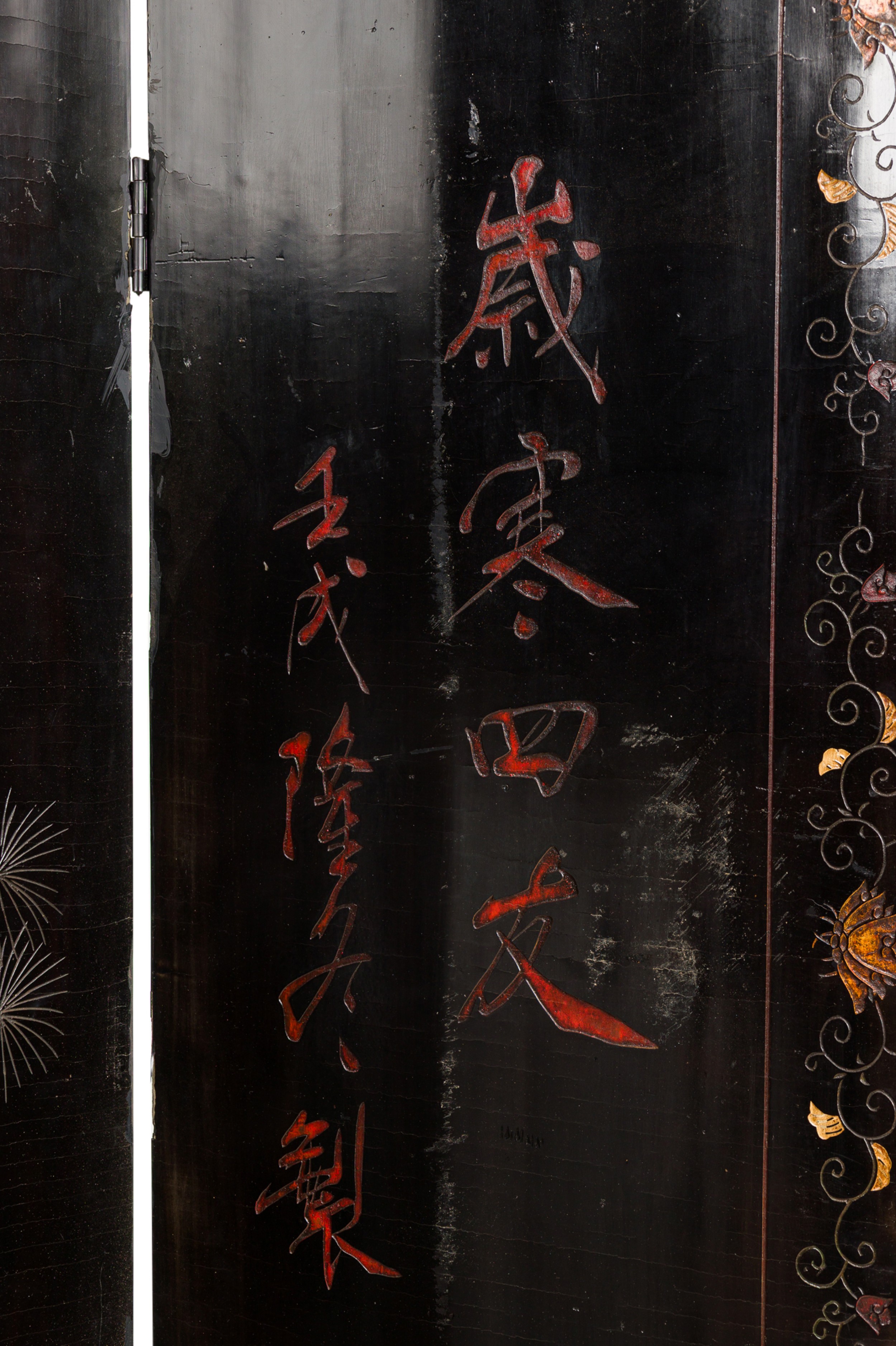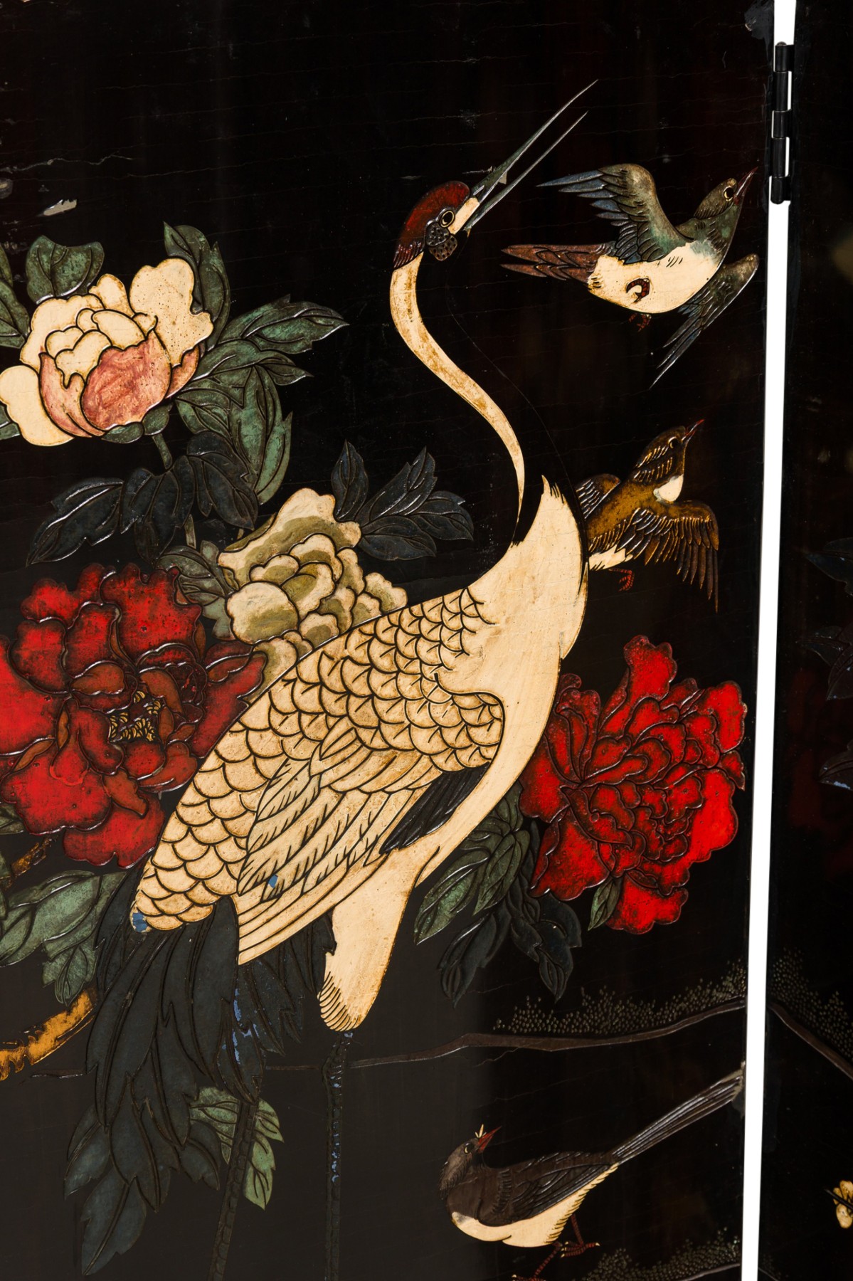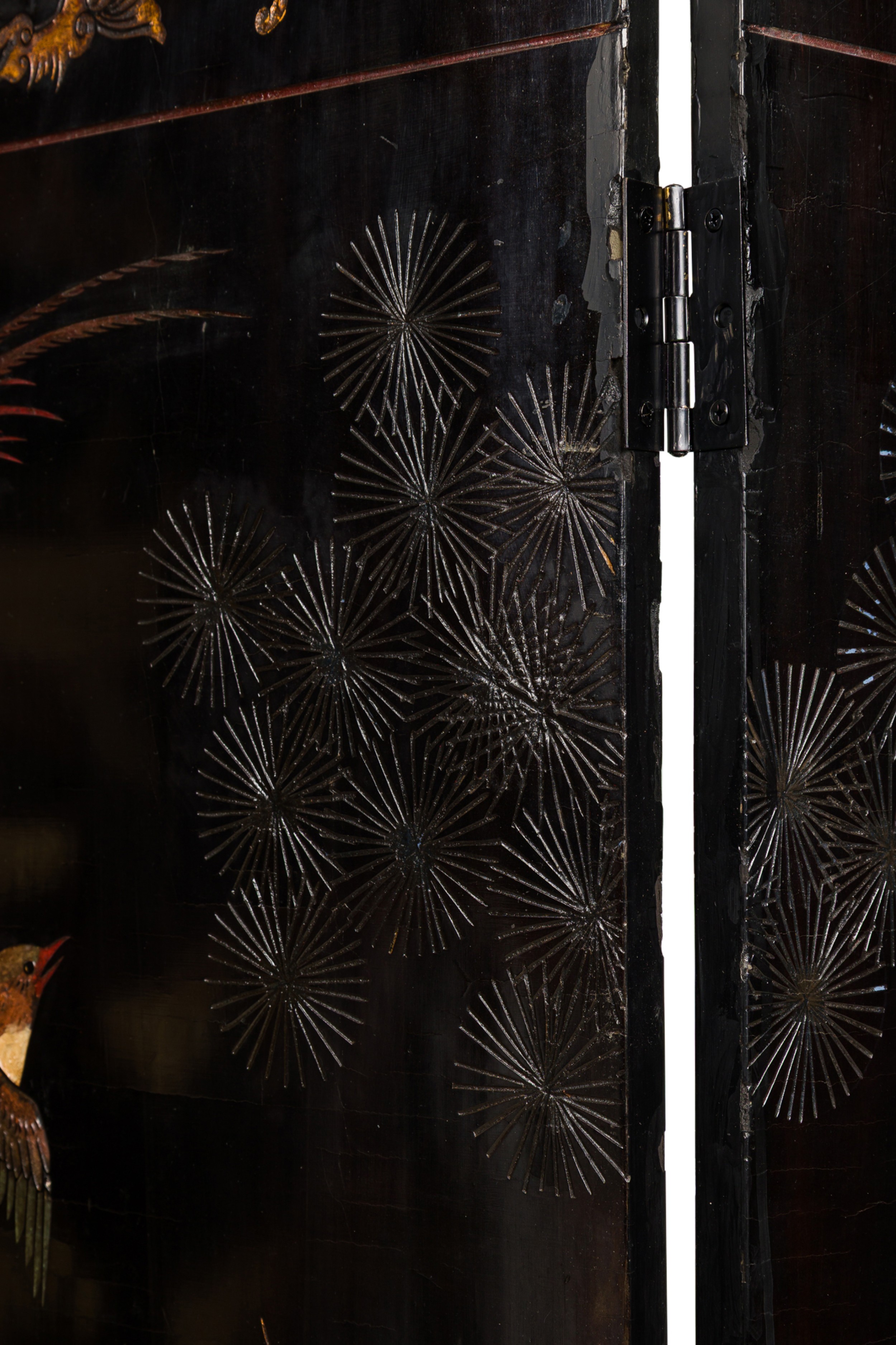 2 Chinese 6-paneled folding black lacquered screens having gilt and decorative painted figural variety of perched birds on branches, pine, insects, prunus, flowers, reeded marshland and calligraphy with a scroll & foliate border (PRICED EACH)