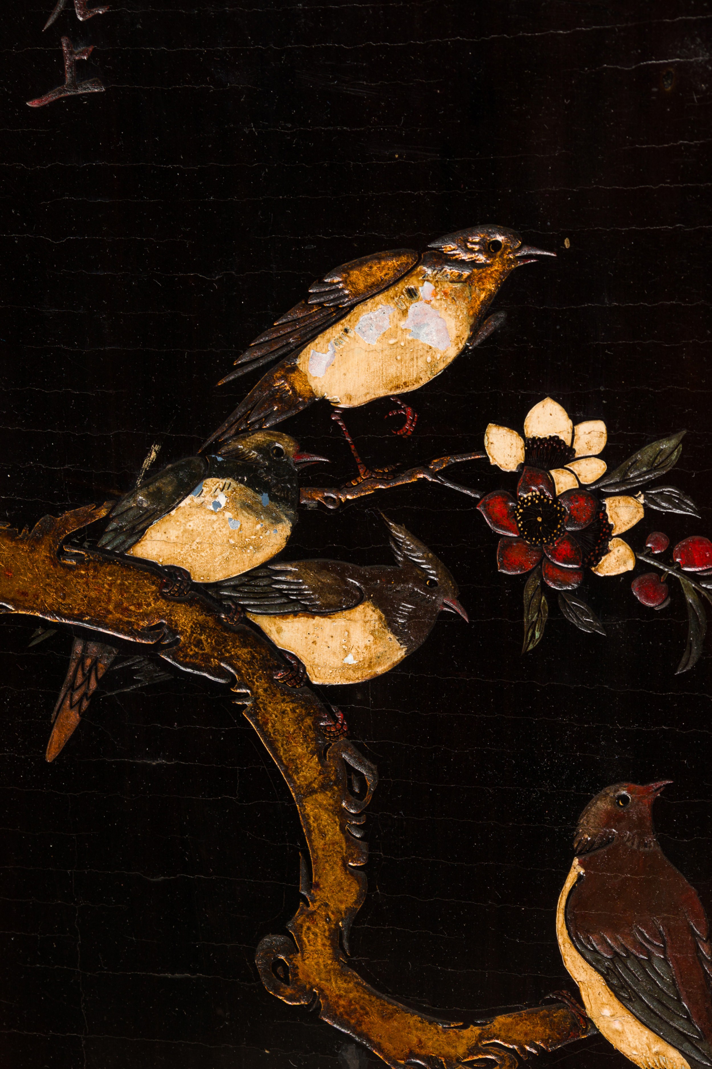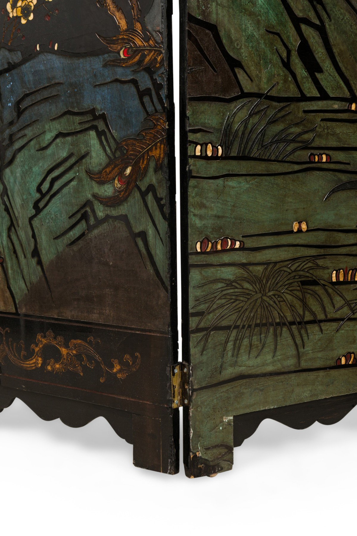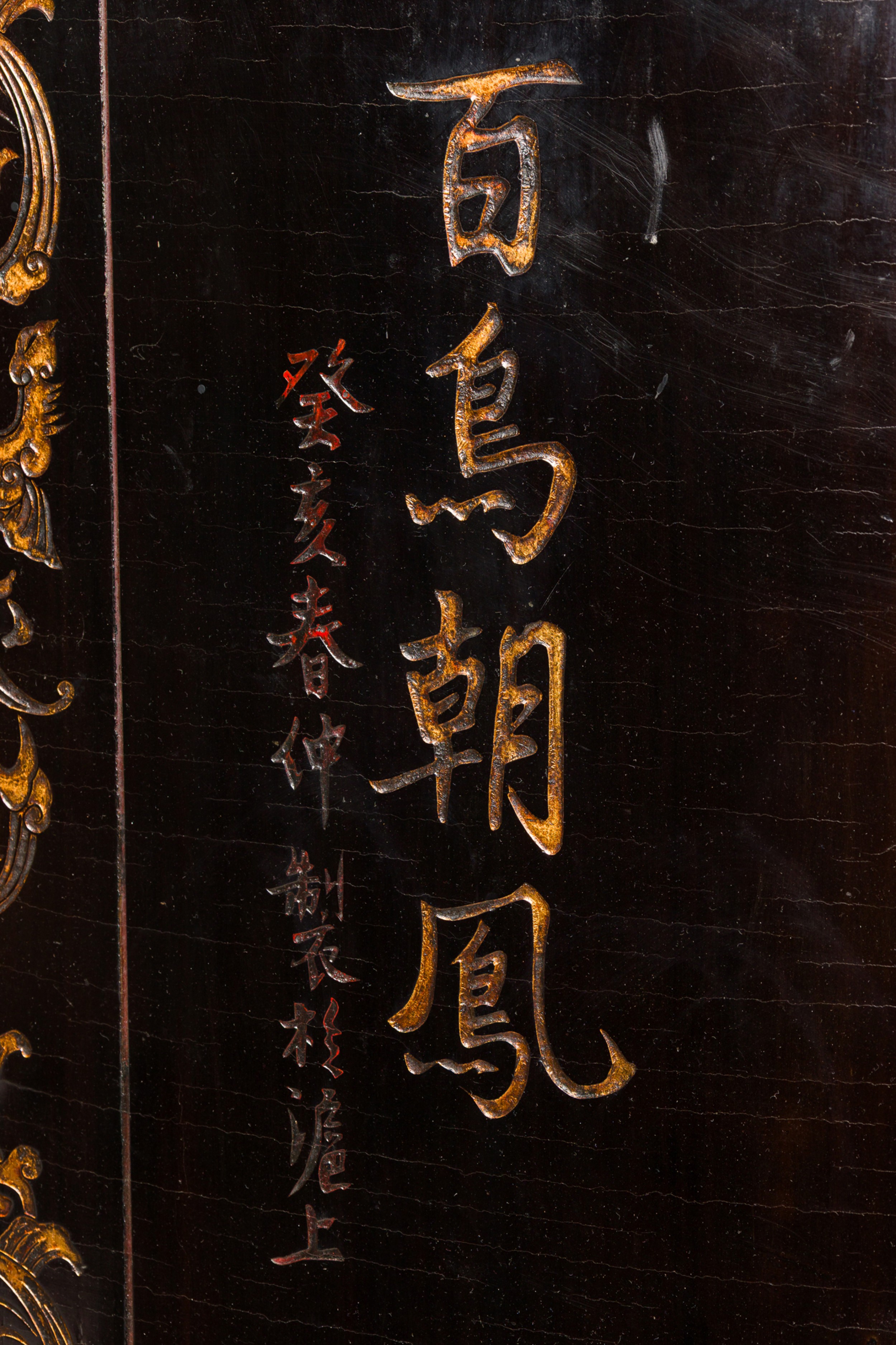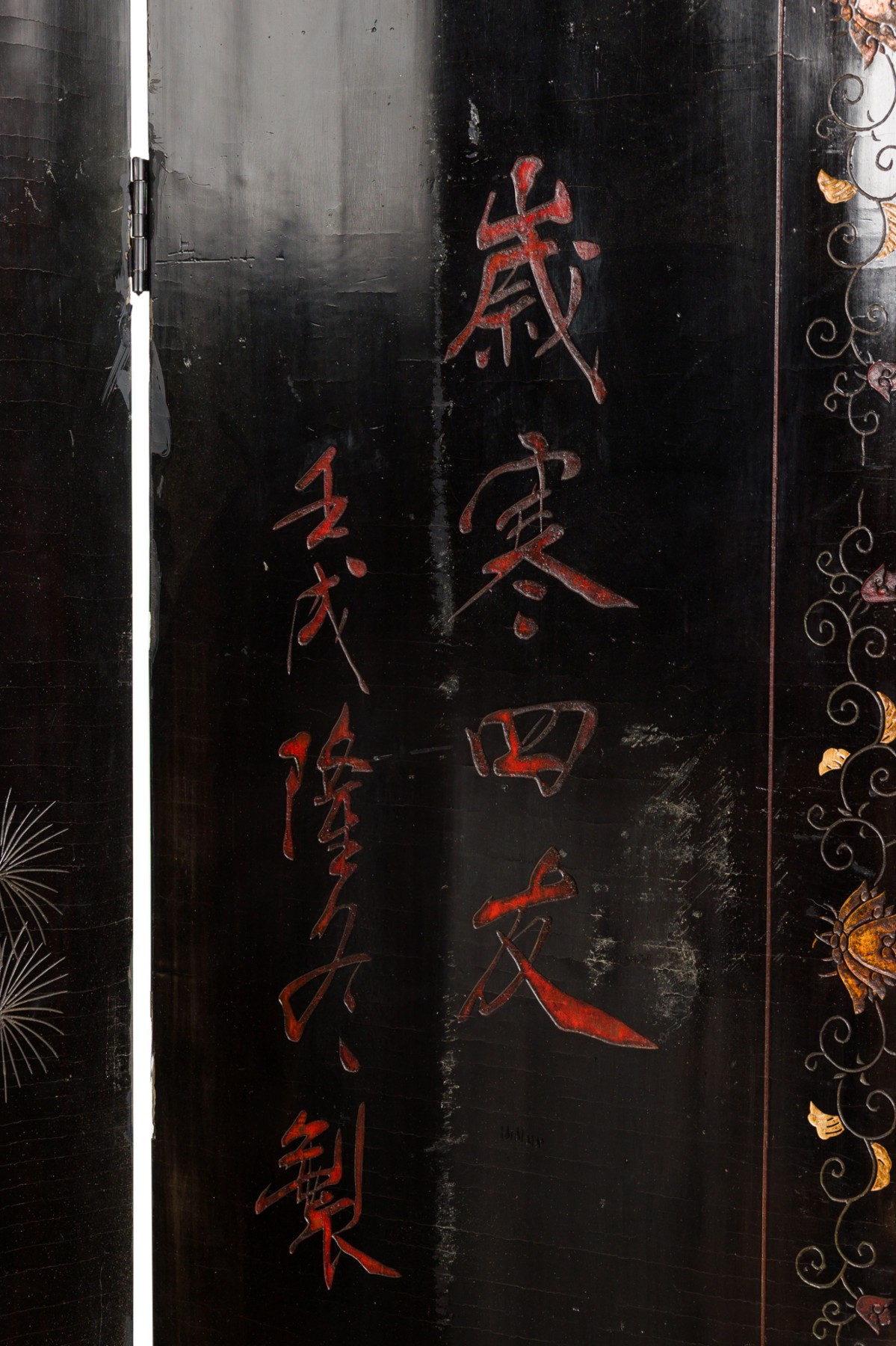 2 Chinese 6-paneled folding black lacquered screens having gilt and decorative painted figural variety of perched birds on branches, pine, insects, prunus, flowers, reeded marshland and calligraphy with a scroll & foliate border (PRICED EACH)