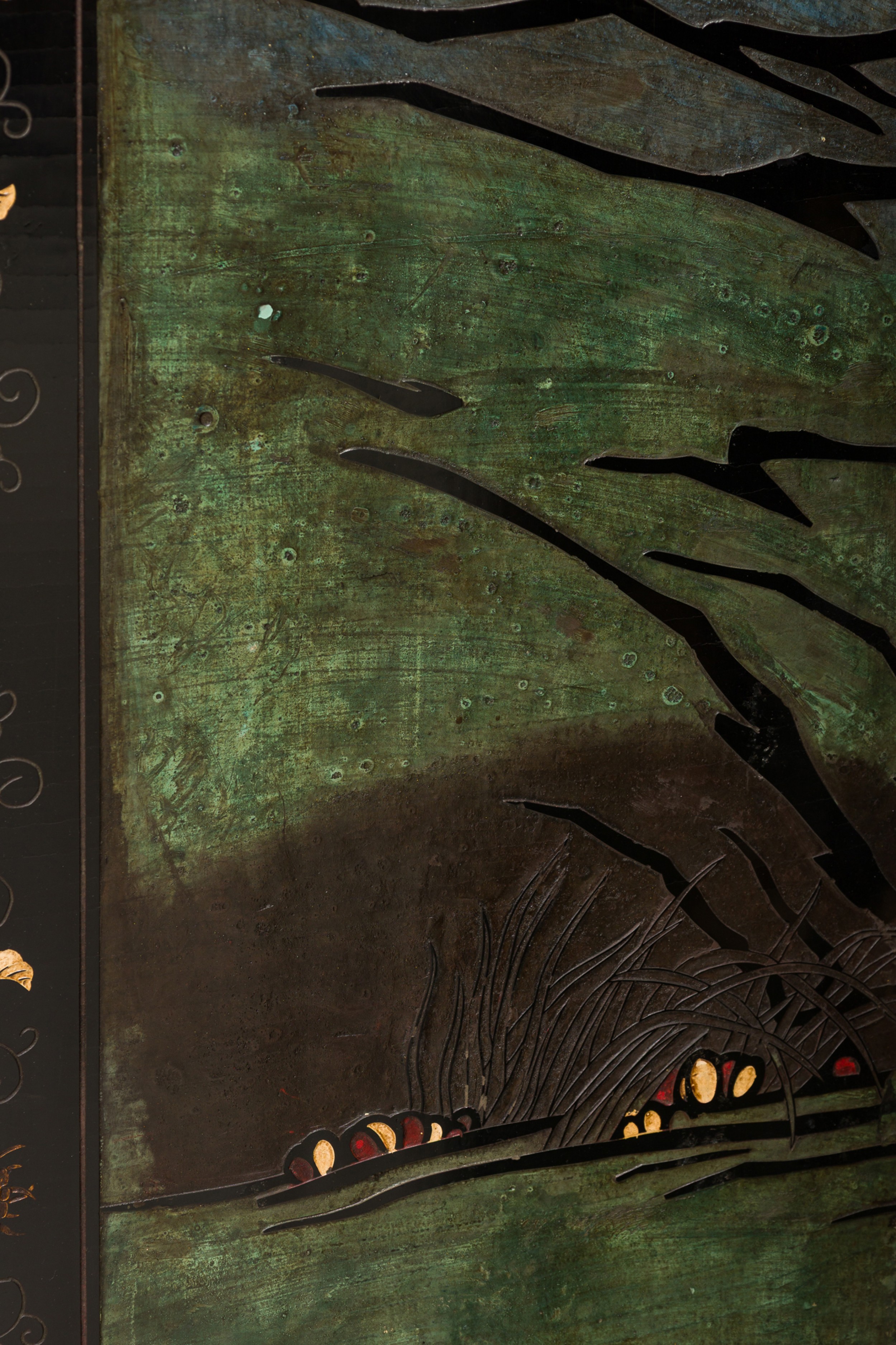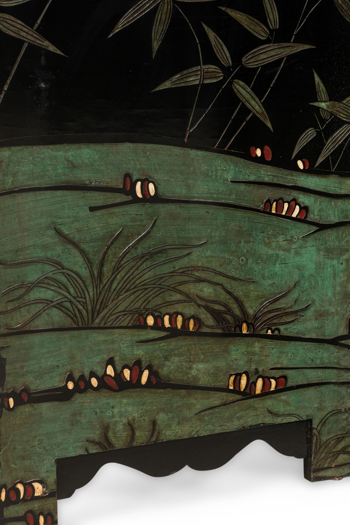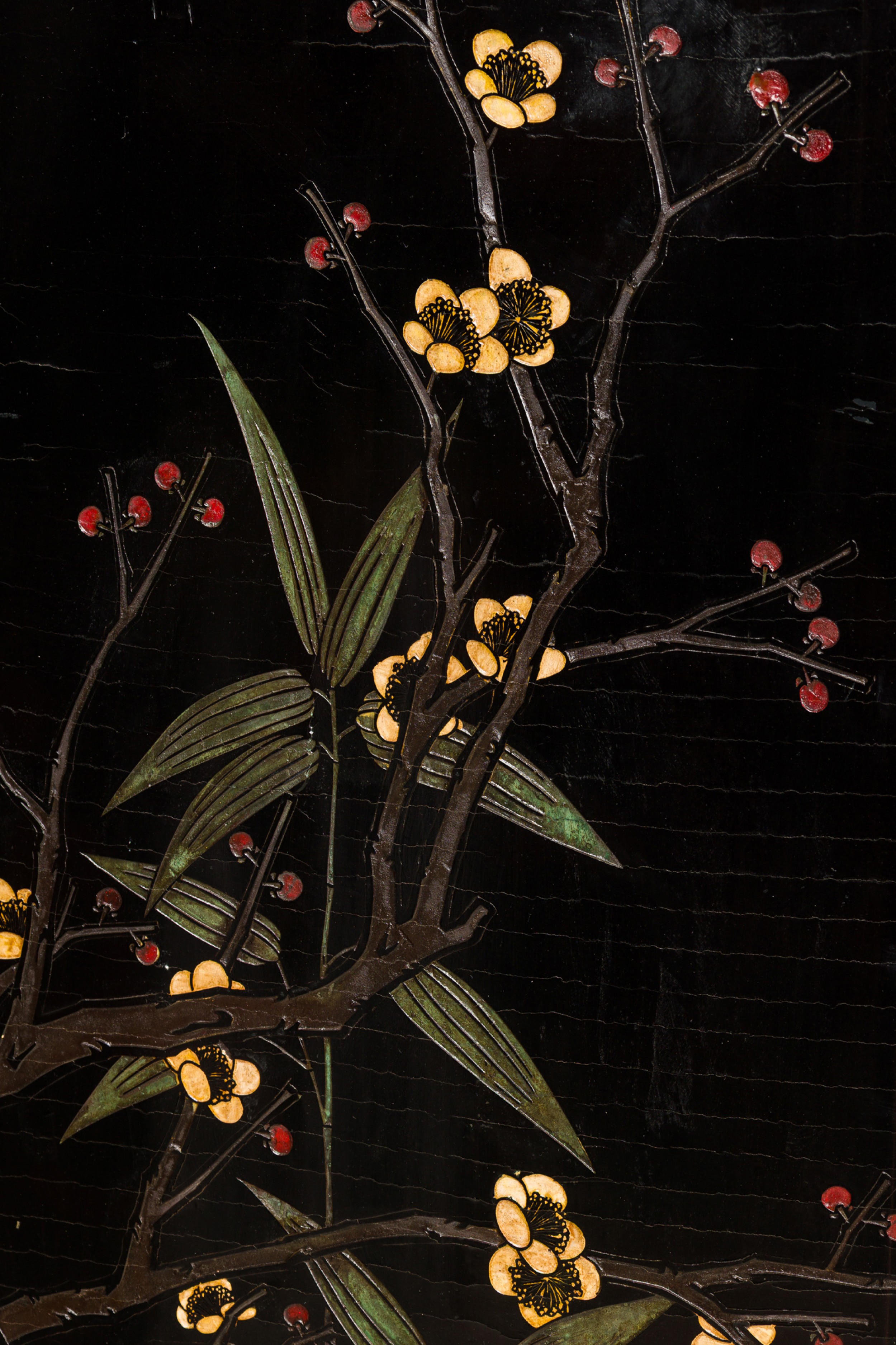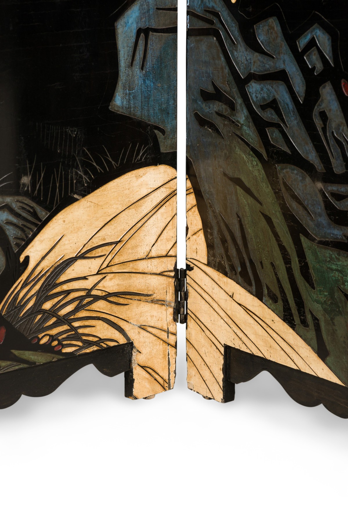 2 Chinese 6-paneled folding black lacquered screens having gilt and decorative painted figural variety of perched birds on branches, pine, insects, prunus, flowers, reeded marshland and calligraphy with a scroll & foliate border (PRICED EACH)