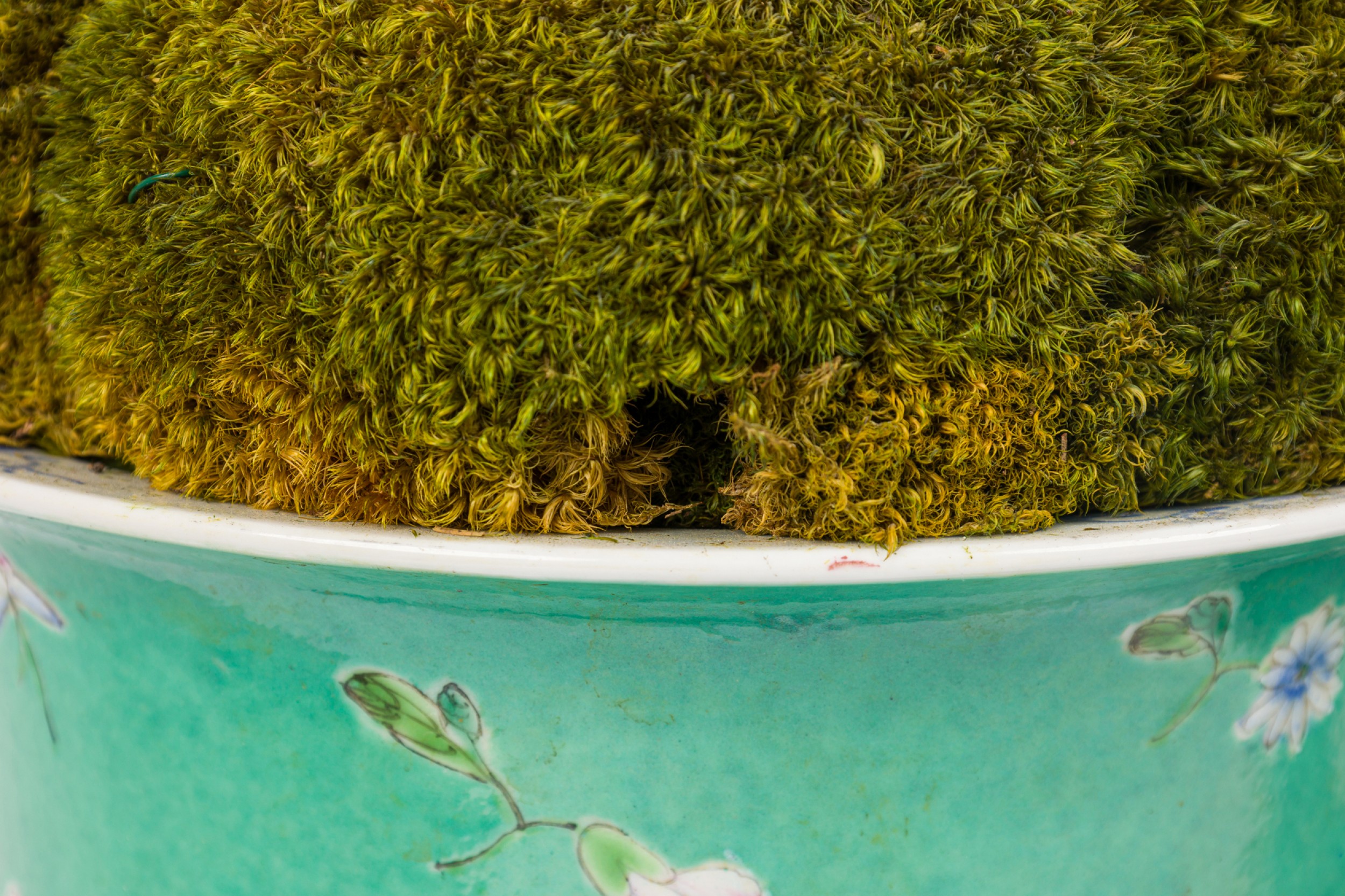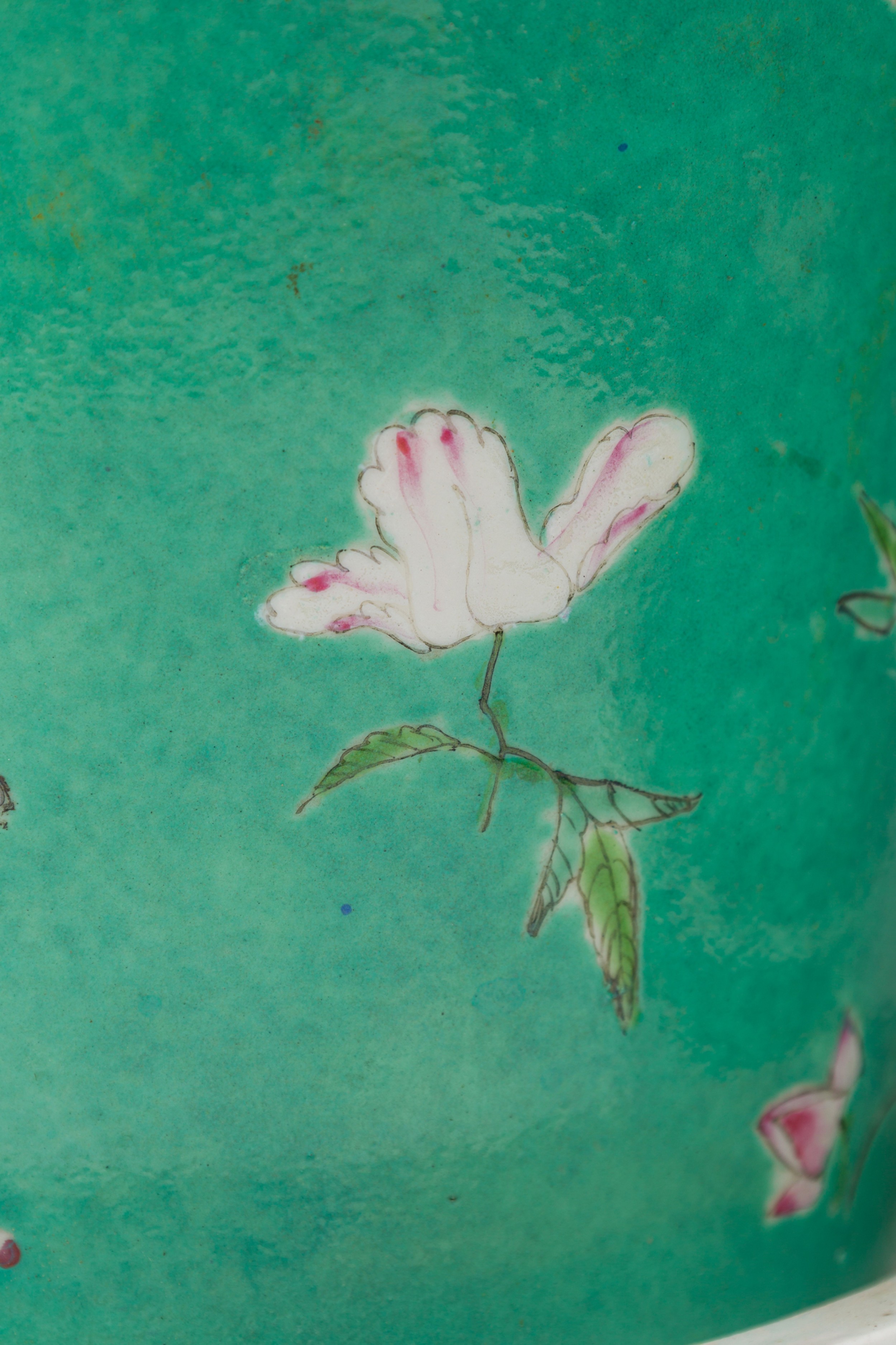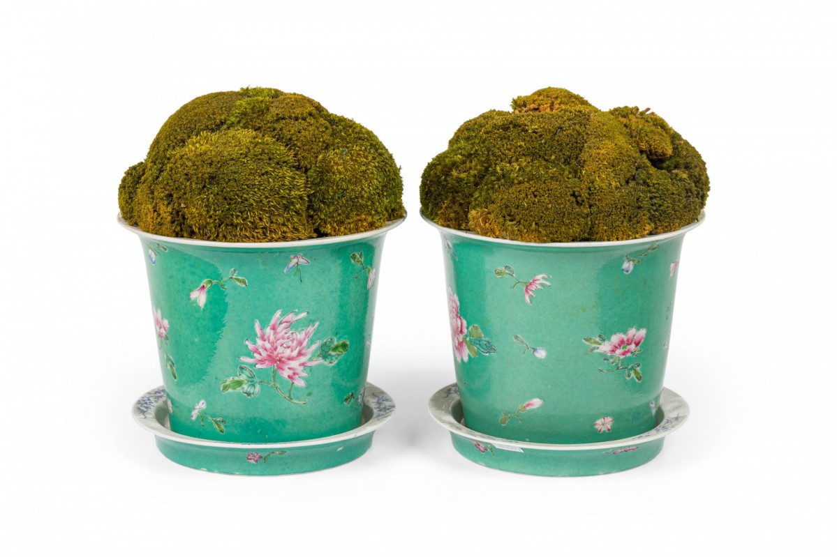 2 Chinese porcelain tapered cylindrical planters / cachepots / jardinieres painted in a famille rose floral pattern over a green ground, sitting on matching plates, Qianlong marks on bottoms, containing dried moss arrangements. (PRICED EACH)