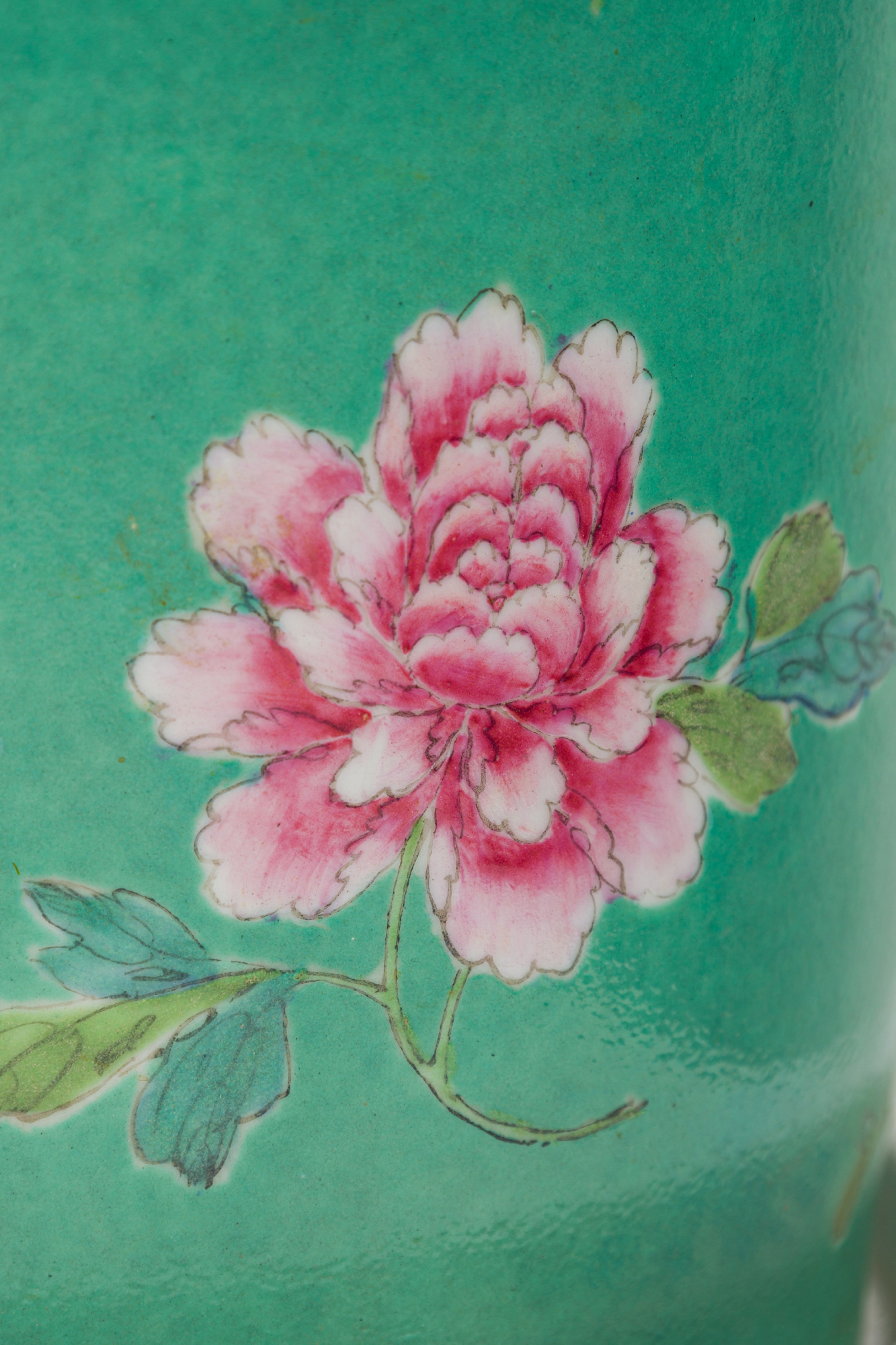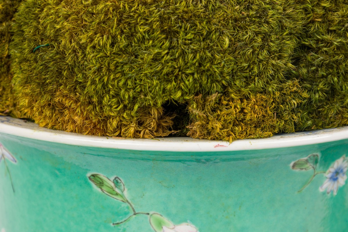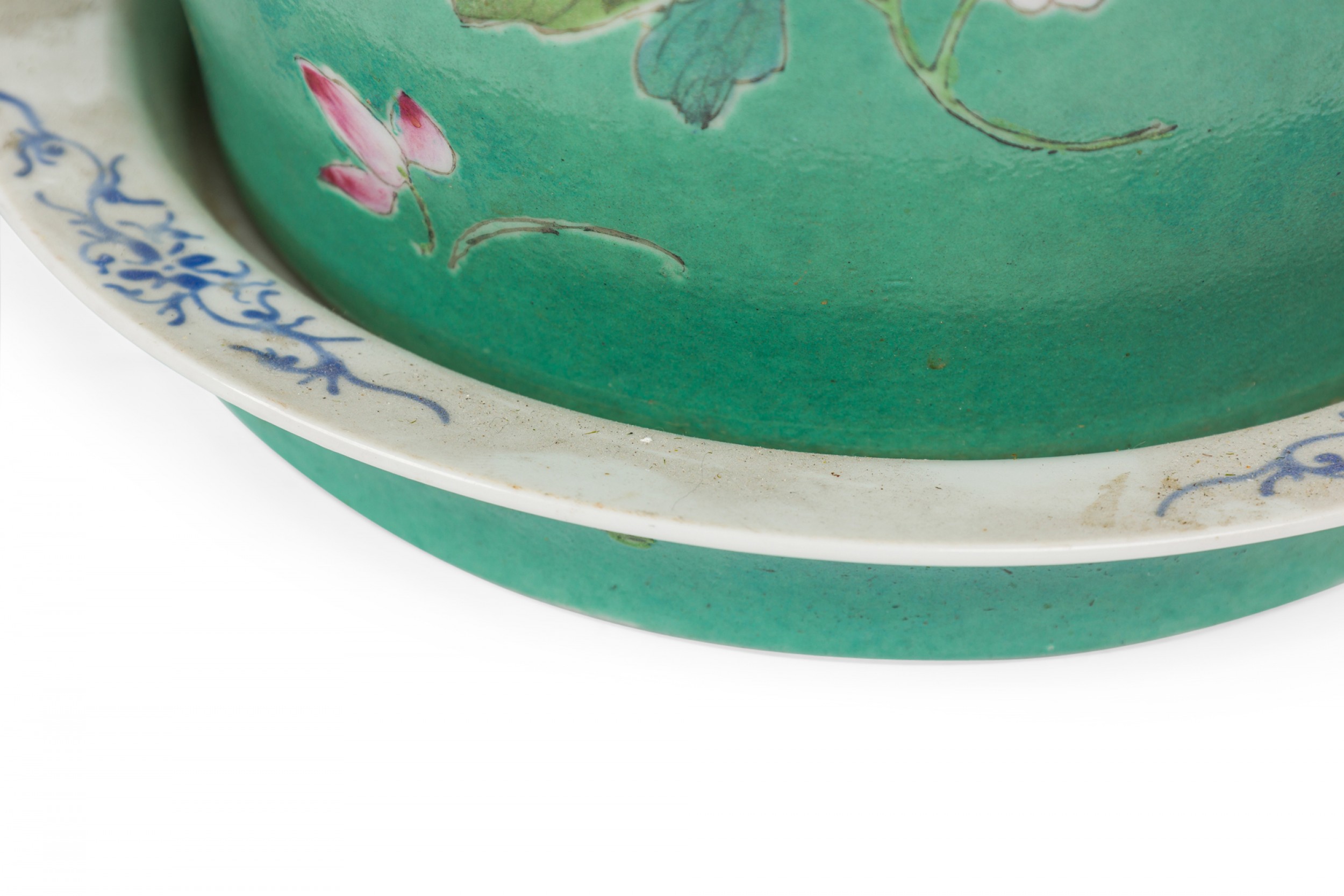 2 Chinese porcelain tapered cylindrical planters / cachepots / jardinieres painted in a famille rose floral pattern over a green ground, sitting on matching plates, Qianlong marks on bottoms, containing dried moss arrangements. (PRICED EACH)