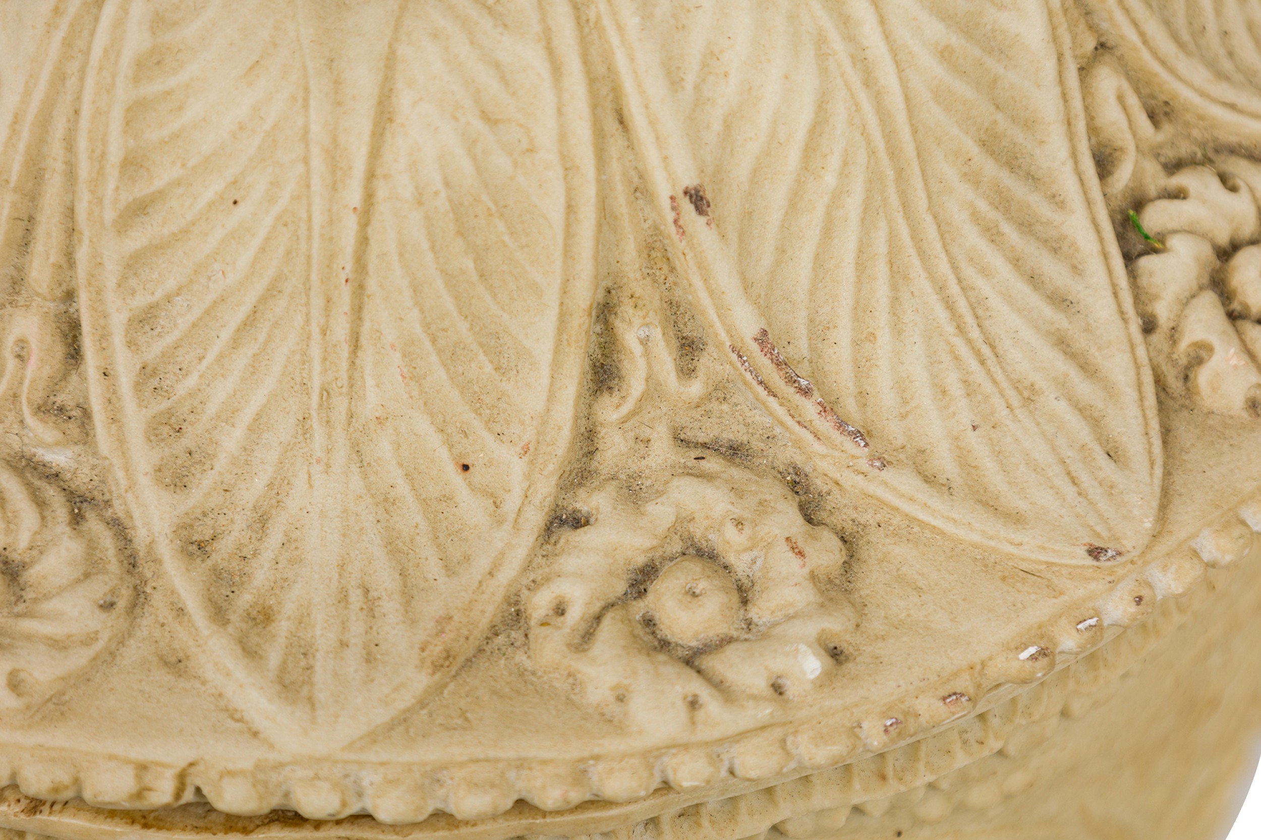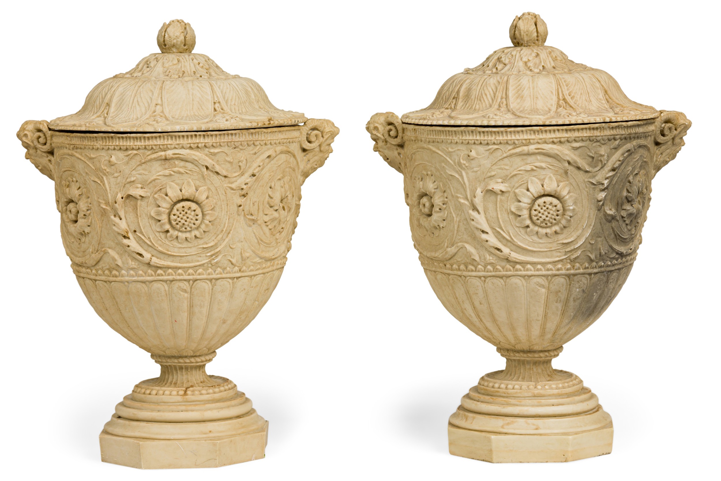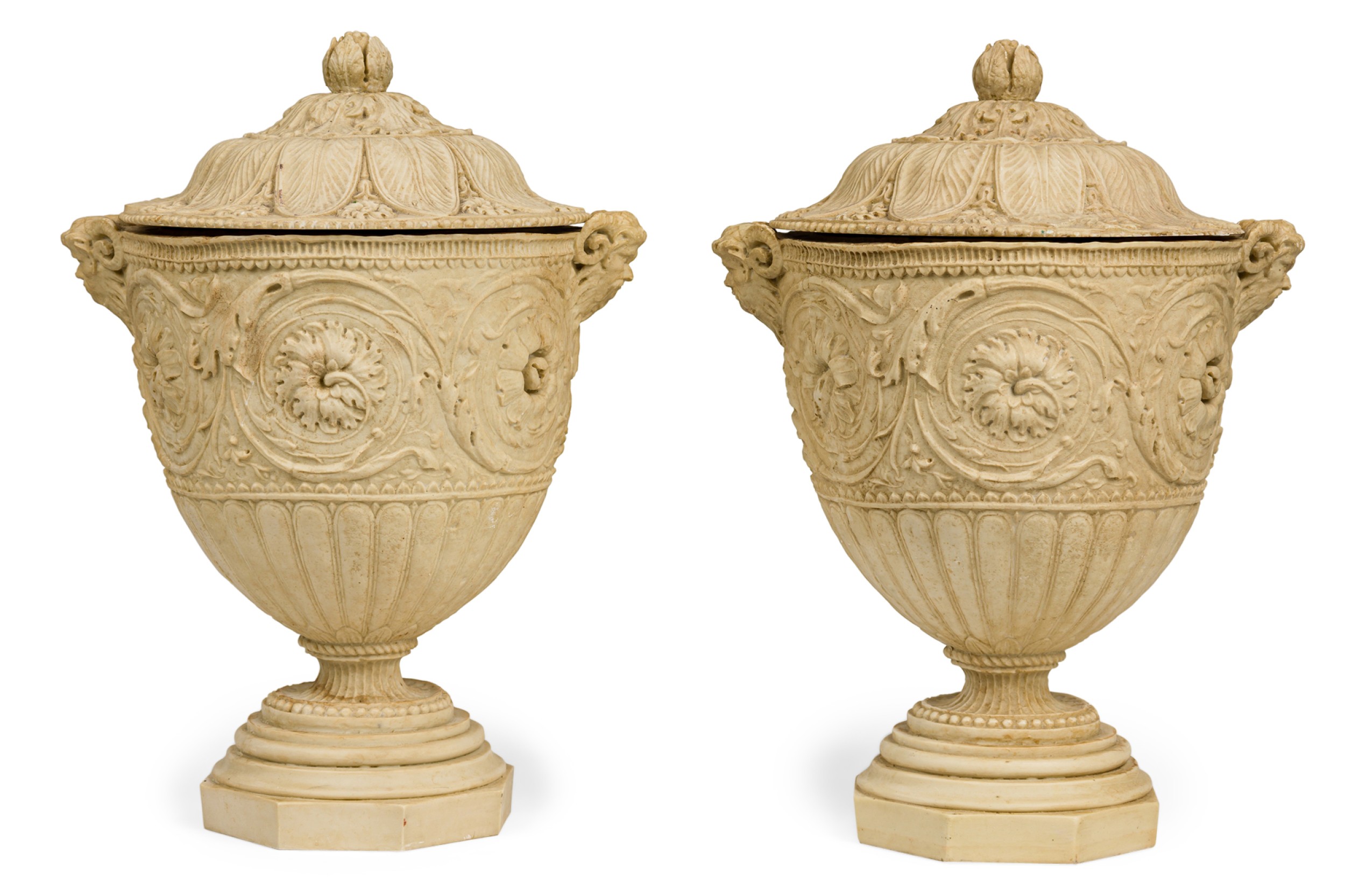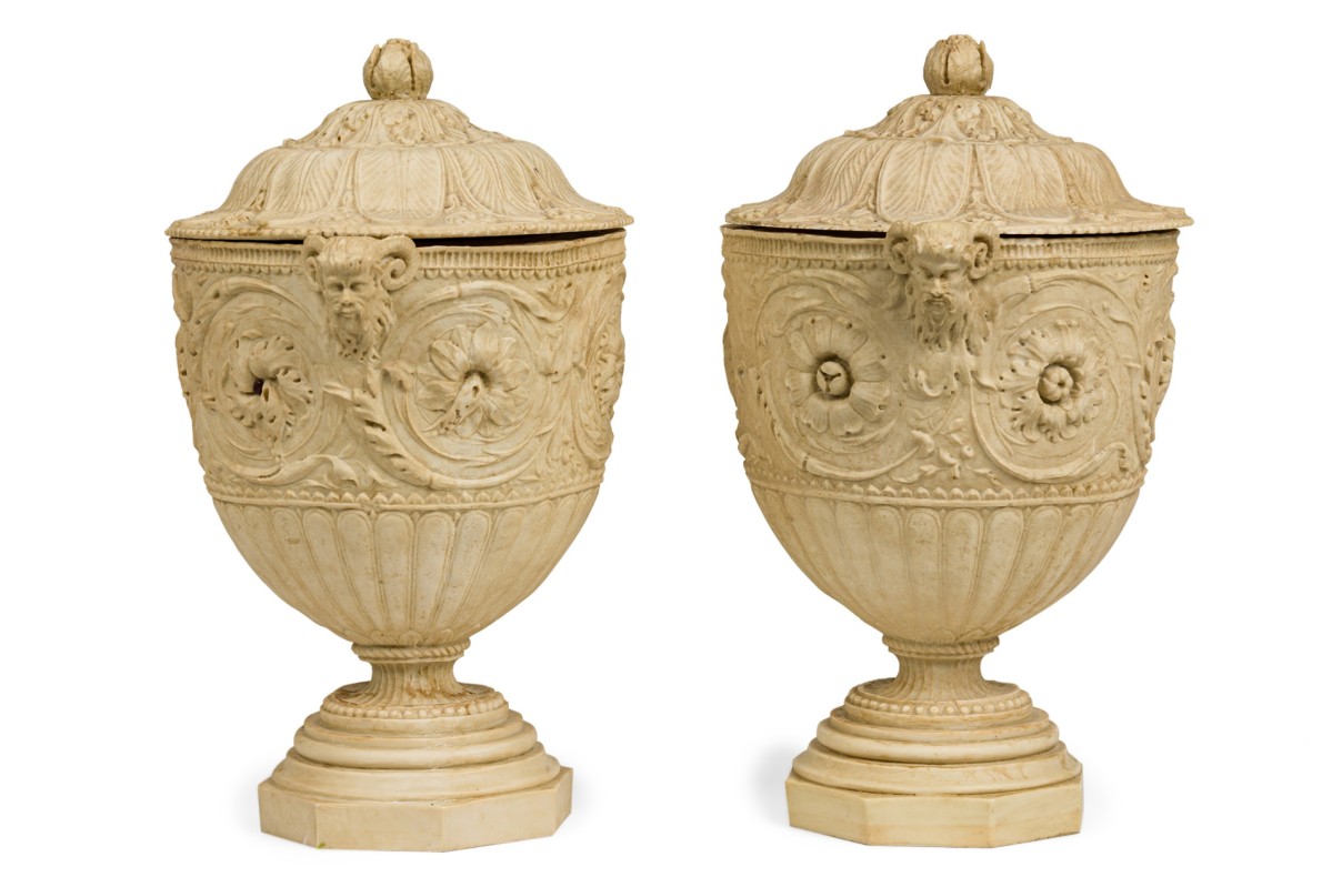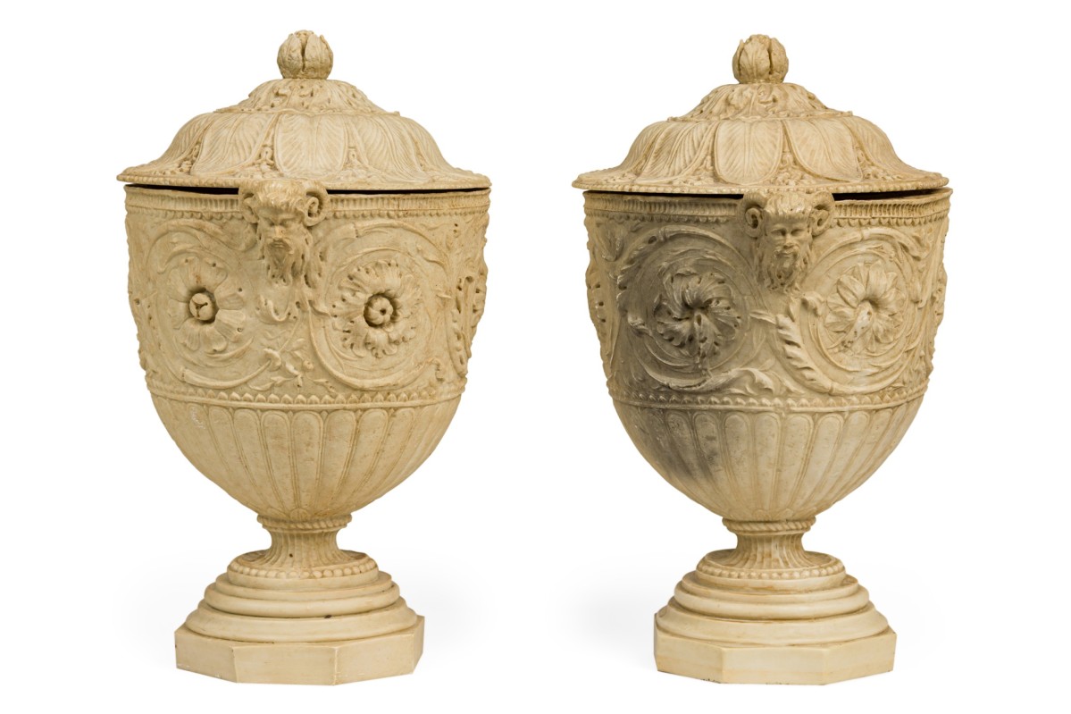 2 Italian Neo-Classic Piranesi style cast composition (possibly Coade stone) small urns / planters featuring low relief adorned with floral and laurel motifs, satyr handles on a round base, crowned by ornamented lids with finials (PRICED EACH)