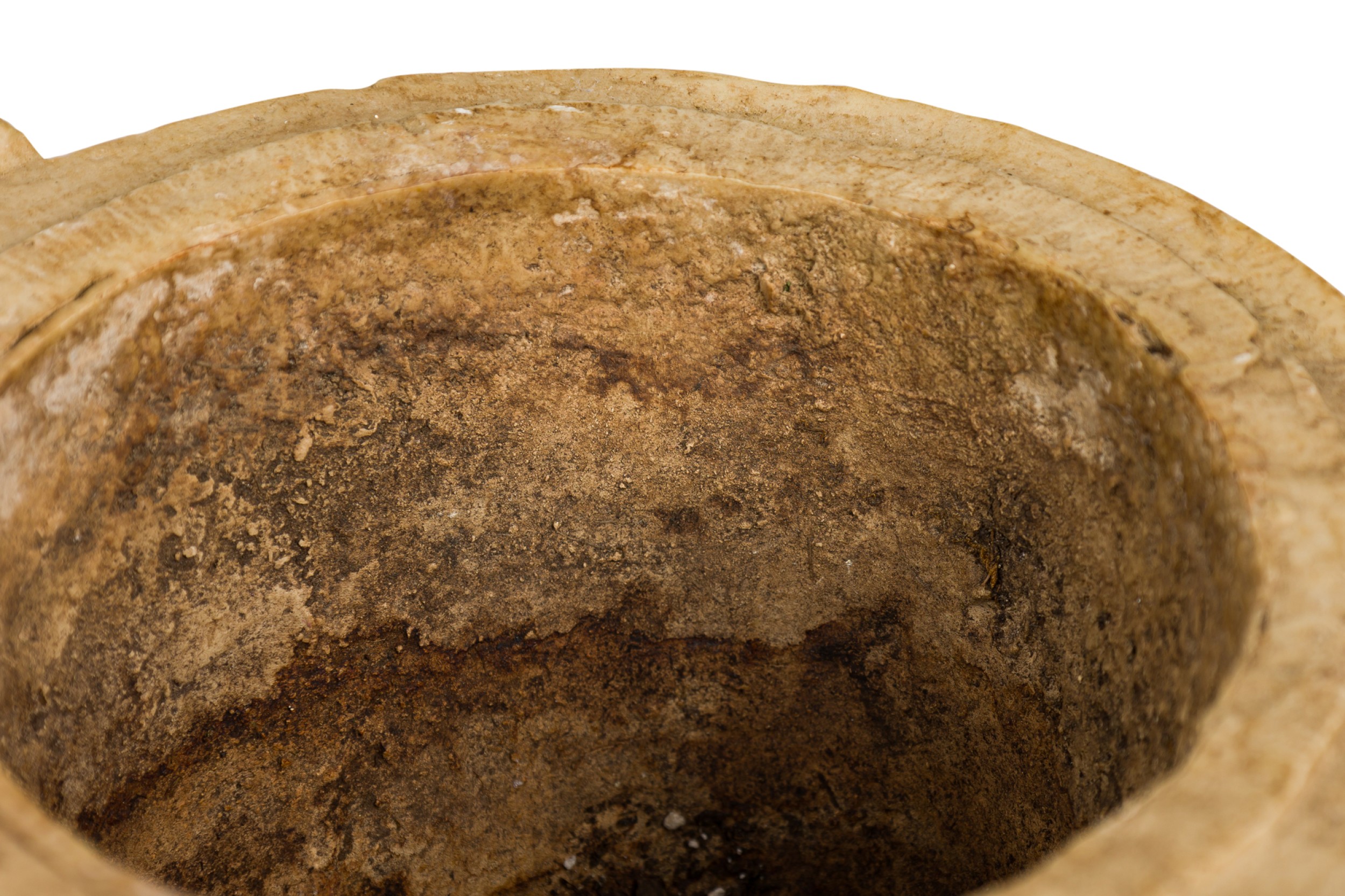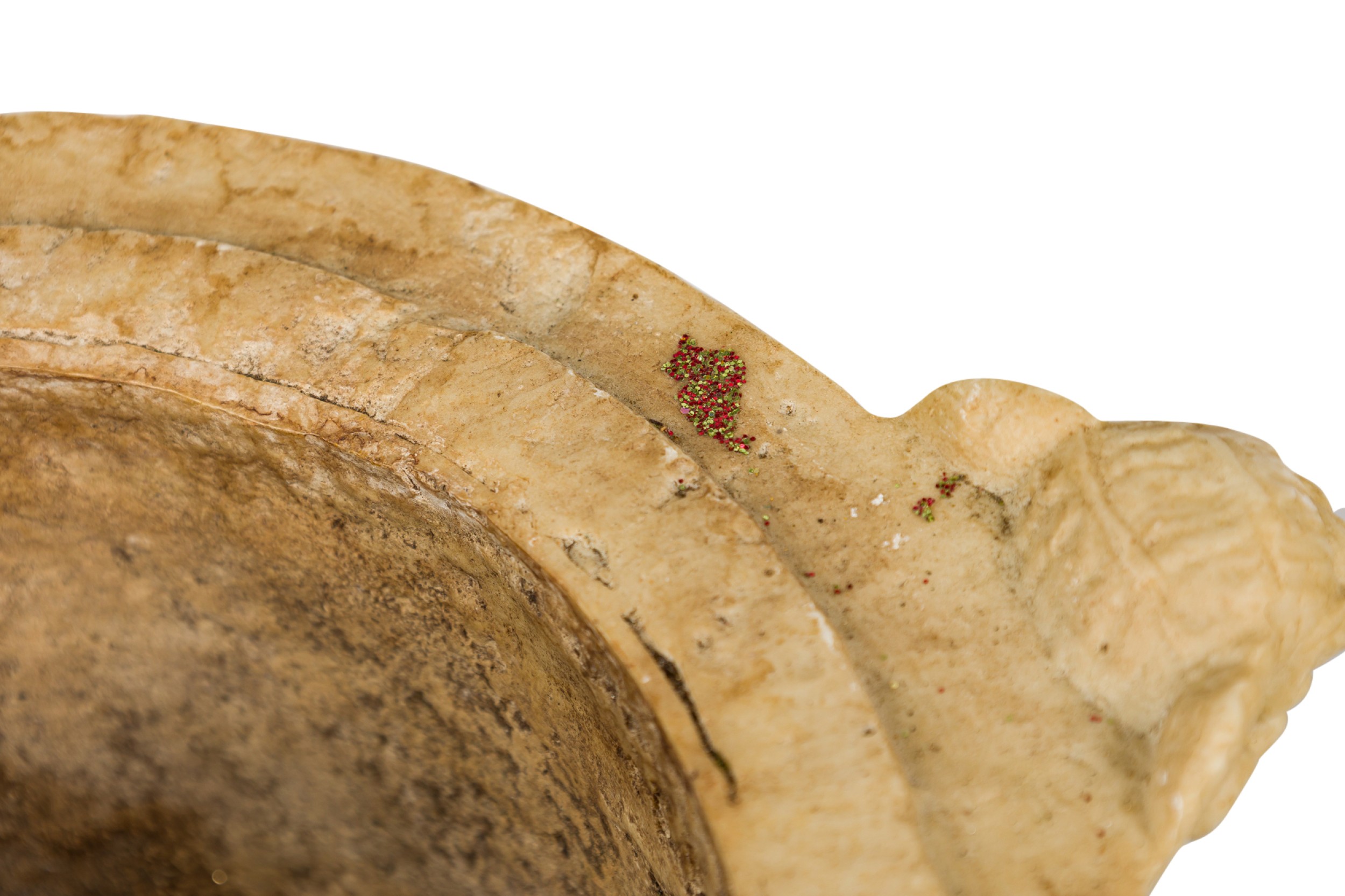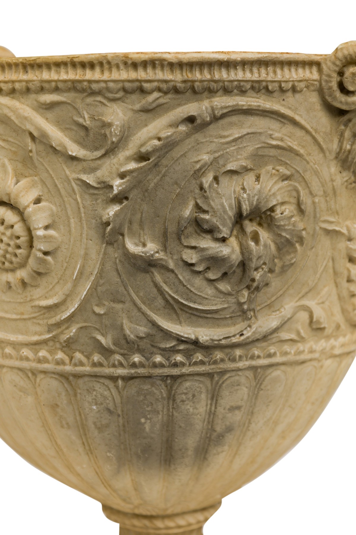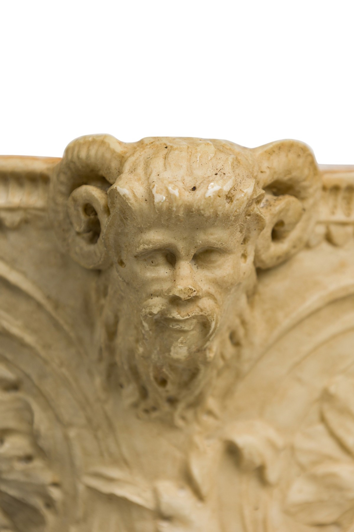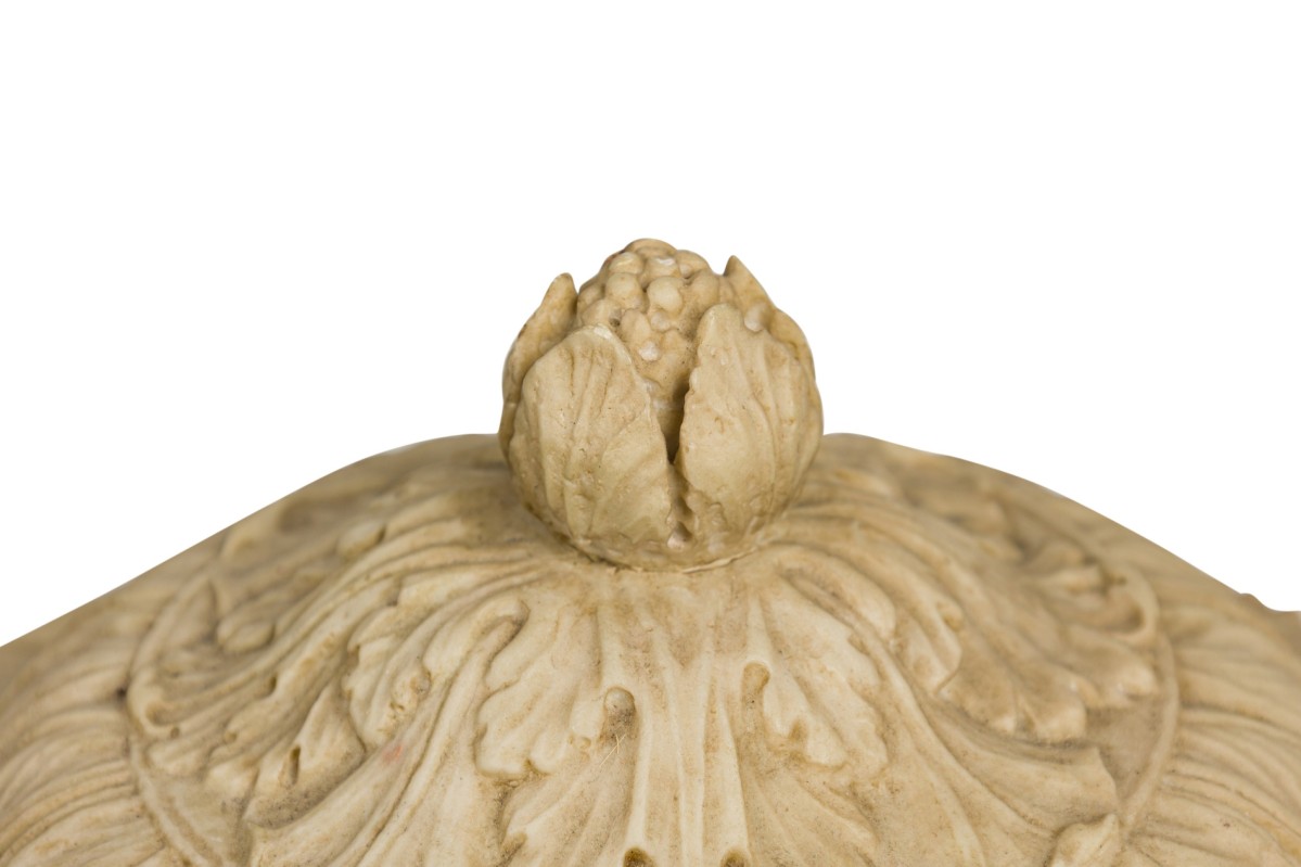 2 Italian Neo-Classic Piranesi style cast composition (possibly Coade stone) small urns / planters featuring low relief adorned with floral and laurel motifs, satyr handles on a round base, crowned by ornamented lids with finials (PRICED EACH)