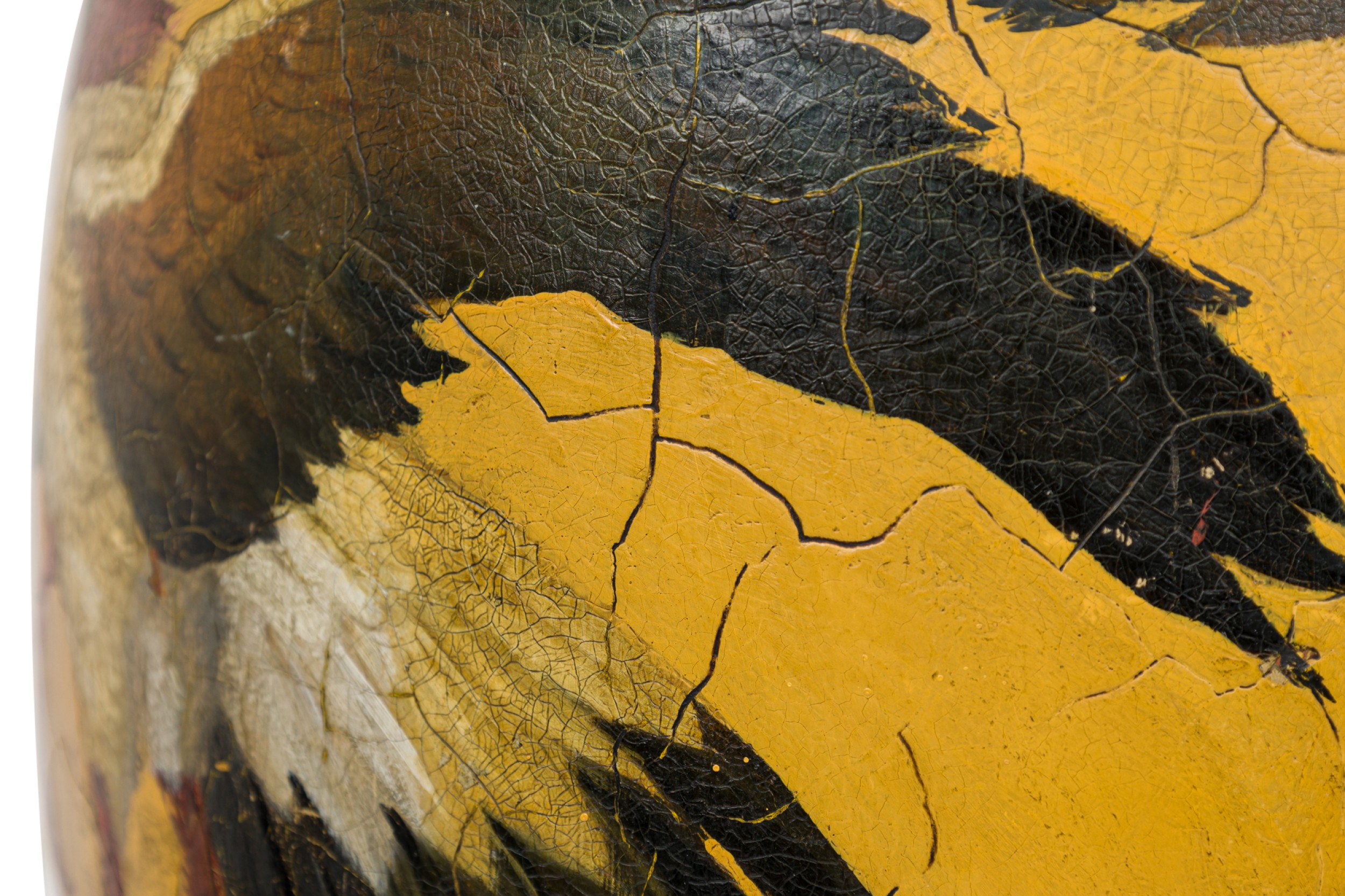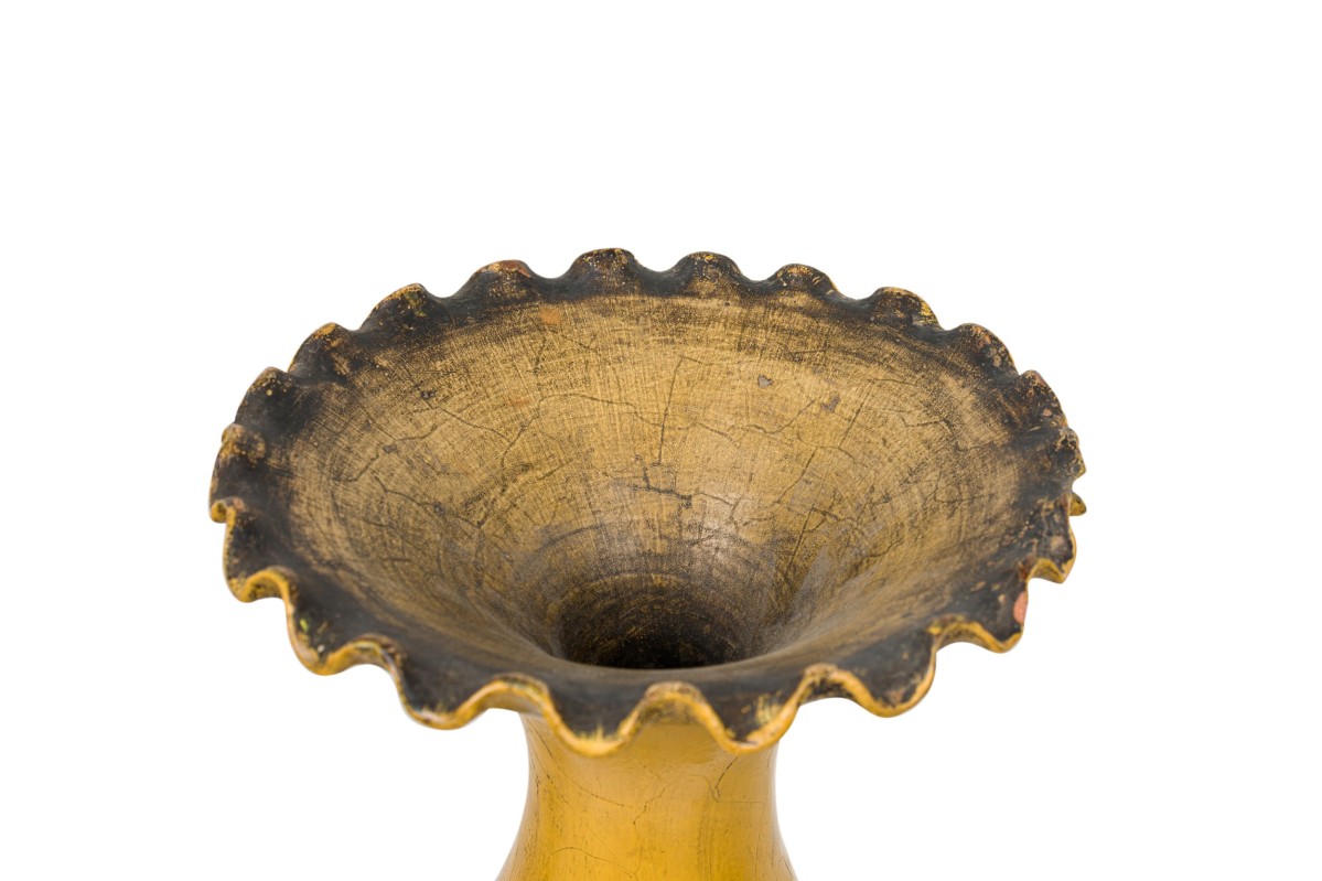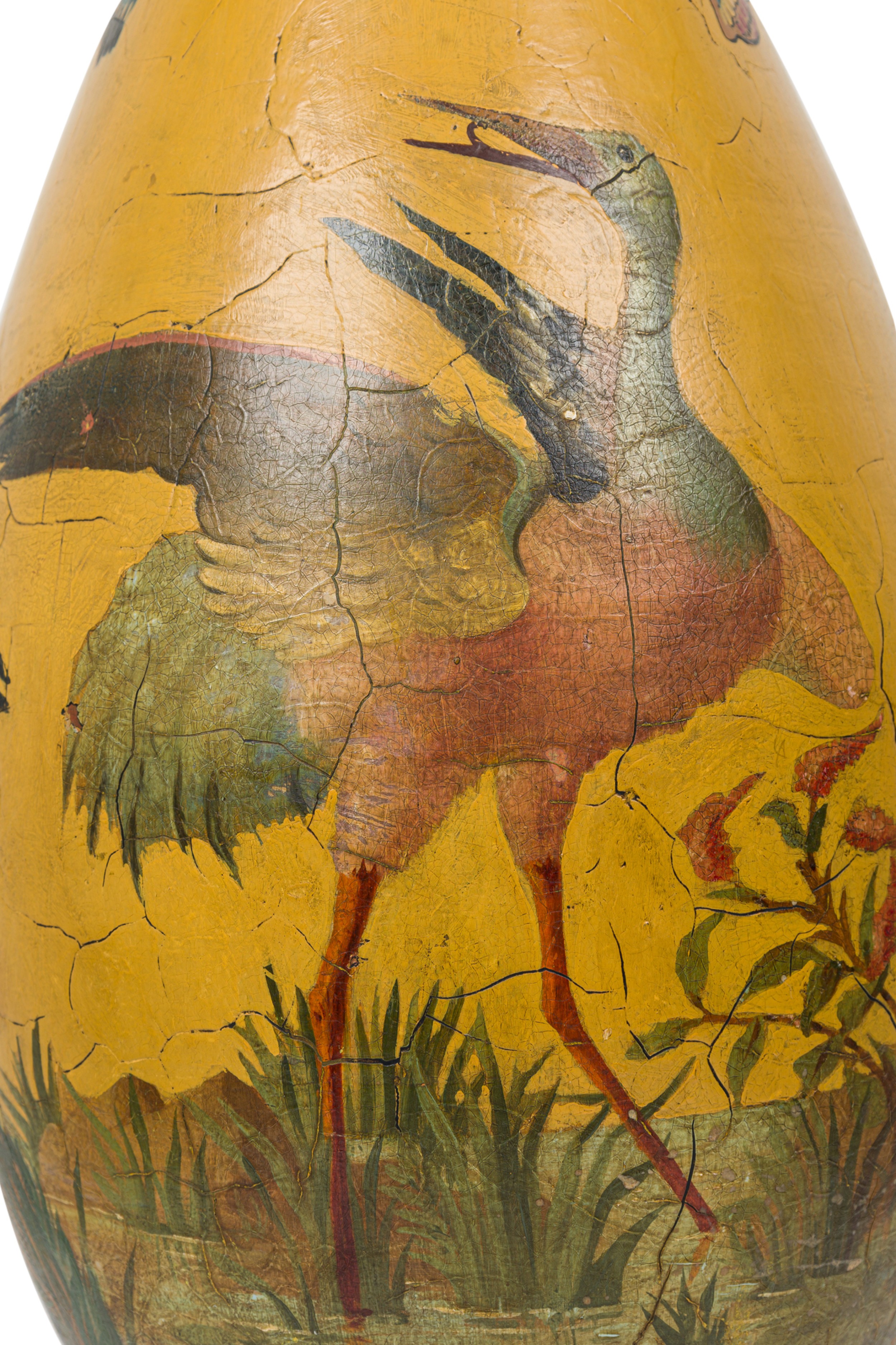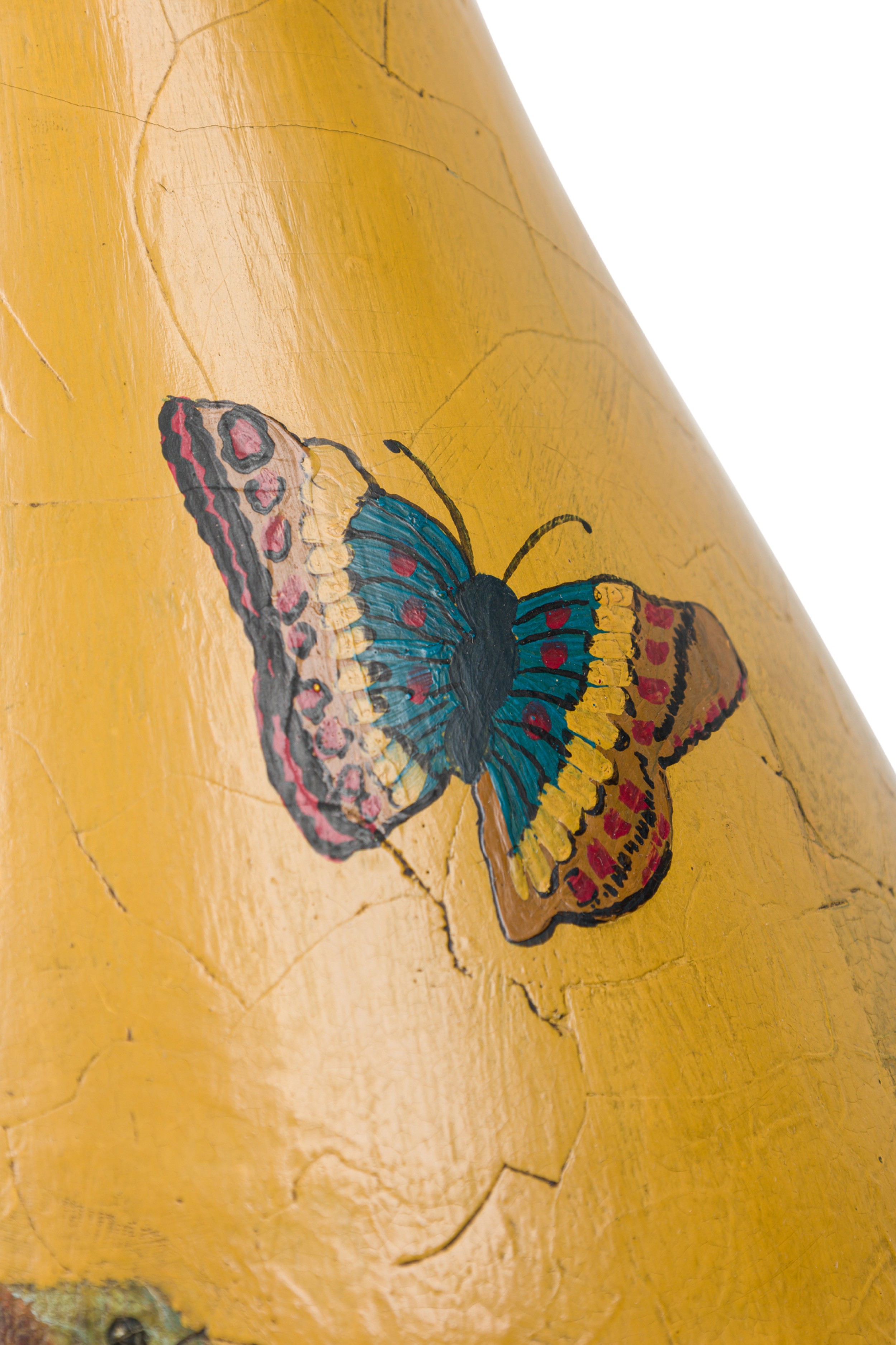 2 French (19th Century) glazed terra-cotta urns having flared scalloped tops and painted with a scene featuring birds and butterflies against a yellow background (PRICED EACH)