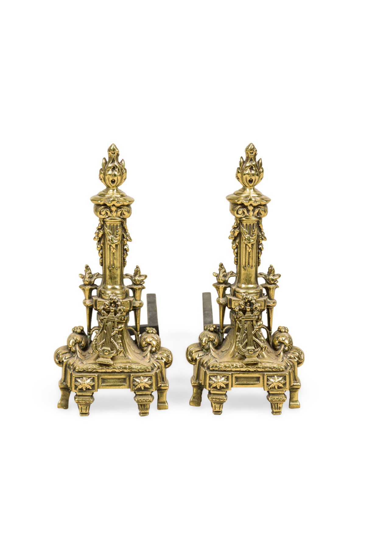 PAIR of French Louis XVI style bronze andirons with a flame top design torch column and a lyre in front