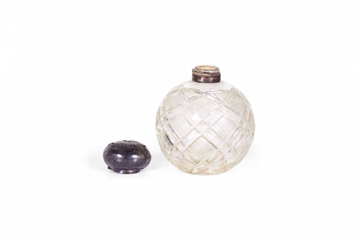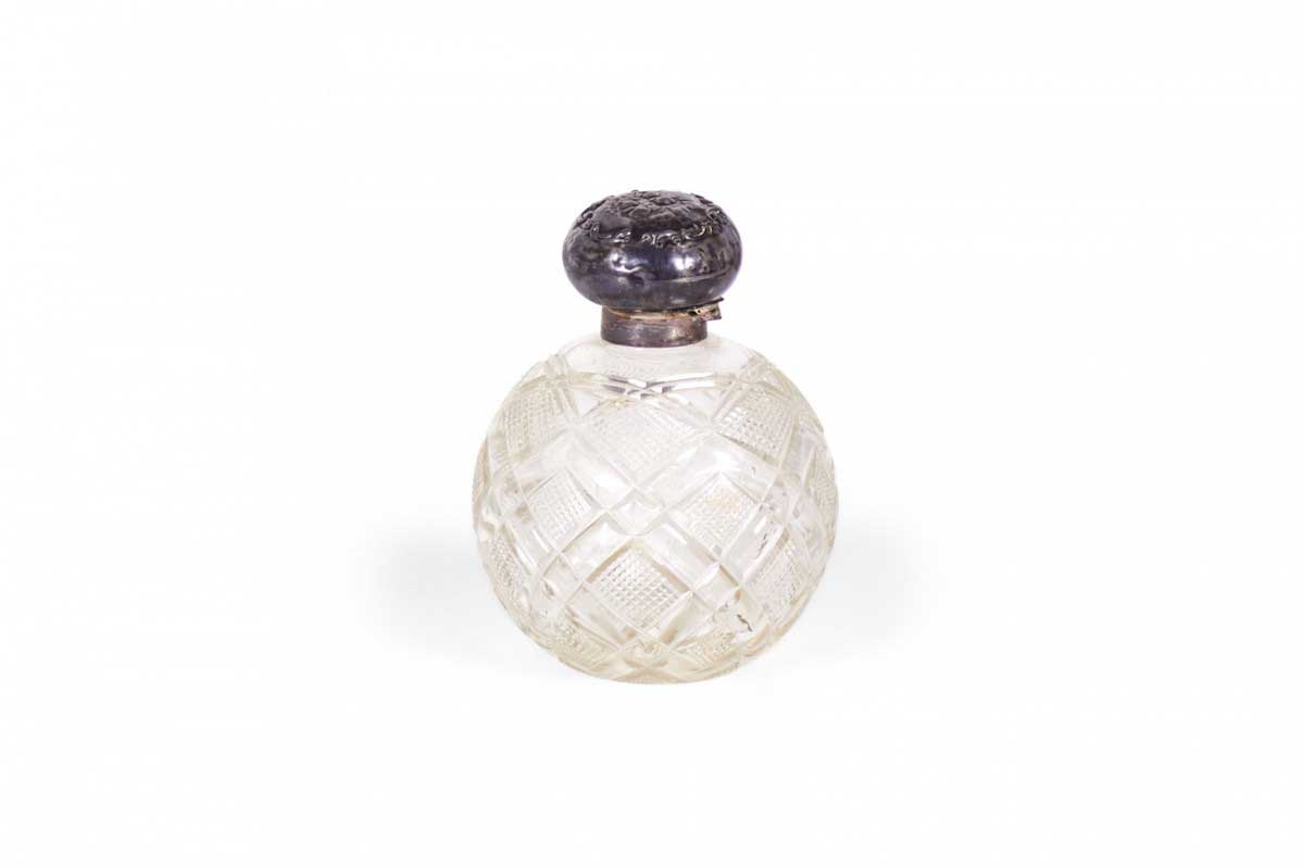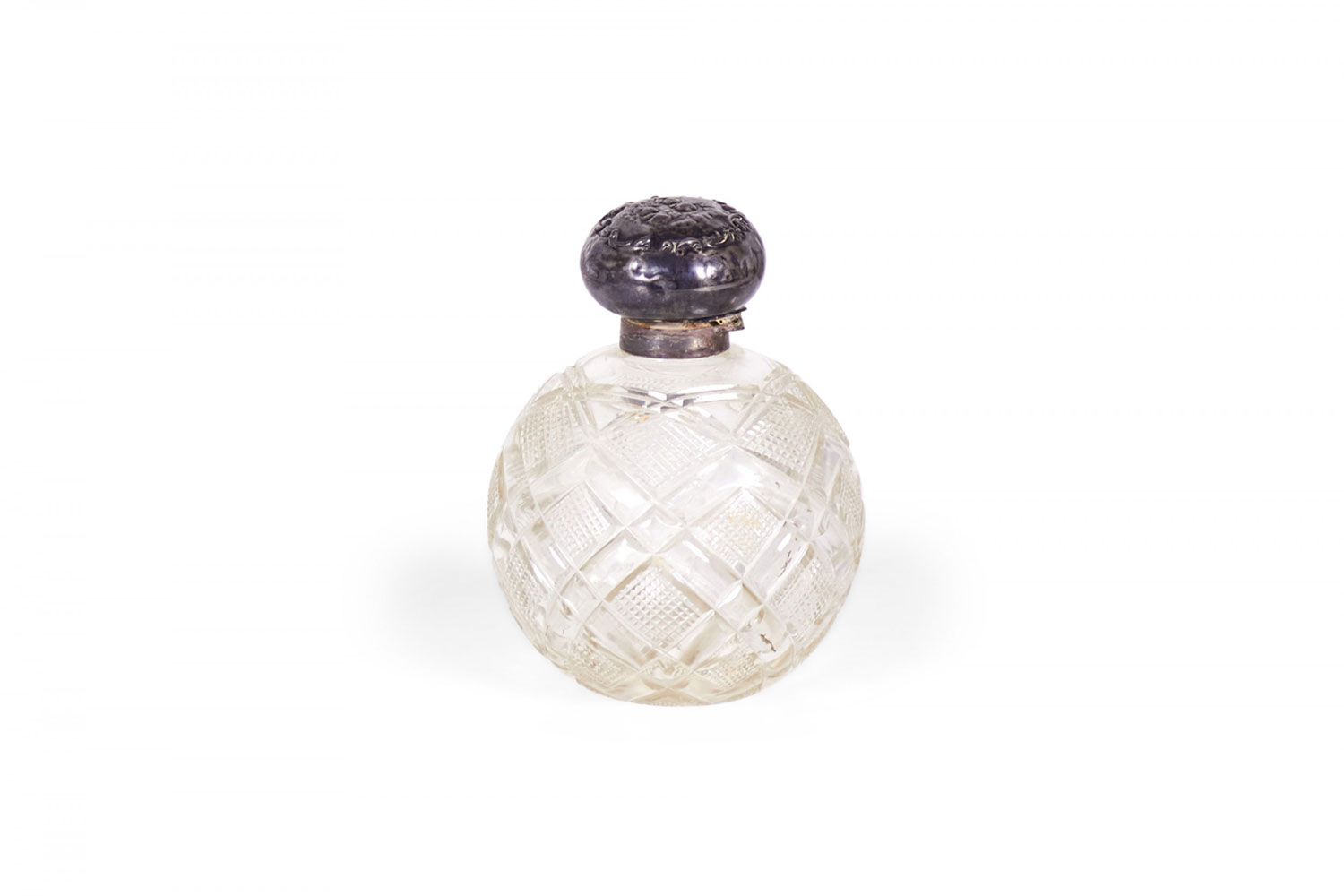 2 French Victorian cut crystal ball shaped perfume bottles with a silver top having a floral and scroll design (PRICED EACH)