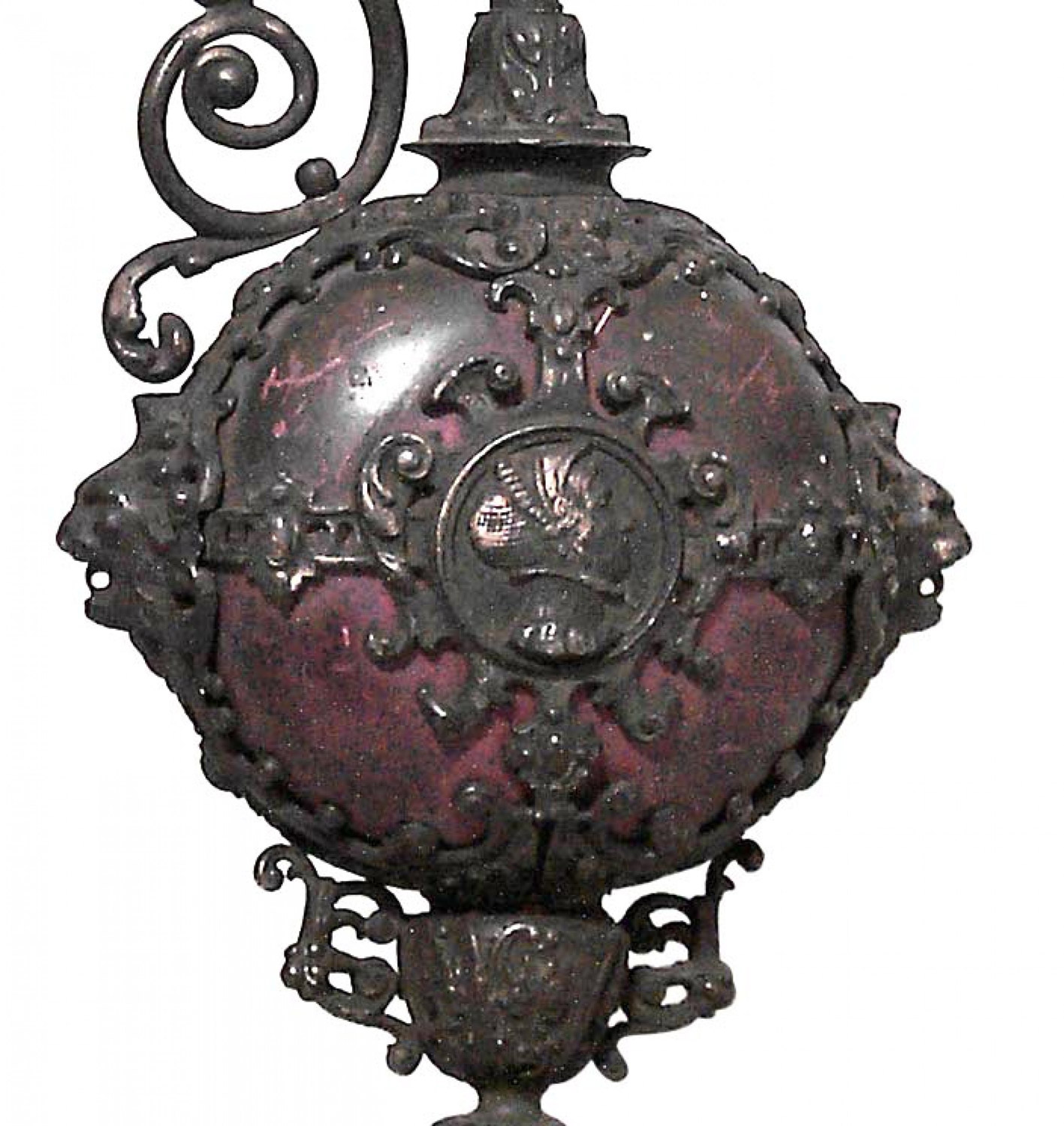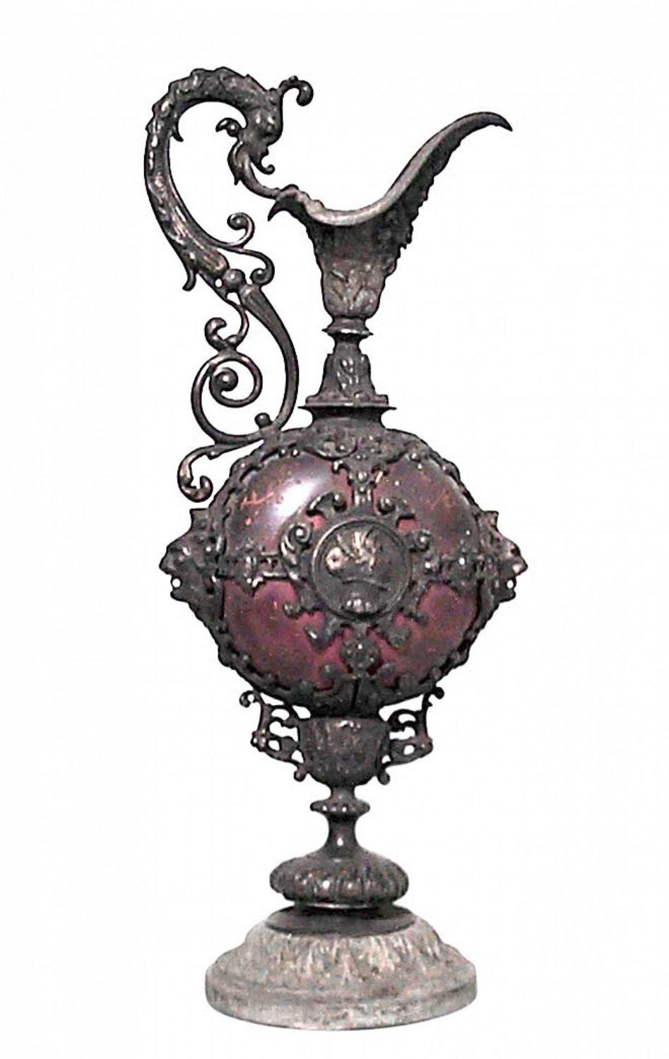 PAIR of French Victorian metal ewers with scroll handles and medallion head. (PRICED AS PAIR)