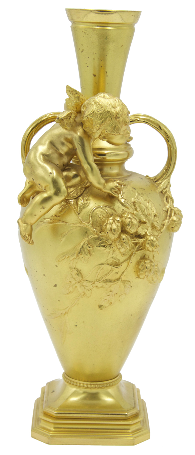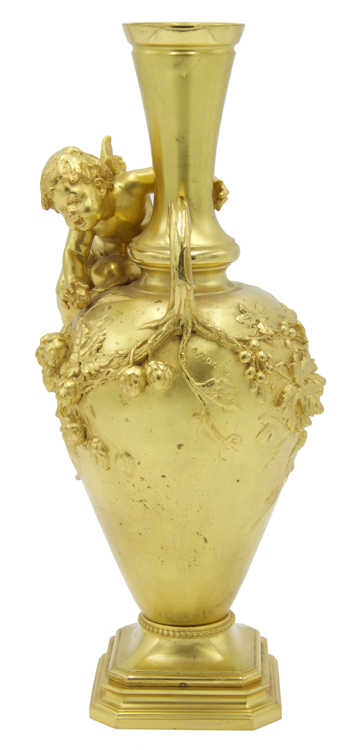 PAIR of French Victorian bronze dore vases with floral relief and seated cupid with small handles (signed A. MOREAU) (PRICED AS PAIR)