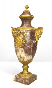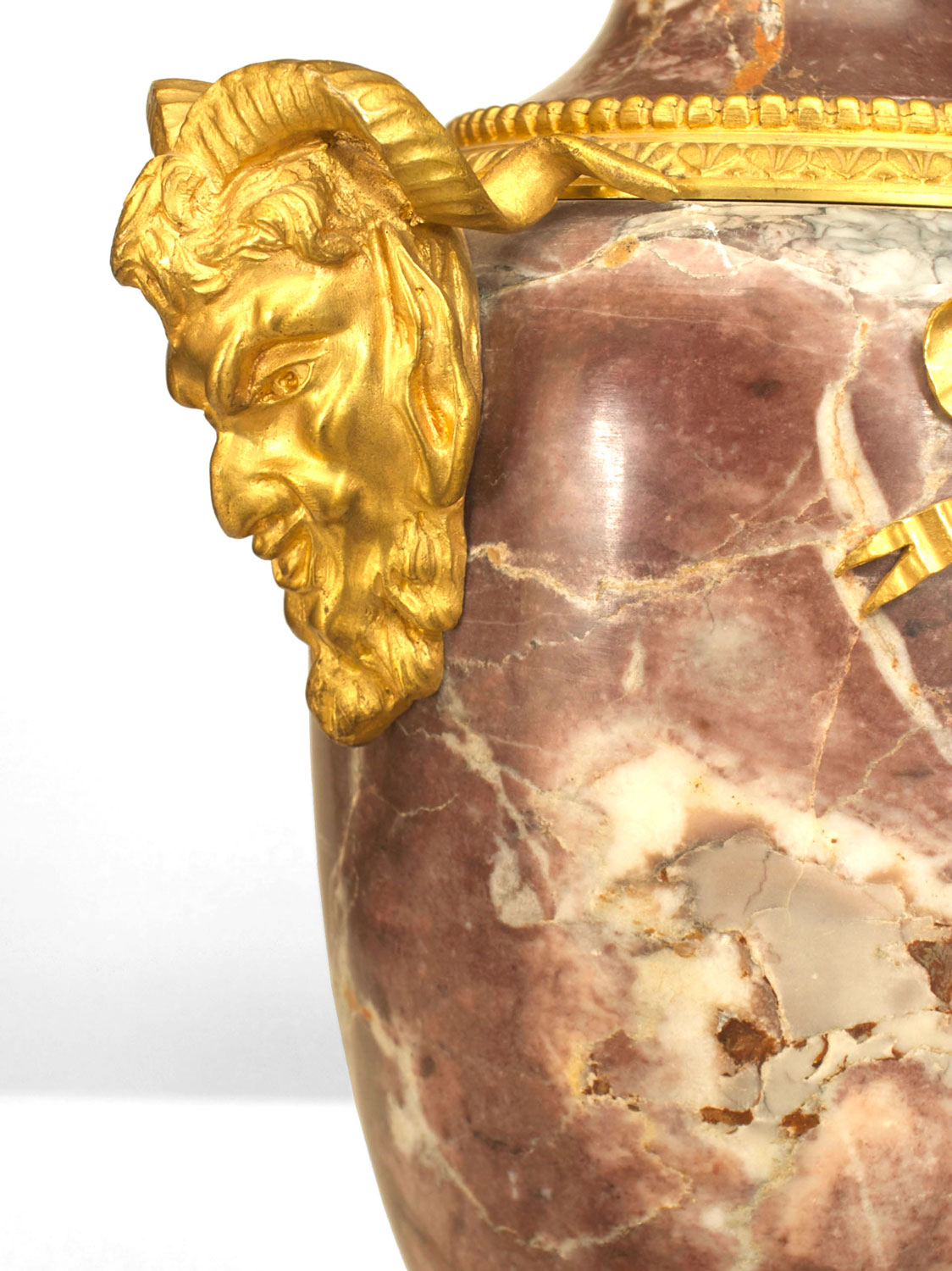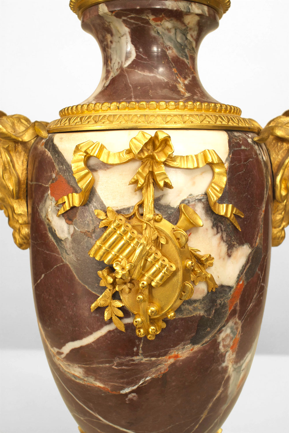 PAIR of French Victorian Neoclassical style rosso levanto marble urns with gilt bronze ram head sides and acorn finial top with musical relief trim supported on a square base. (PRICED AS PAIR)