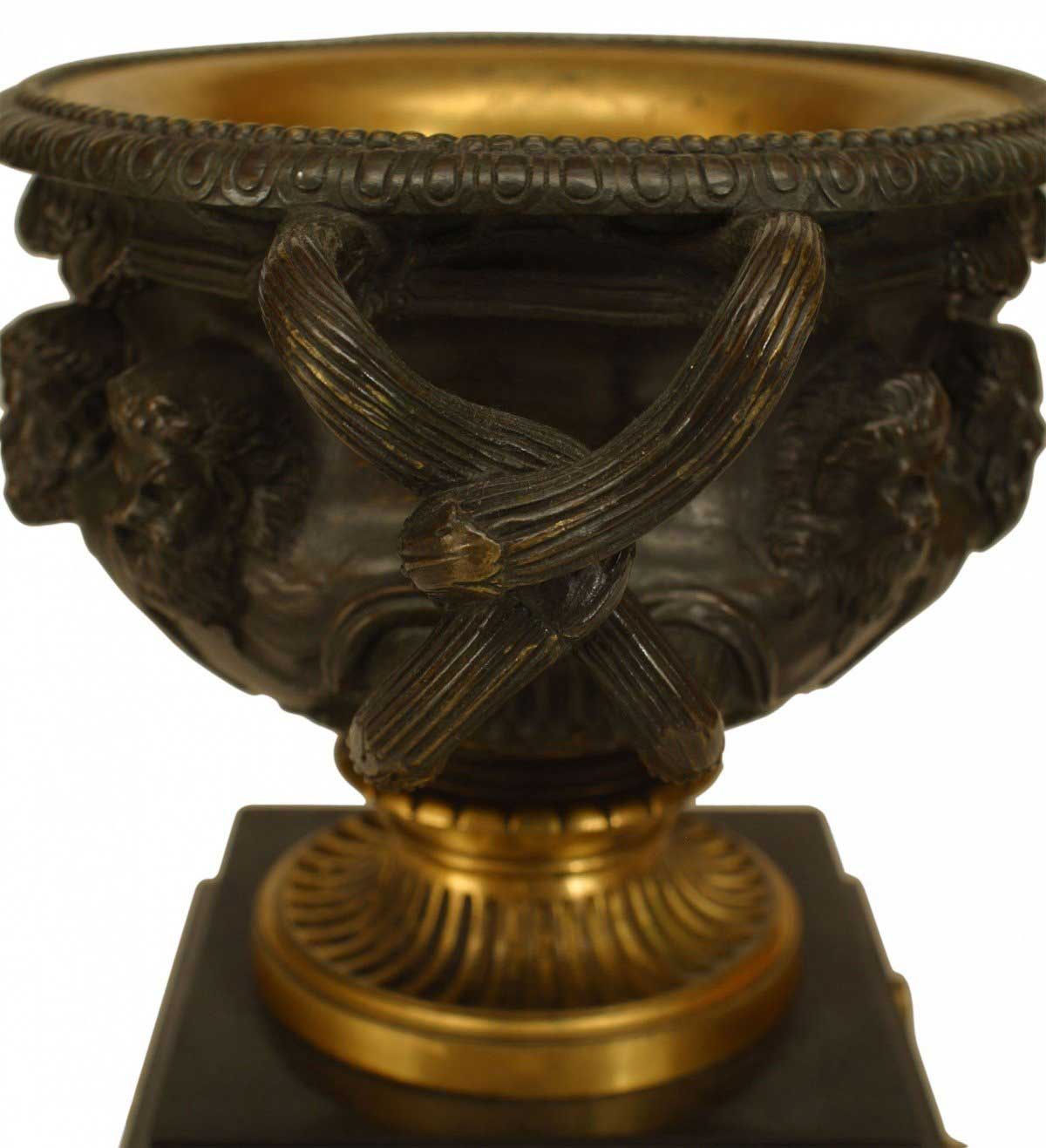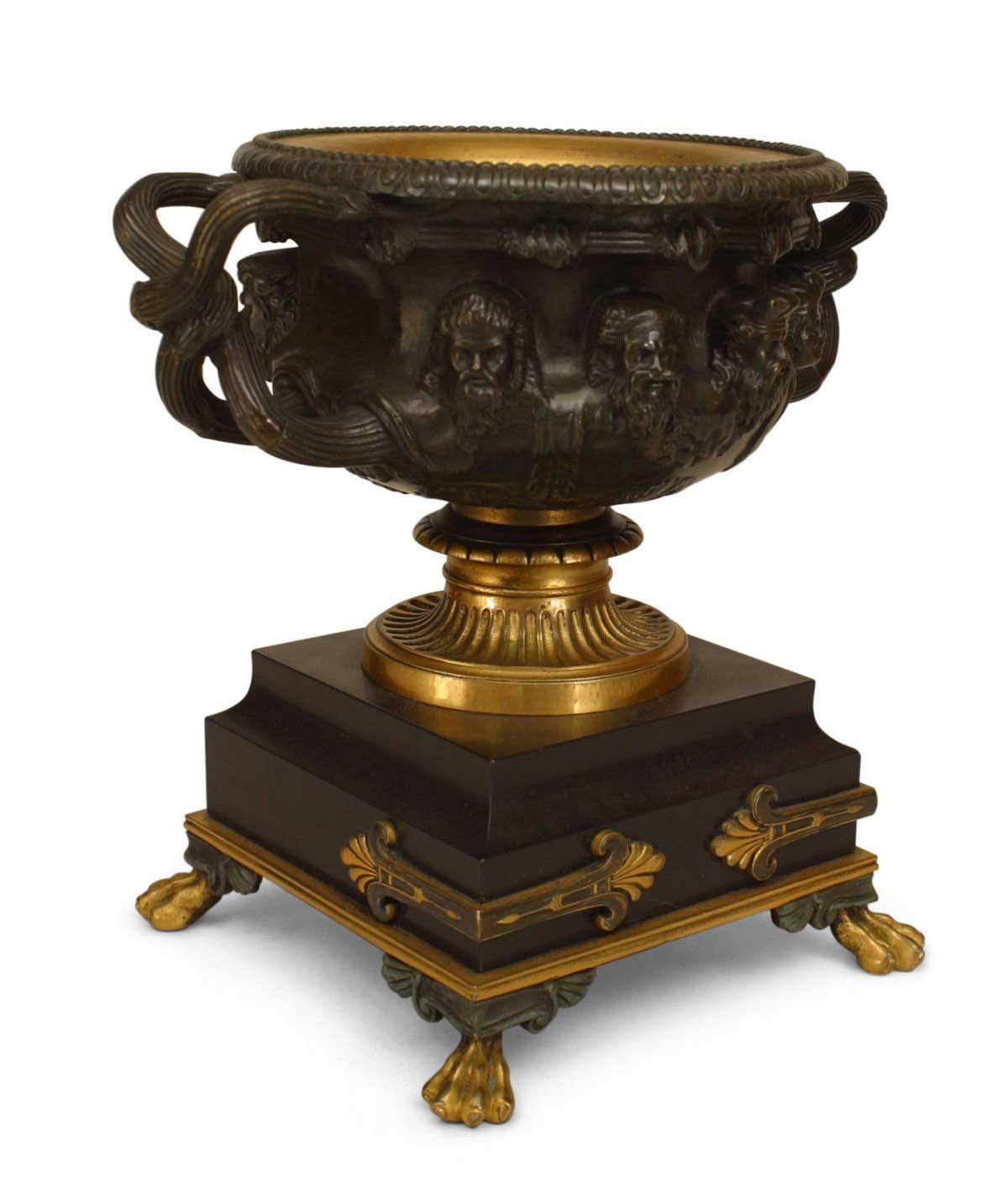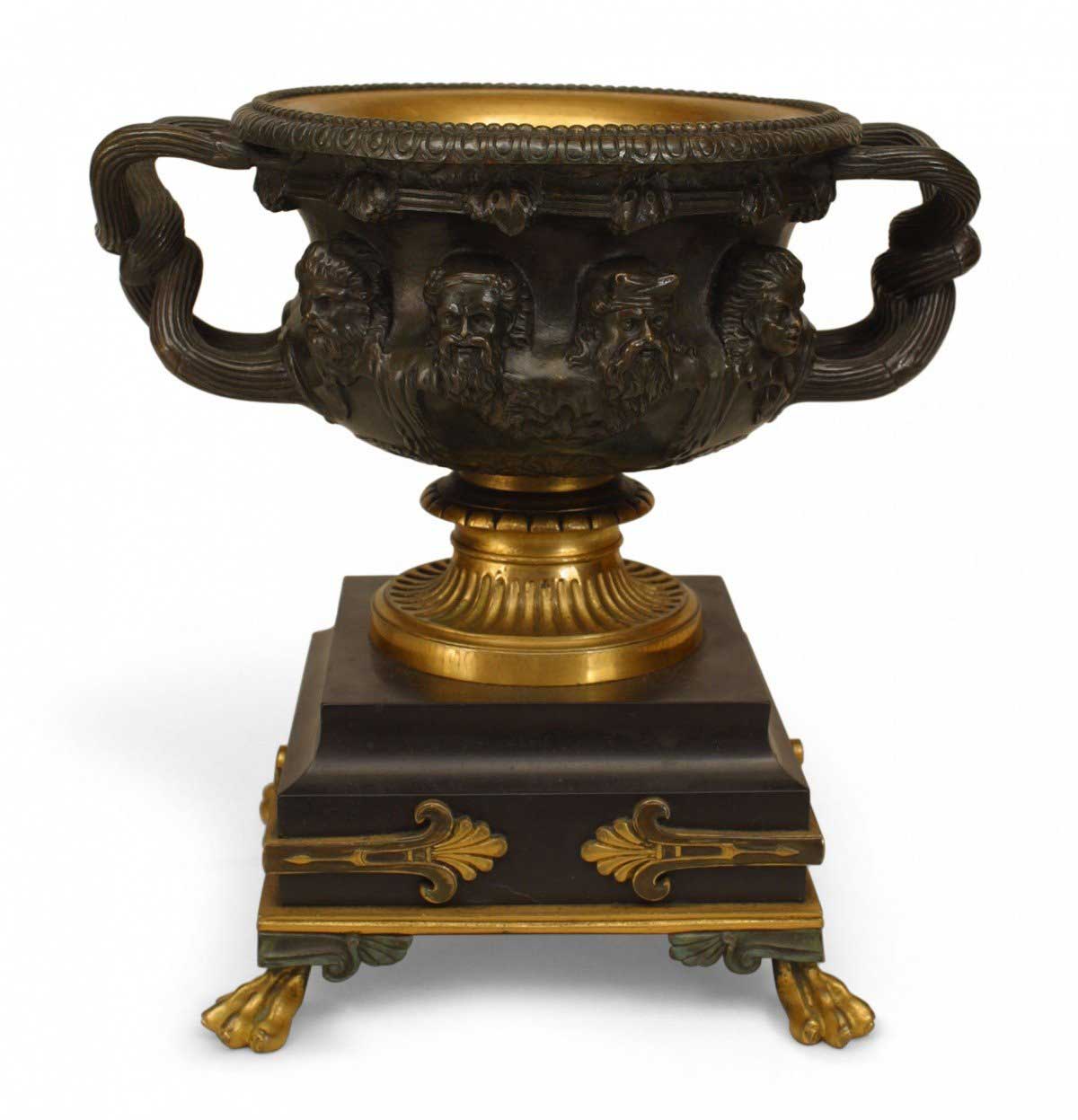 PAIR of Italian Neo-classic (19th Century) bronze & gilt trimmed urns surrounded by Greek masks & having intertwined handles resting on a square black marble base over claw feet. (PRICED AS PAIR)