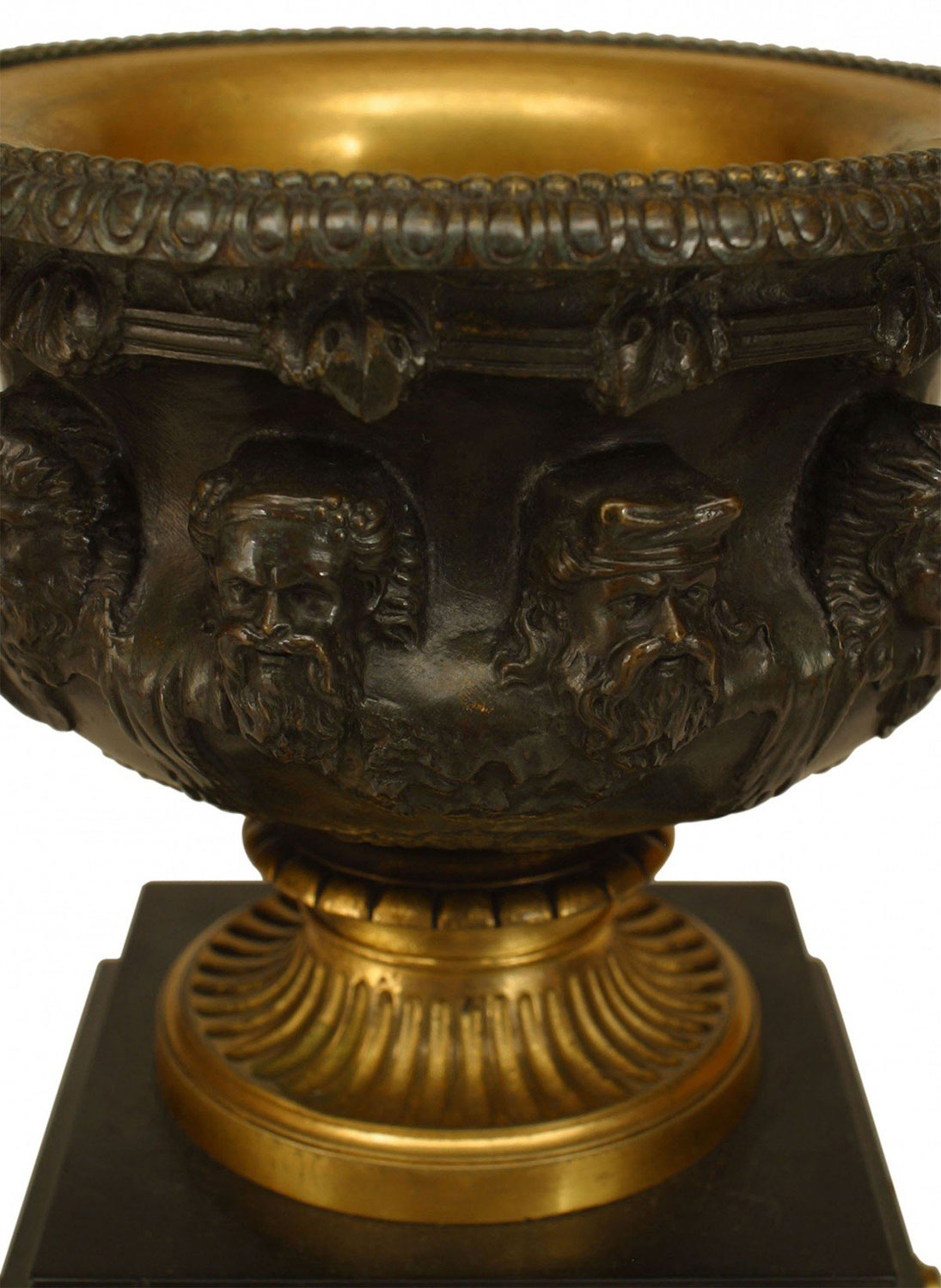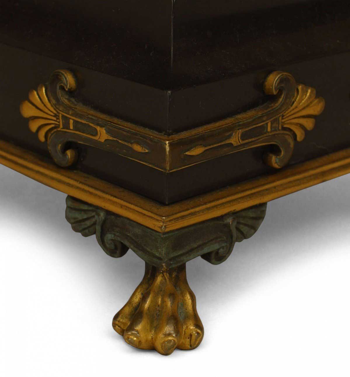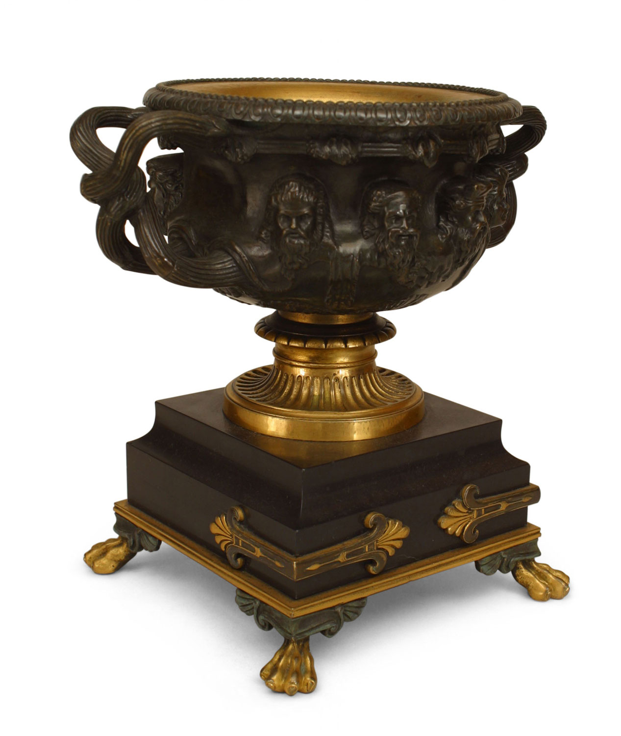 PAIR of Italian Neo-classic (19th Century) bronze & gilt trimmed urns surrounded by Greek masks & having intertwined handles resting on a square black marble base over claw feet. (PRICED AS PAIR)