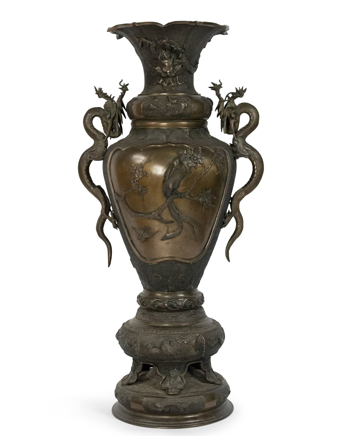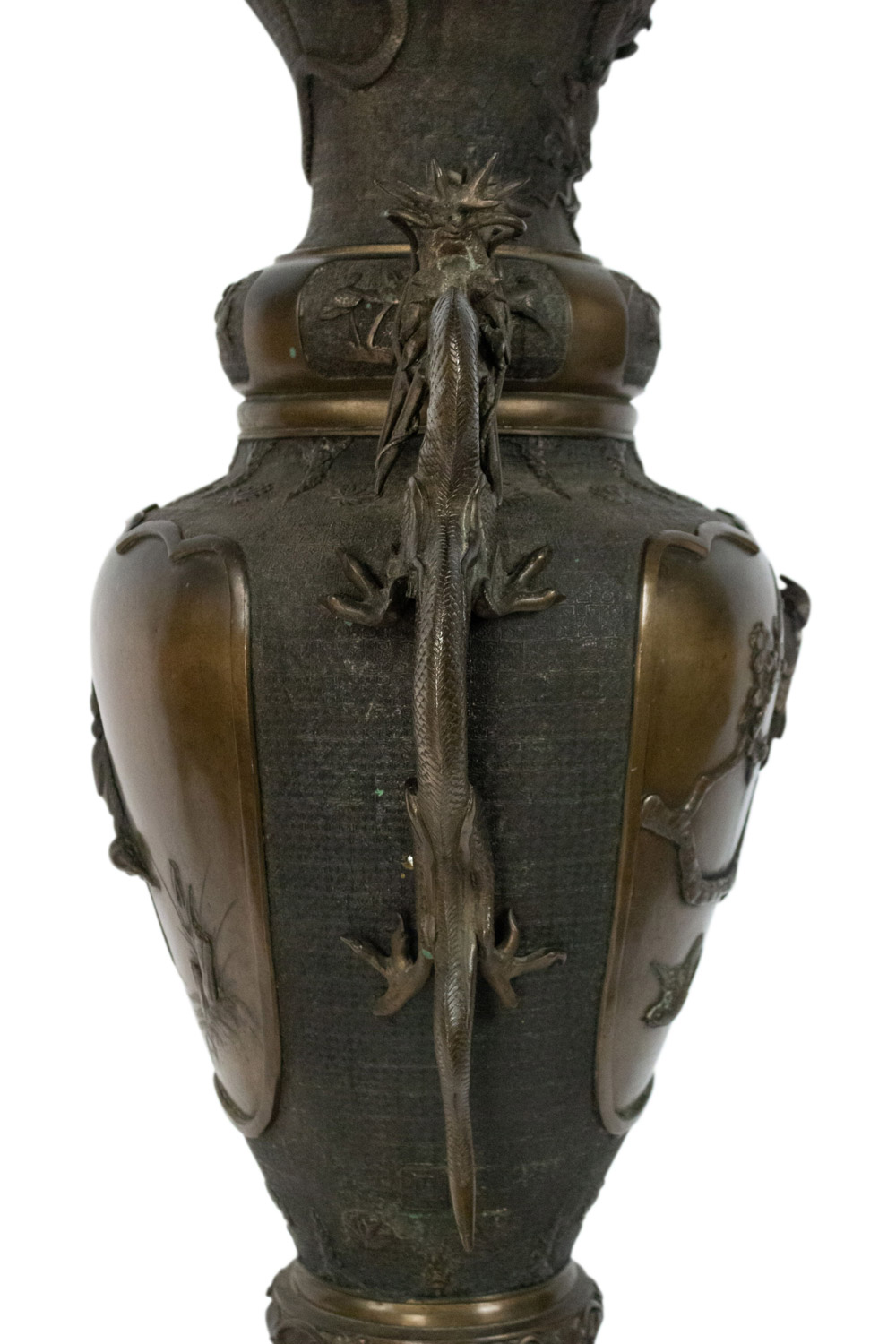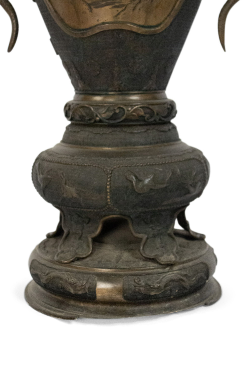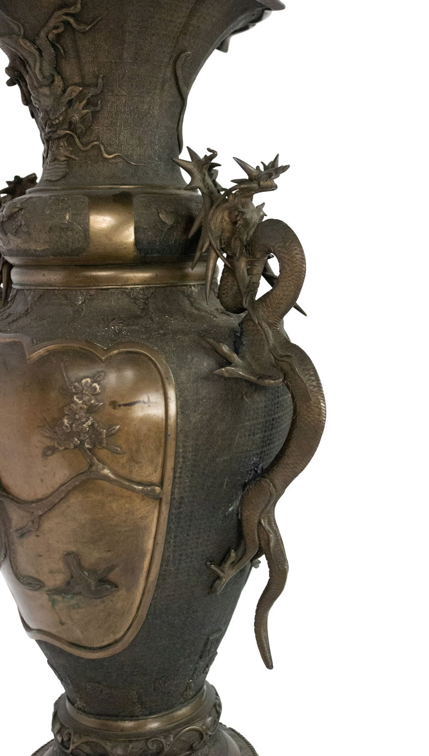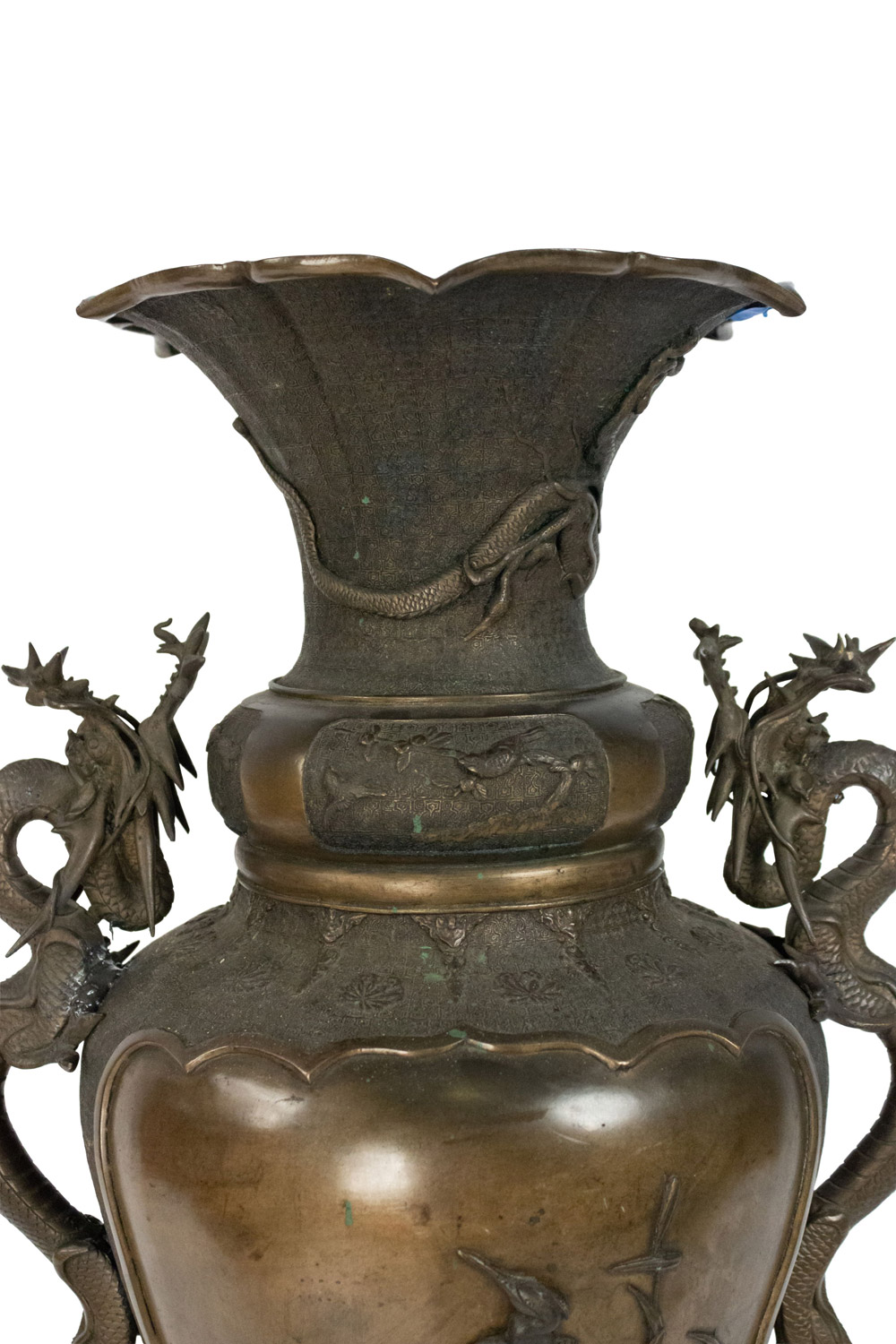 PAIR of Asian Japanese style (19th Cent) bronze palace urns with bird reliefs, flared tops and dragon handles (minor repair to 1 handle) (PRICED AS PAIR)