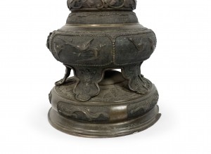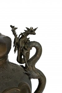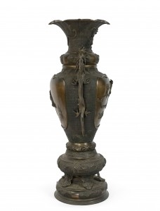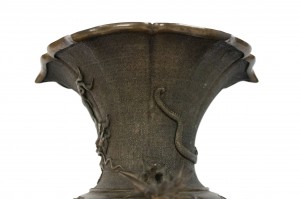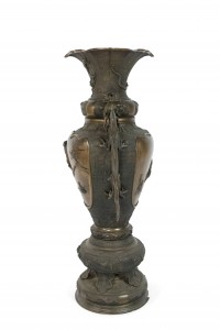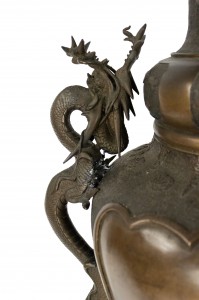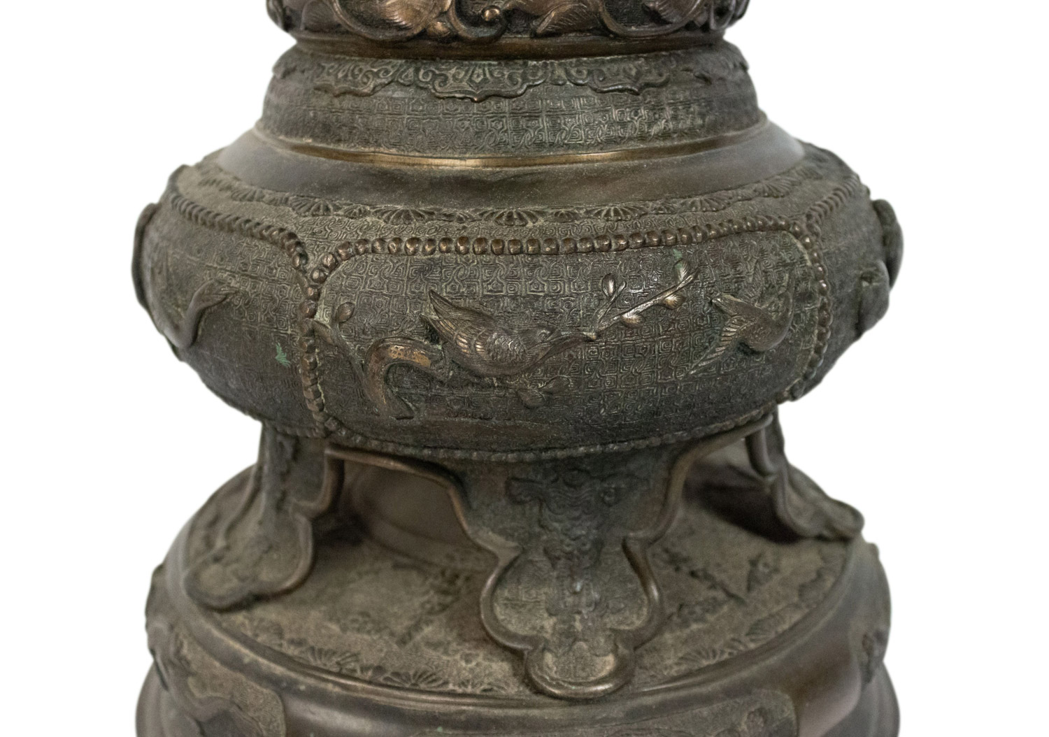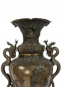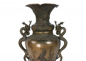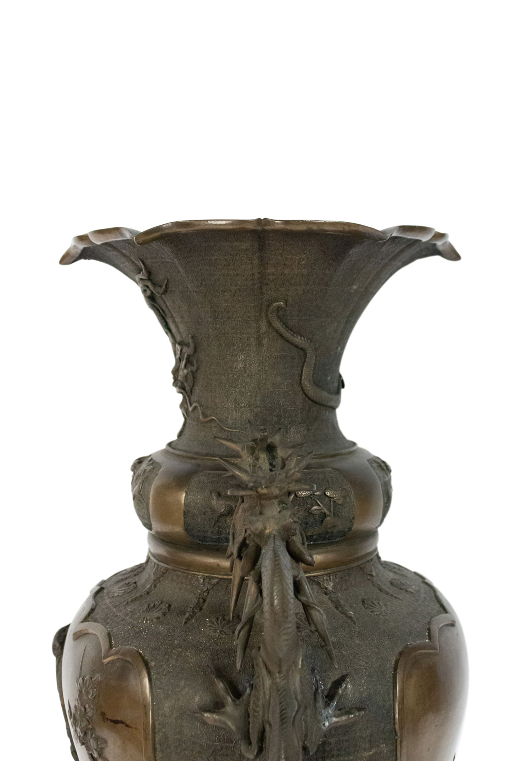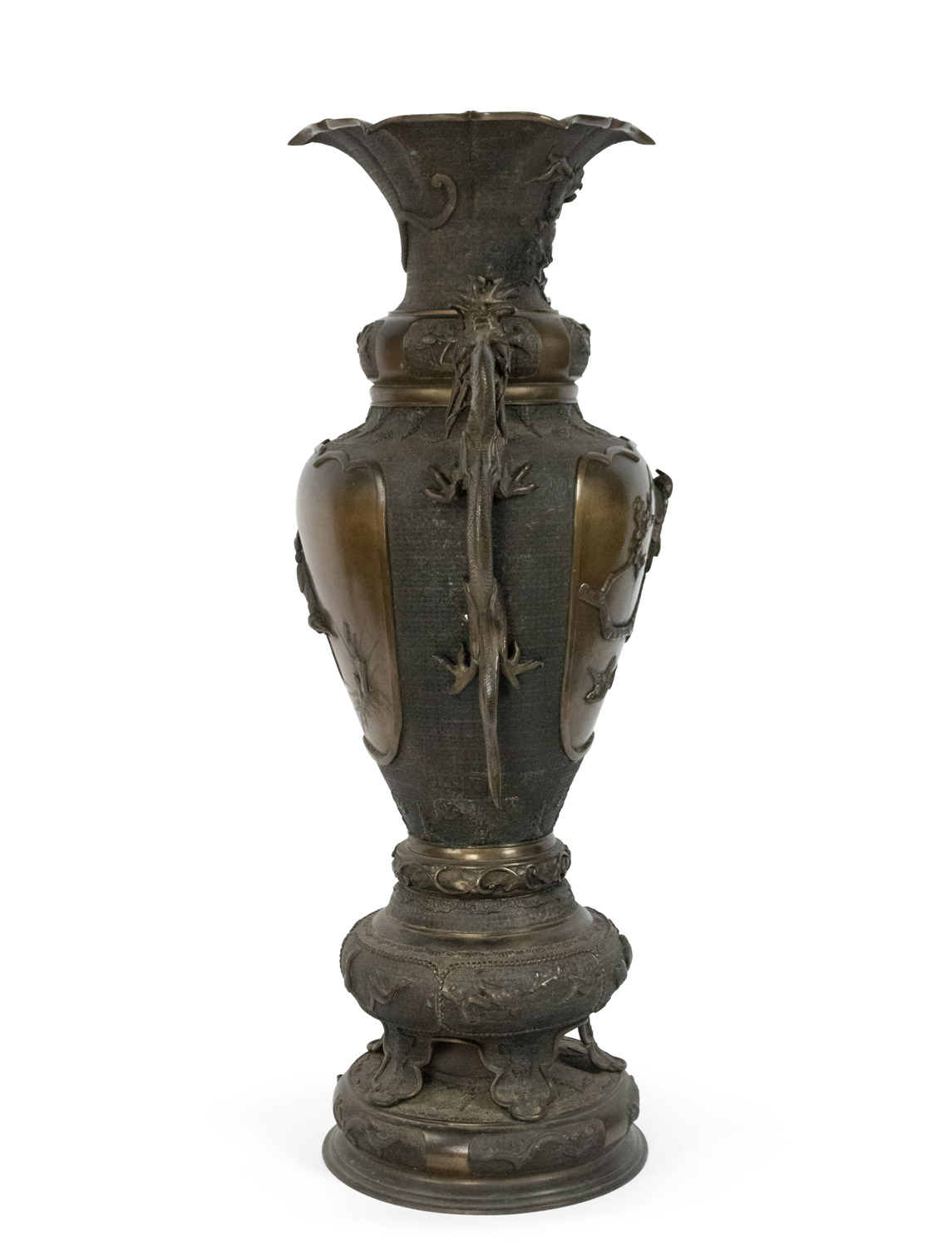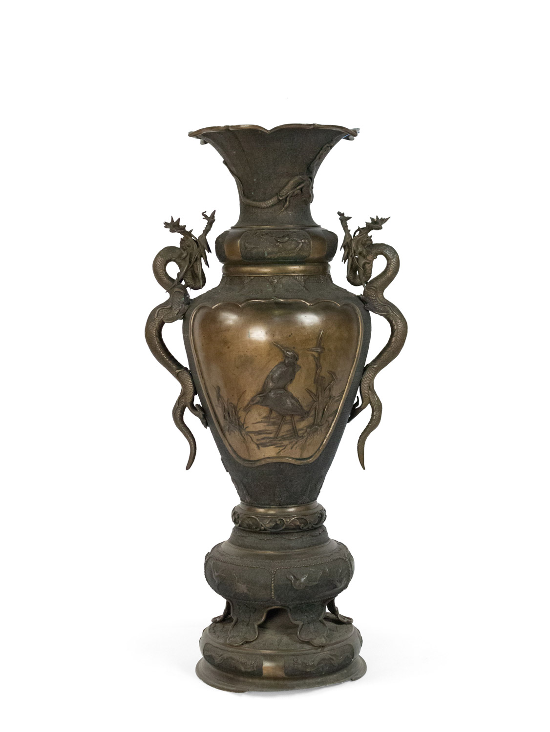 PAIR of Asian Japanese style (19th Cent) bronze palace urns with bird reliefs, flared tops and dragon handles (minor repair to 1 handle) (PRICED AS PAIR)