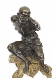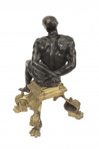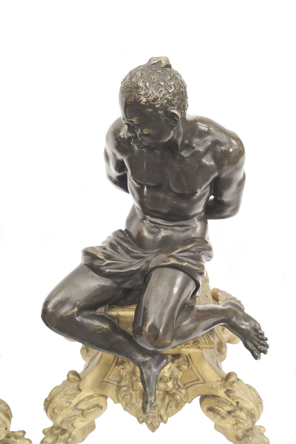 PAIR of French Louis XV-style (19th Century) bronze chenet / andirons featuring two bound male figures on a gilt base. (PRICED AS PAIR)