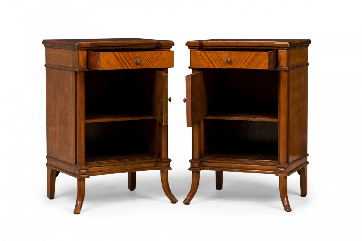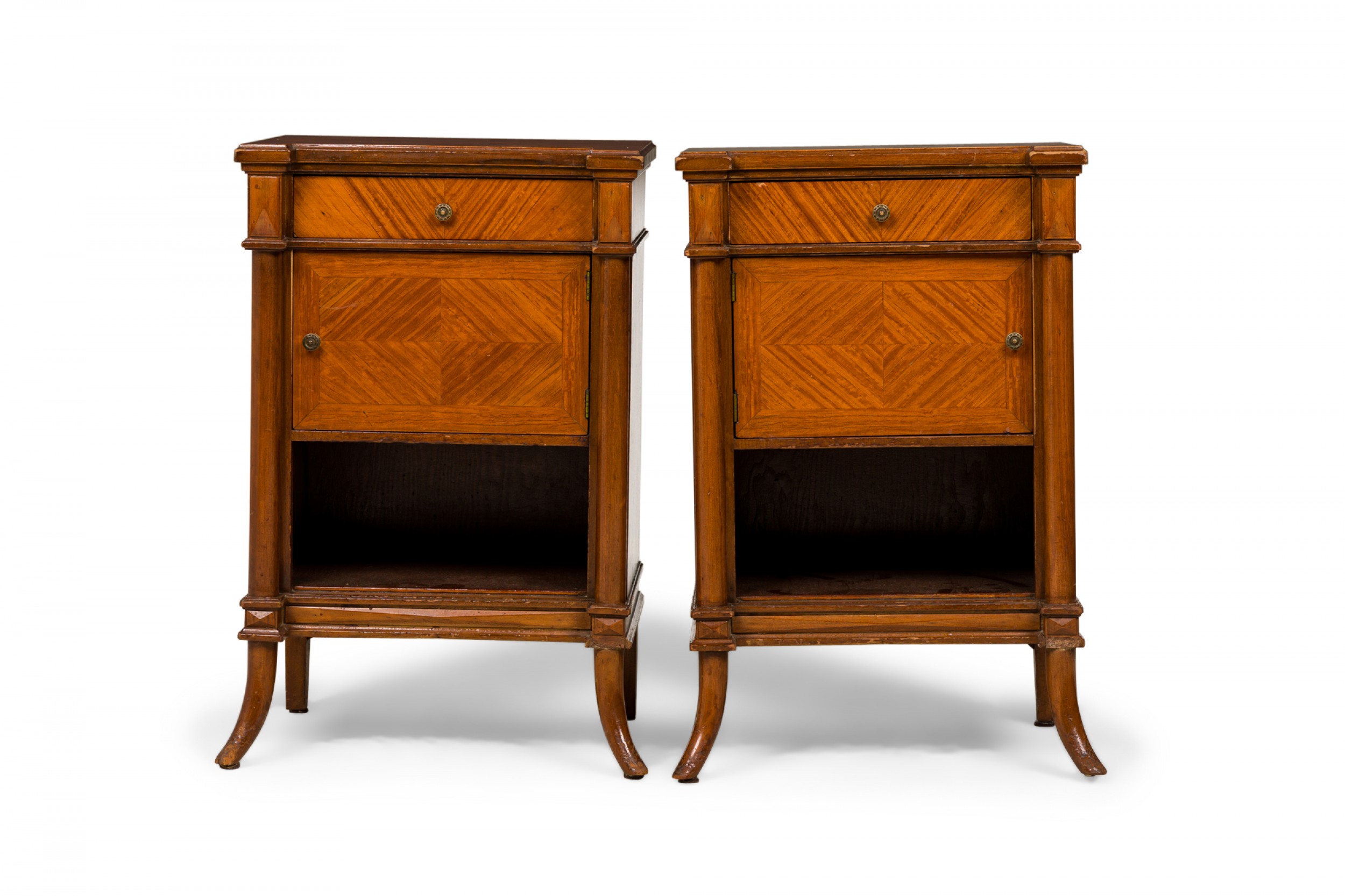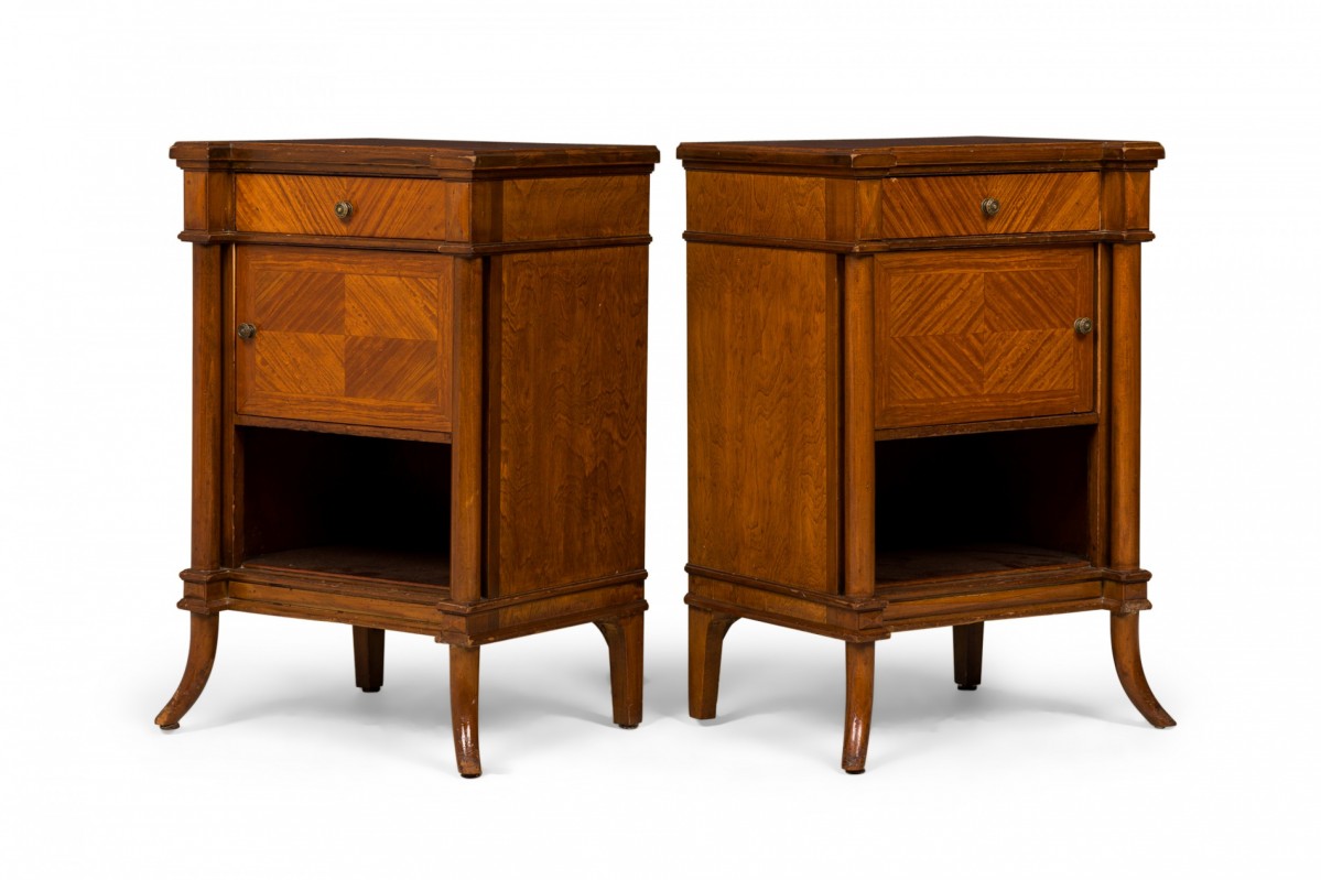 2 French Louis XVI-style bedside table / commodes with striped parquetry veneer in a diamond pattern, a shallow upper drawer above a compartment with a hinged door, above an open lower compartment, with bronze floral patterned drawer pulls, resting on curved cylindrical legs. (PRICED EACH)