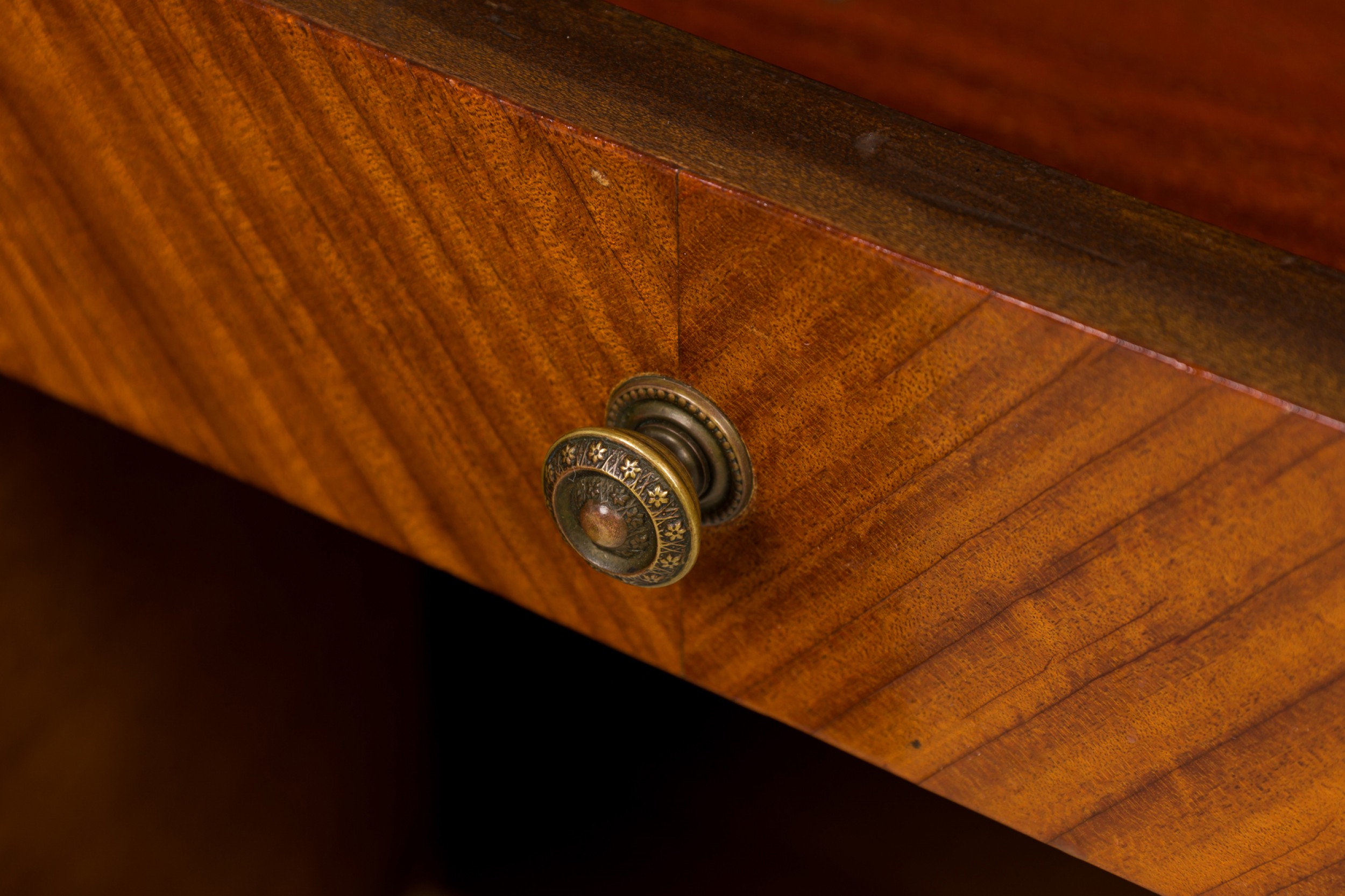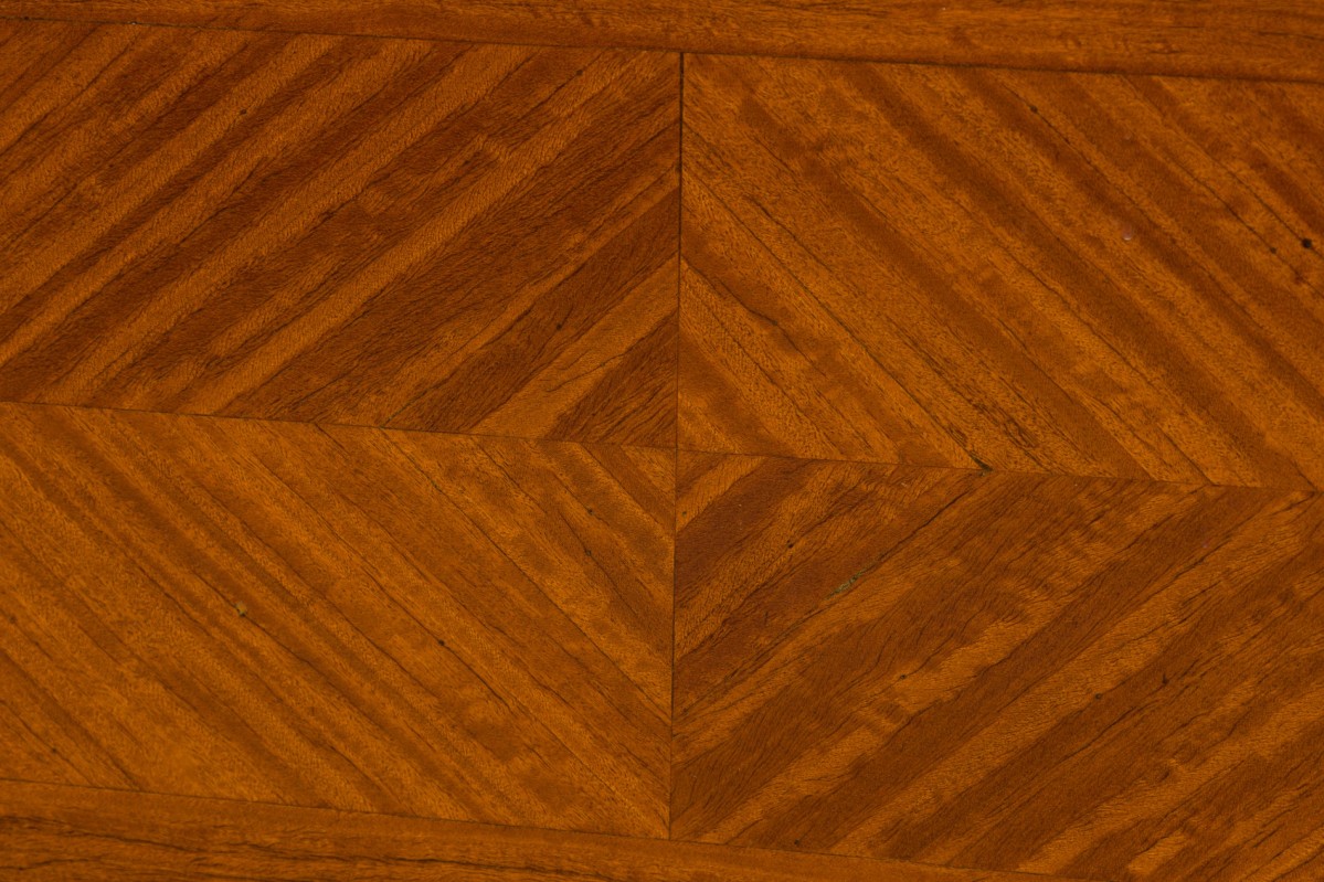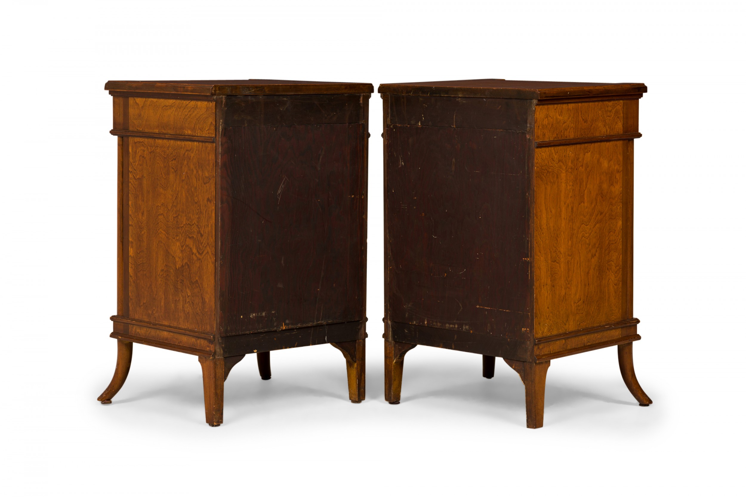 2 French Louis XVI-style bedside table / commodes with striped parquetry veneer in a diamond pattern, a shallow upper drawer above a compartment with a hinged door, above an open lower compartment, with bronze floral patterned drawer pulls, resting on curved cylindrical legs. (PRICED EACH)