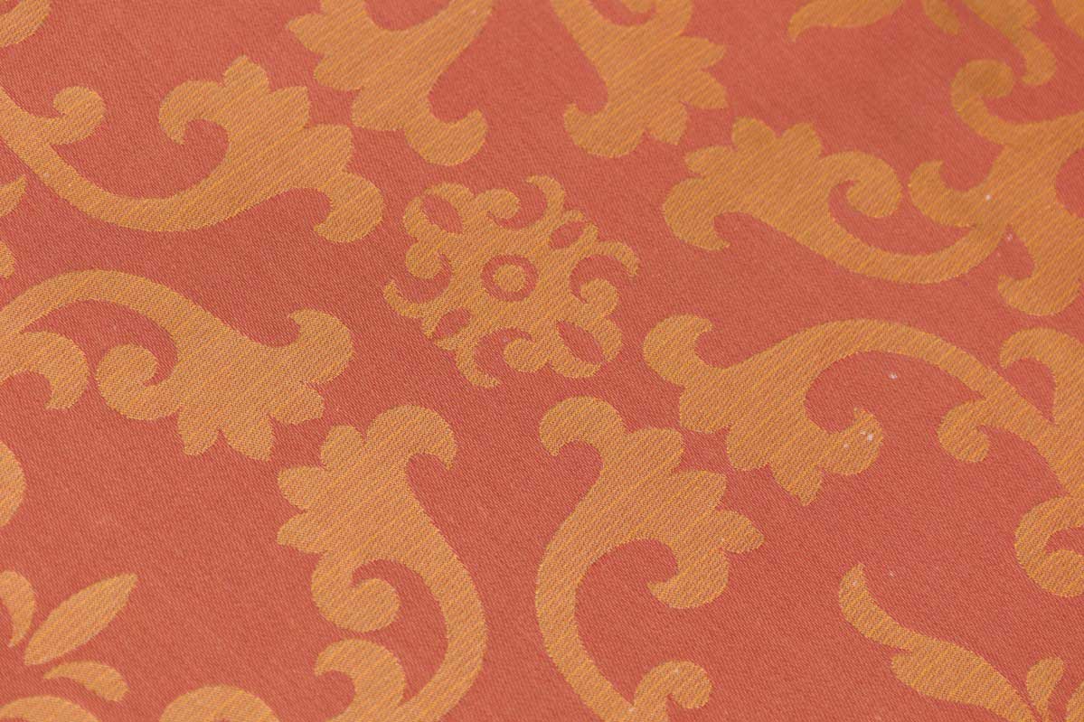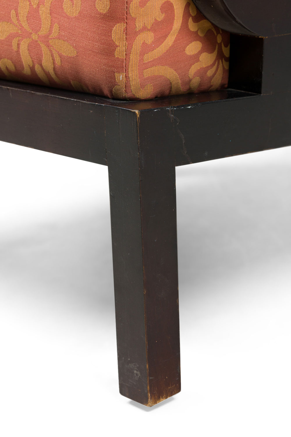 2 Mid-Century English style oversized club / armchairs with dark finished walnut frames with square backs and armrests with circular cutouts, upholstered in a rust orange and gold patterned damask fabric. (PRICED EACH)