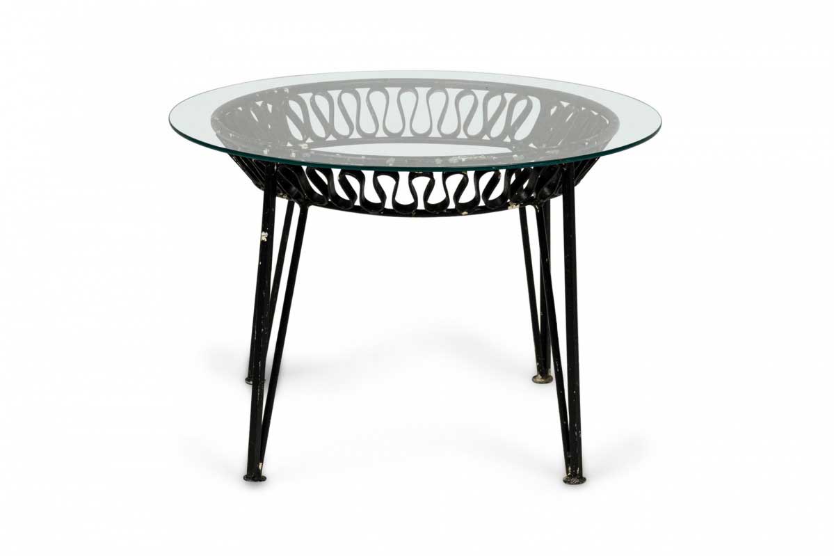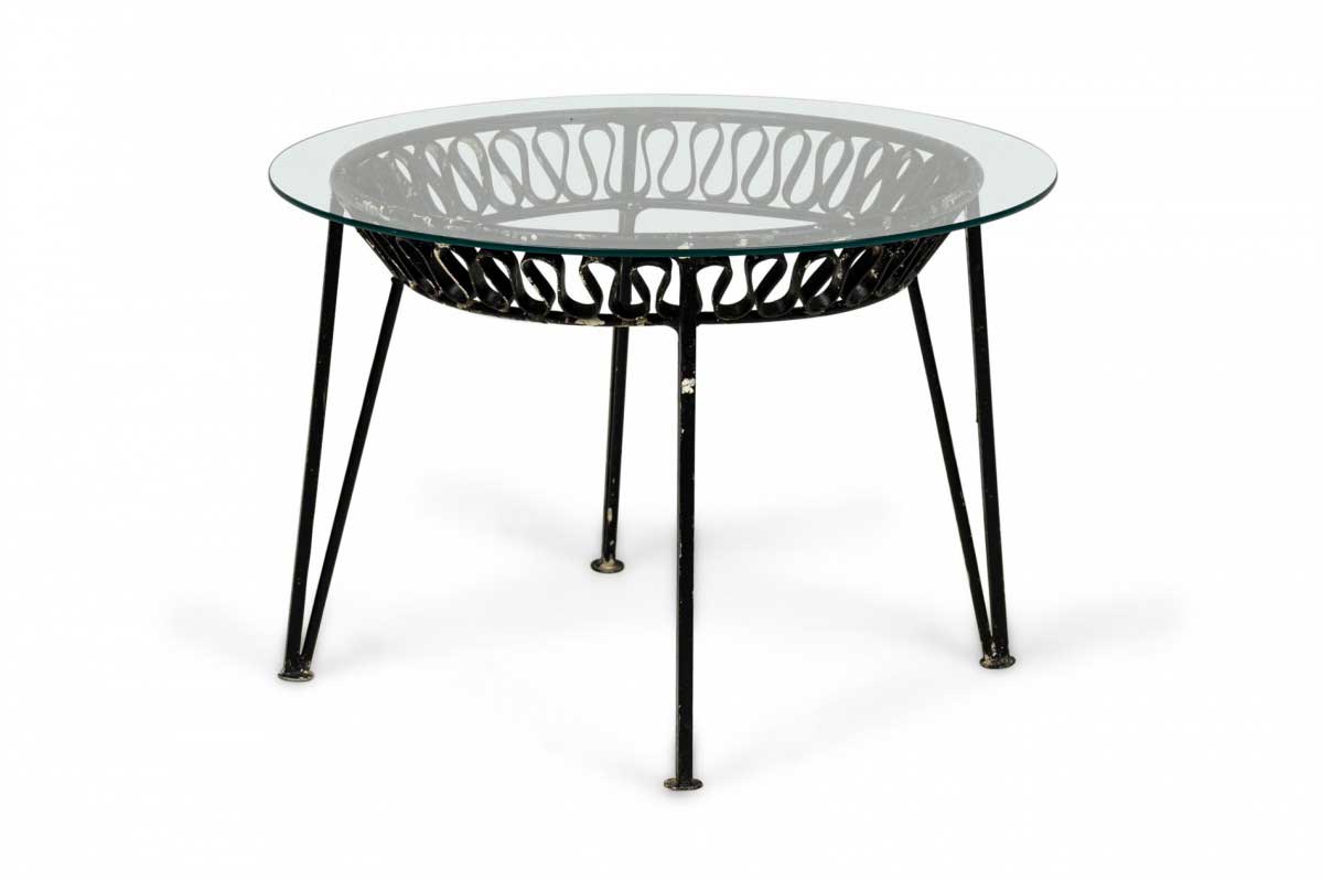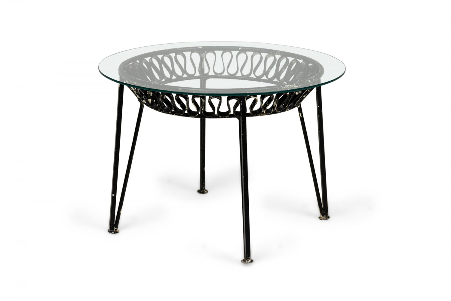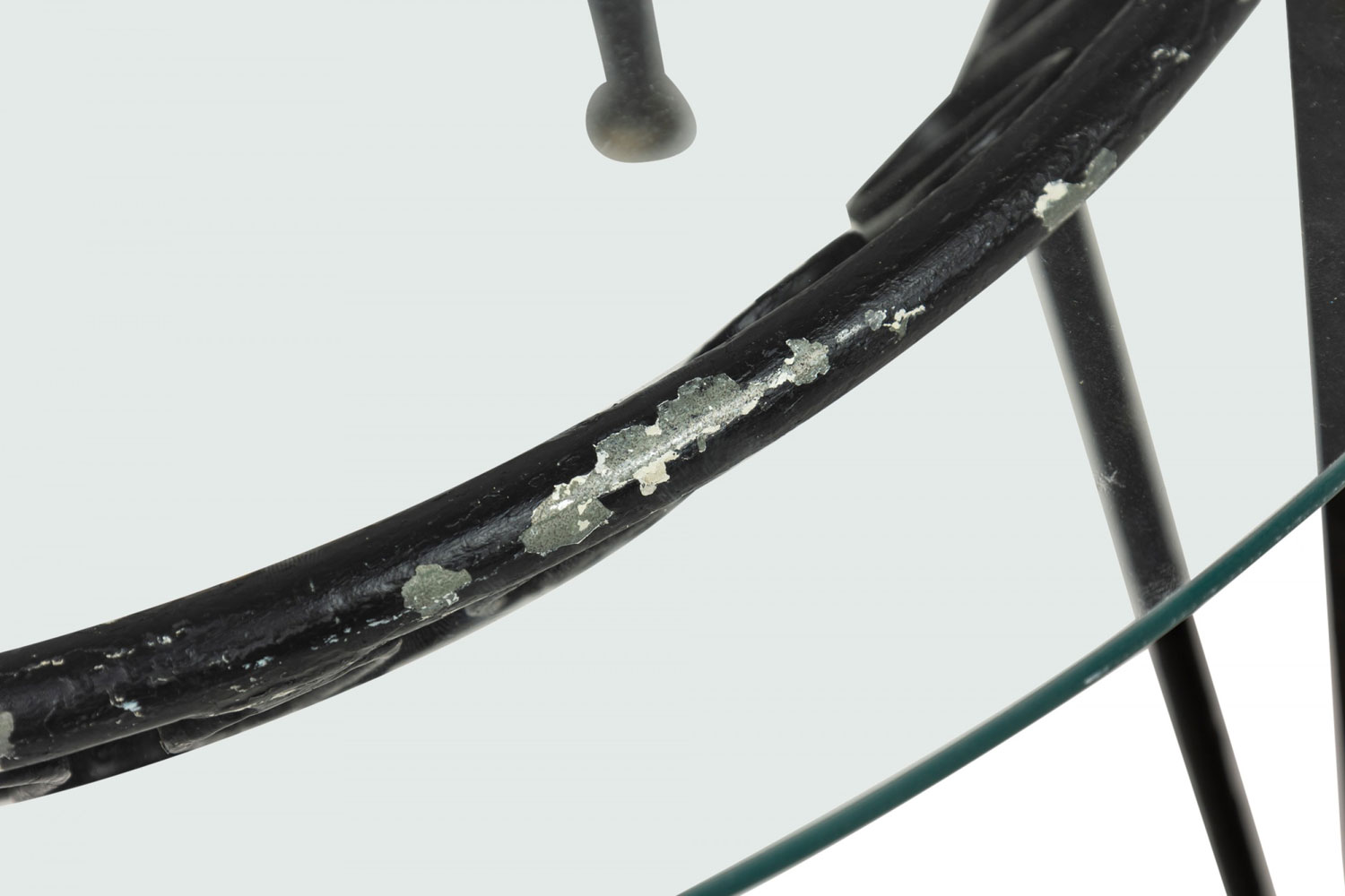 2 Mid-Century circular black metal "Ribbon" occasional tables with glass tops standing on 4 triangular legs. (PRICED EACH)(One table available in white: DUF0858)