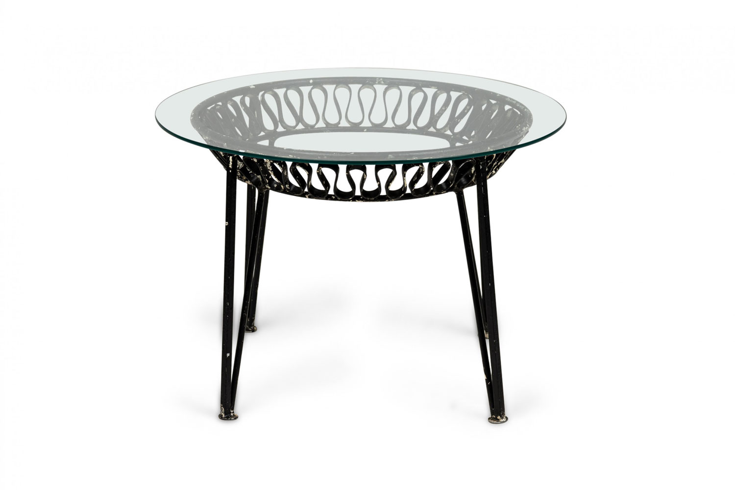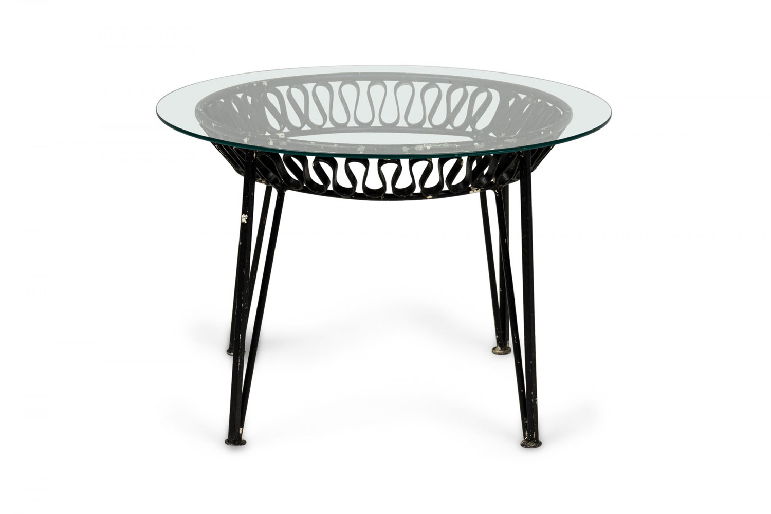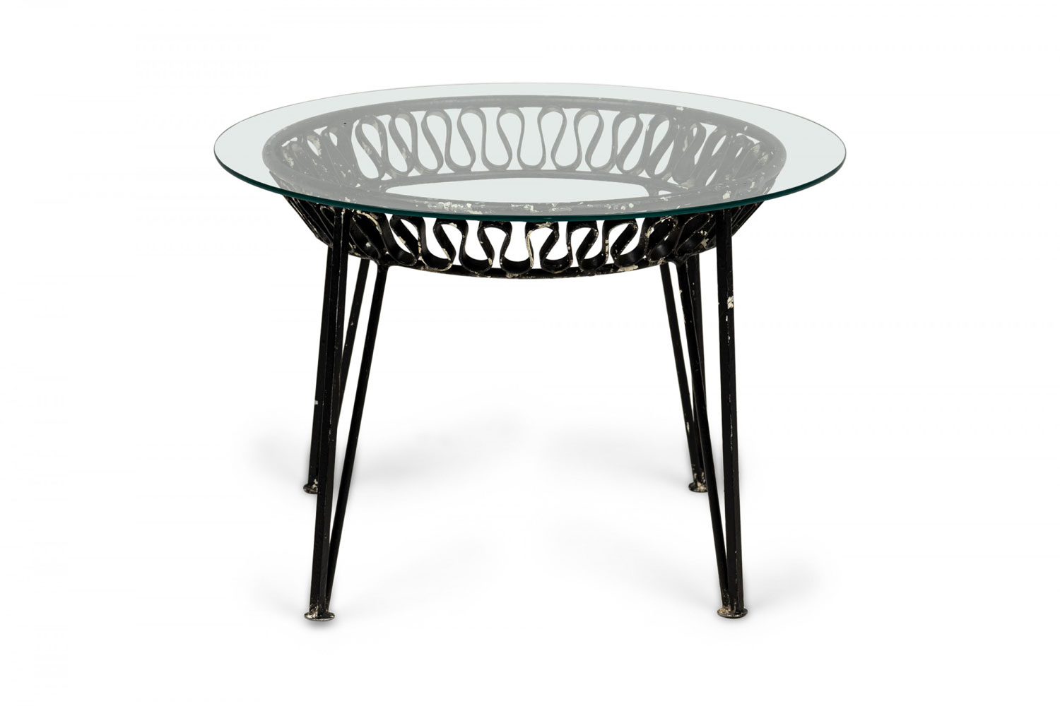 2 Mid-Century circular black metal "Ribbon" occasional tables with glass tops standing on 4 triangular legs. (PRICED EACH)(One table available in white: DUF0858)