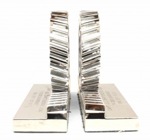 PAIR of American (Mid-20th Century) chrome plated bookends with industrial gear design (engraved with presentation information) (PRICED AS PAIR)