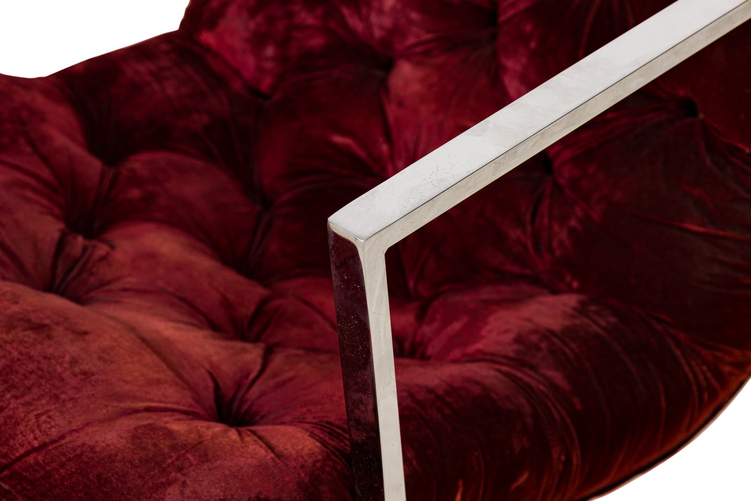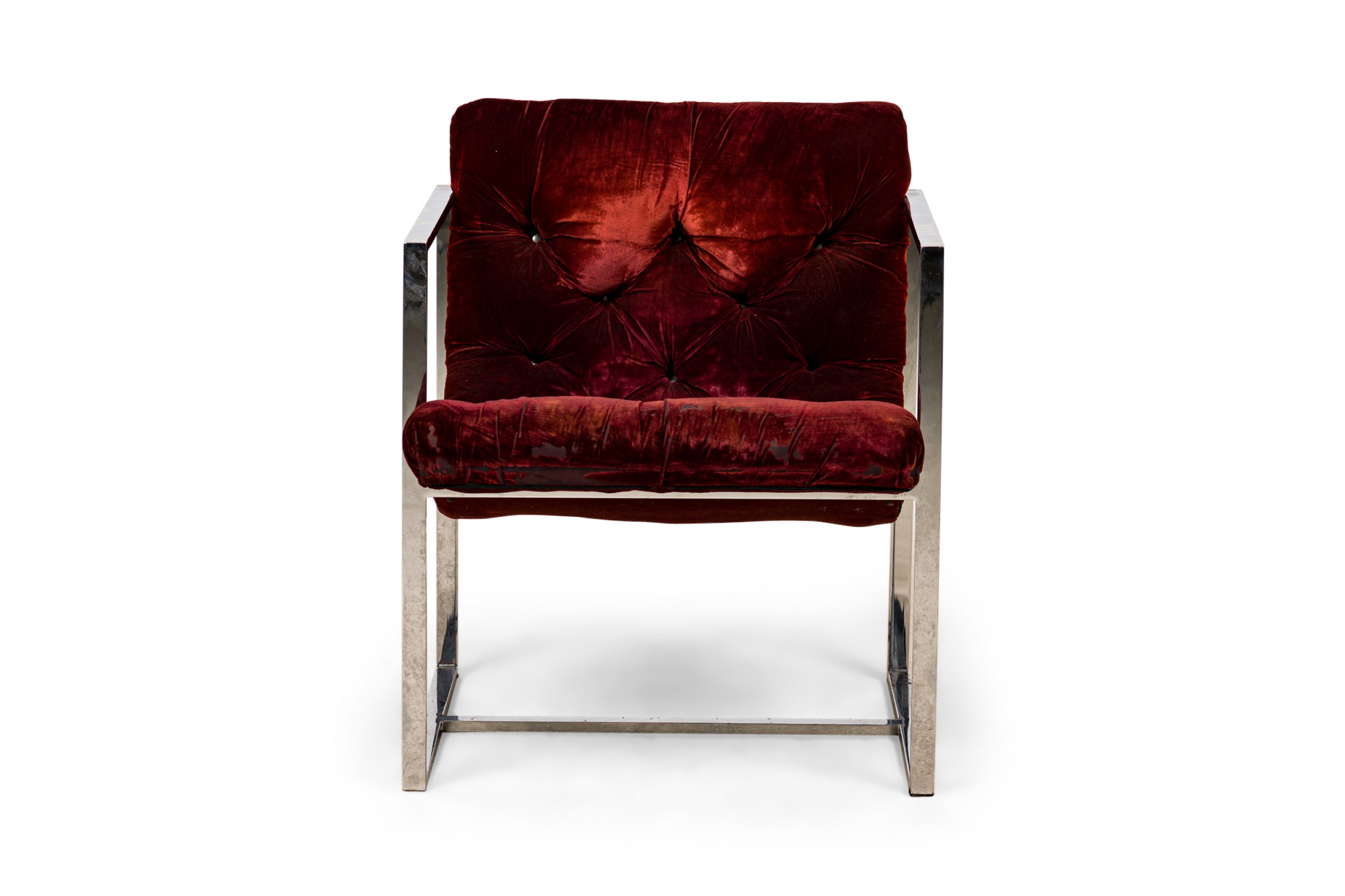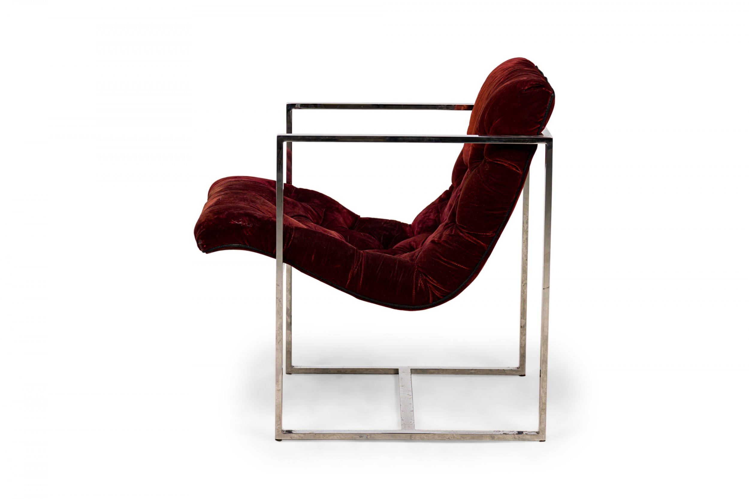 2 American Mid-Century scoop-form armchairs with dark crimson crushed velvet button tufted upholstery and think square tube chrome frames. (PRICED EACH)