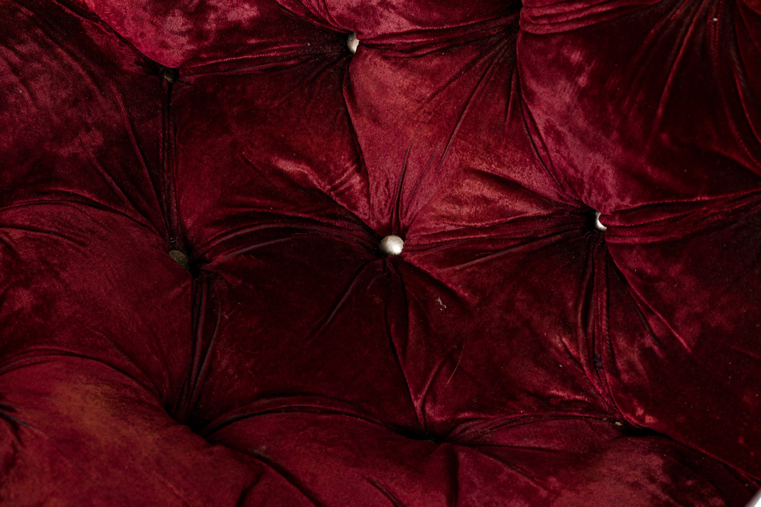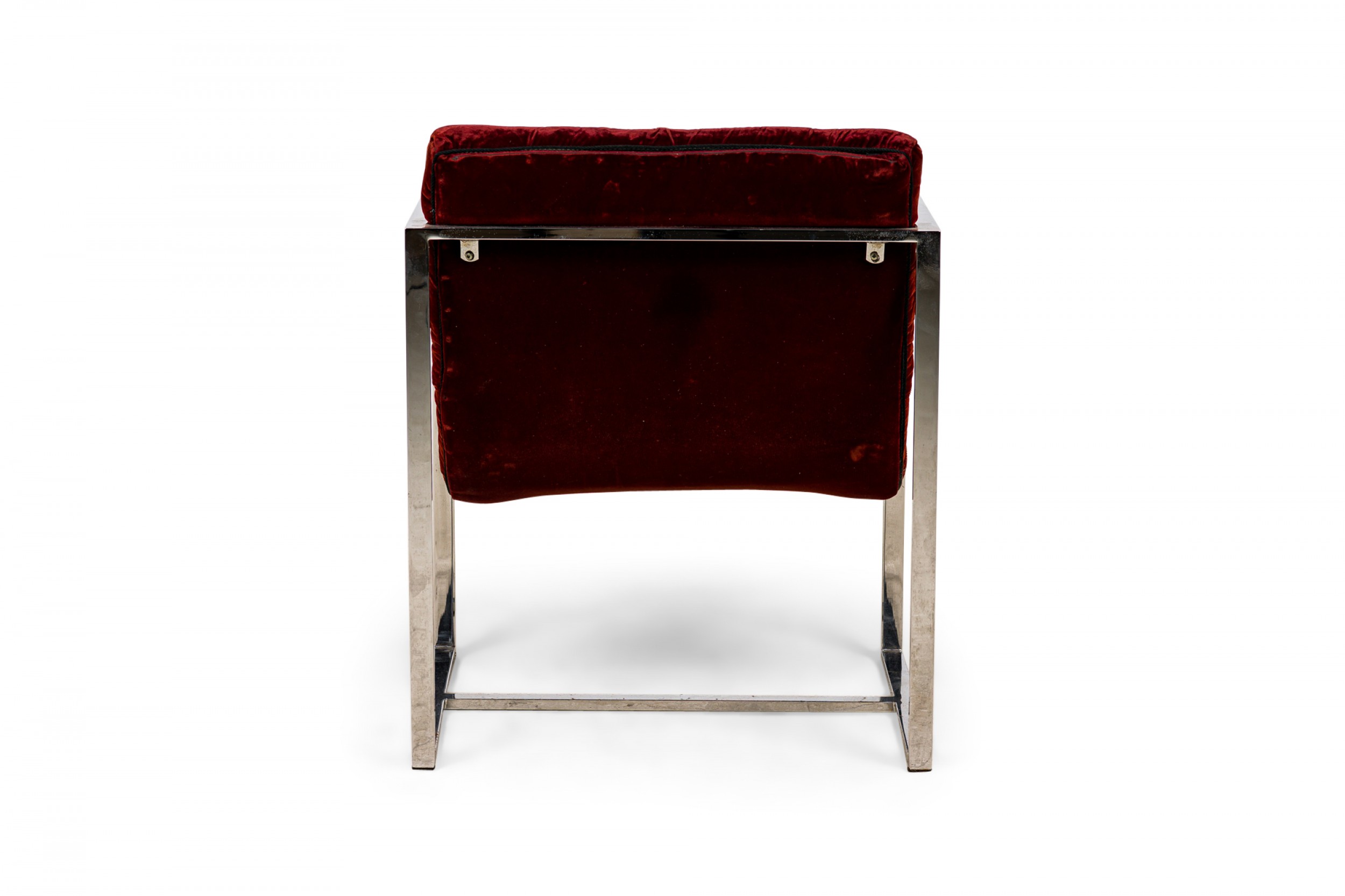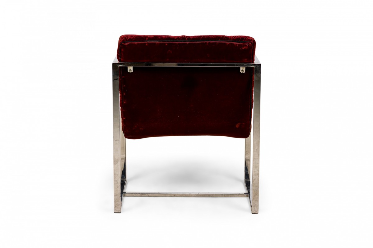 2 American Mid-Century scoop-form armchairs with dark crimson crushed velvet button tufted upholstery and think square tube chrome frames. (PRICED EACH)