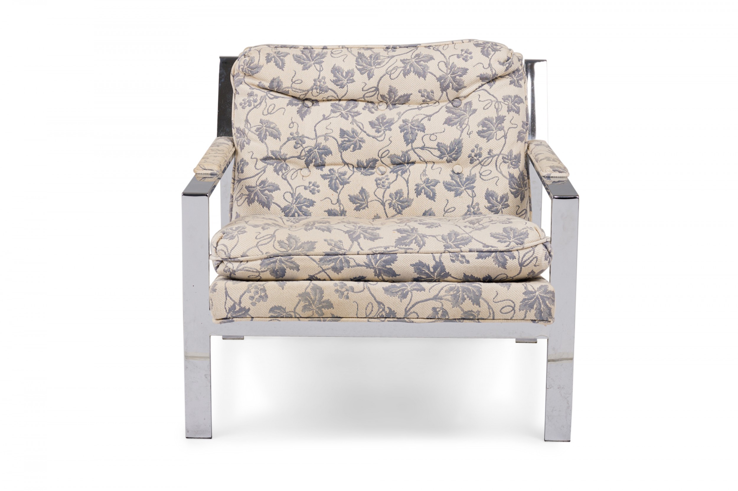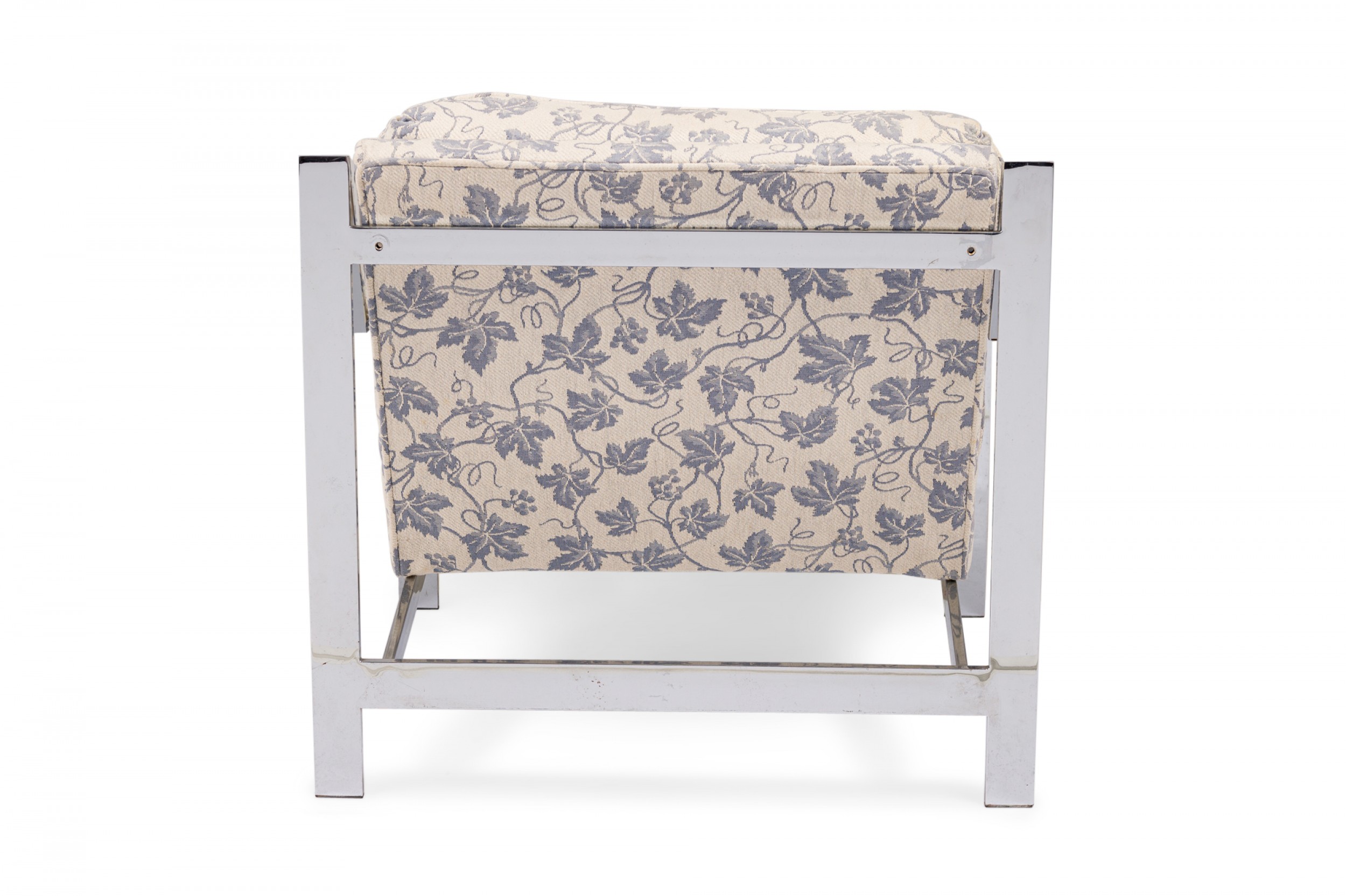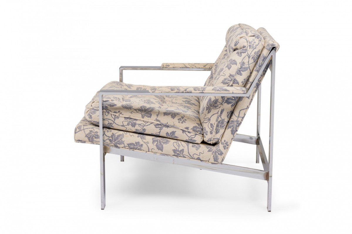 2 American Mid-Century lounge armchairs with polished chrome flat bar frames, upholstered in a beige and blue ivy patterned fabric. (PRICED EACH)(Similar chairs: DUF0536, DUF0538A)
