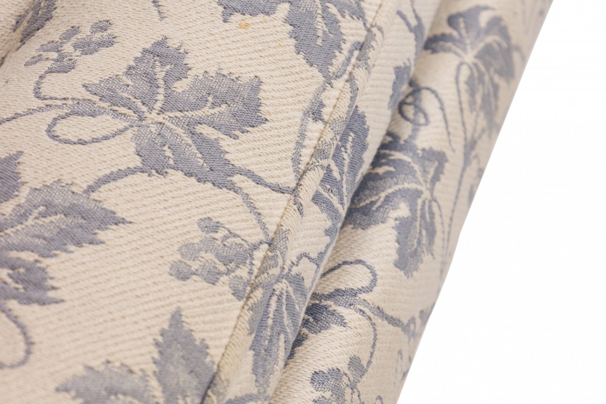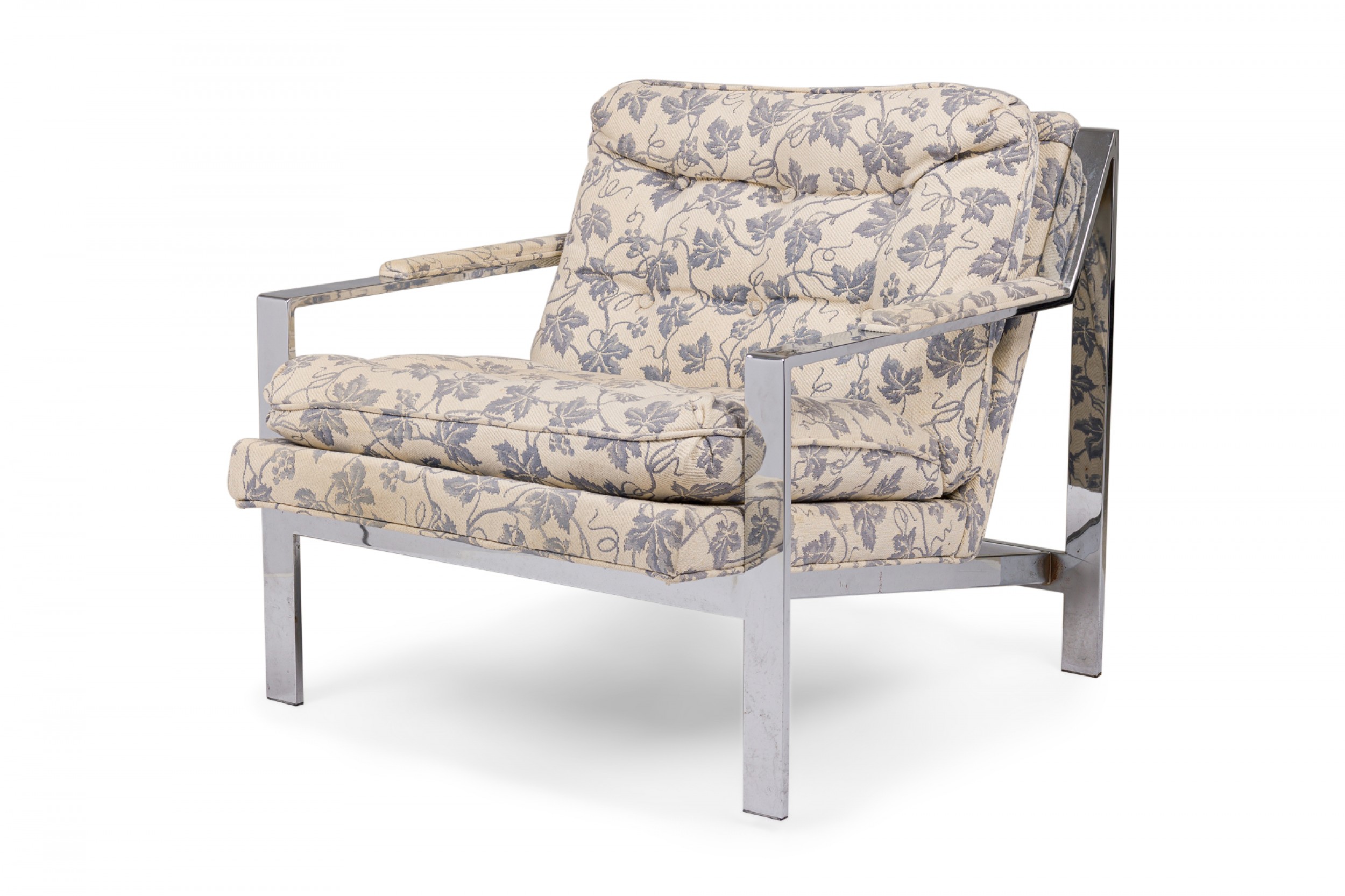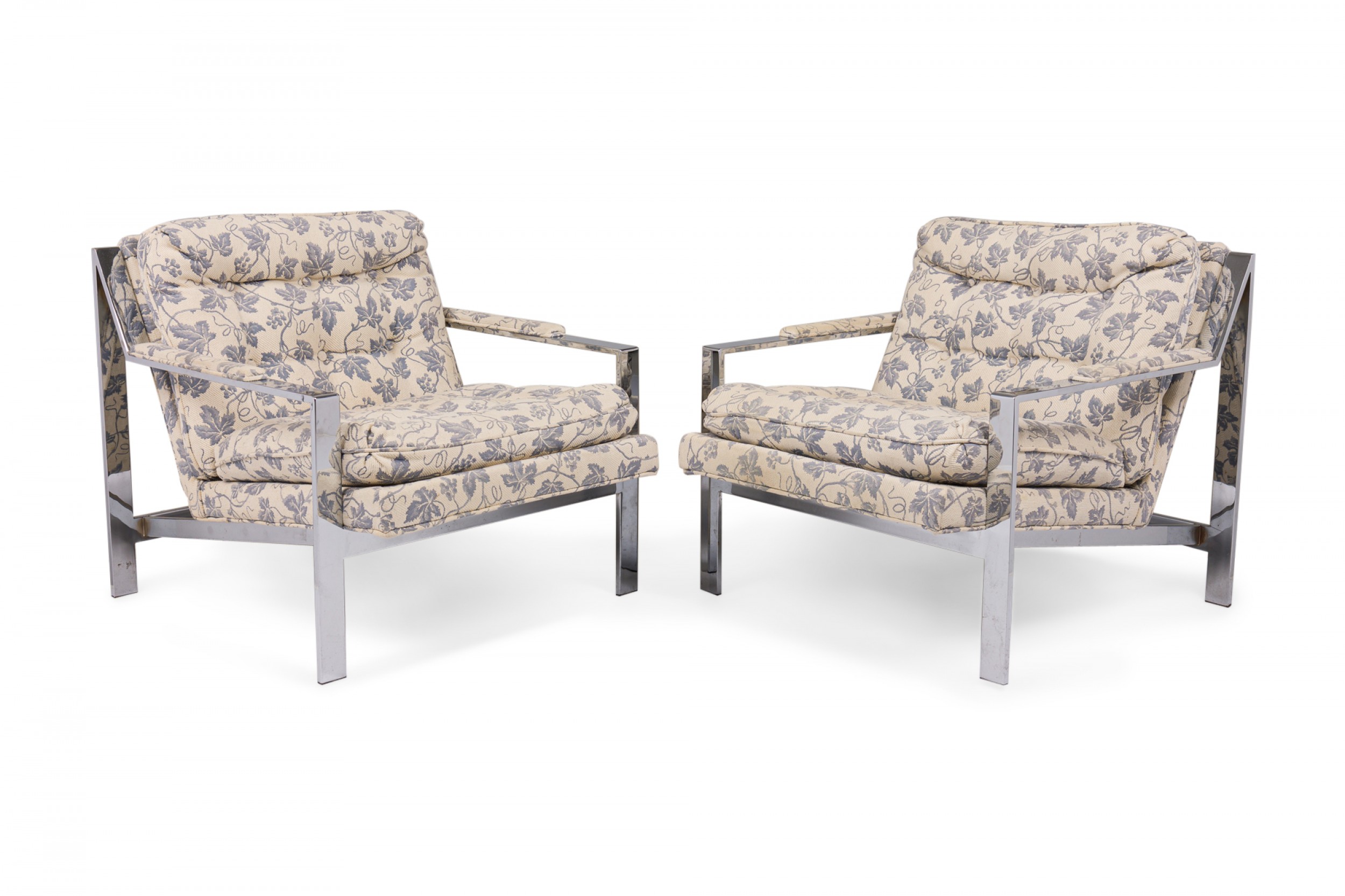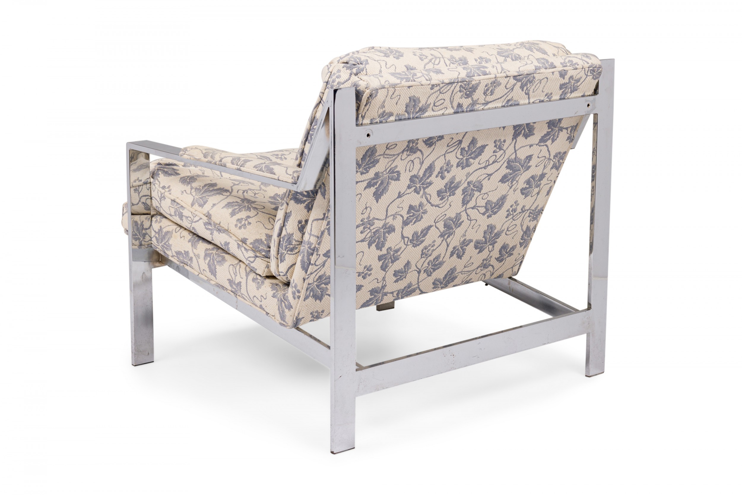 2 American Mid-Century lounge armchairs with polished chrome flat bar frames, upholstered in a beige and blue ivy patterned fabric. (PRICED EACH)(Similar chairs: DUF0536, DUF0538A)