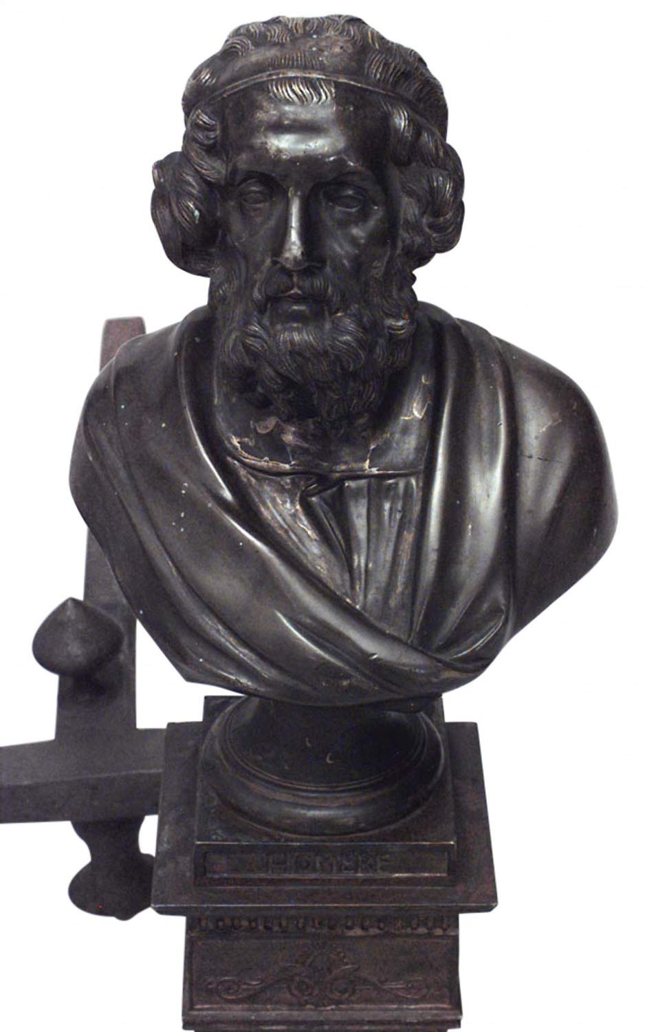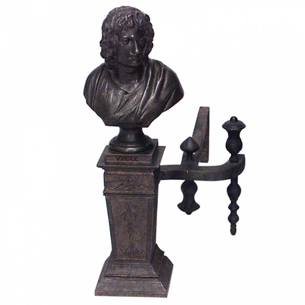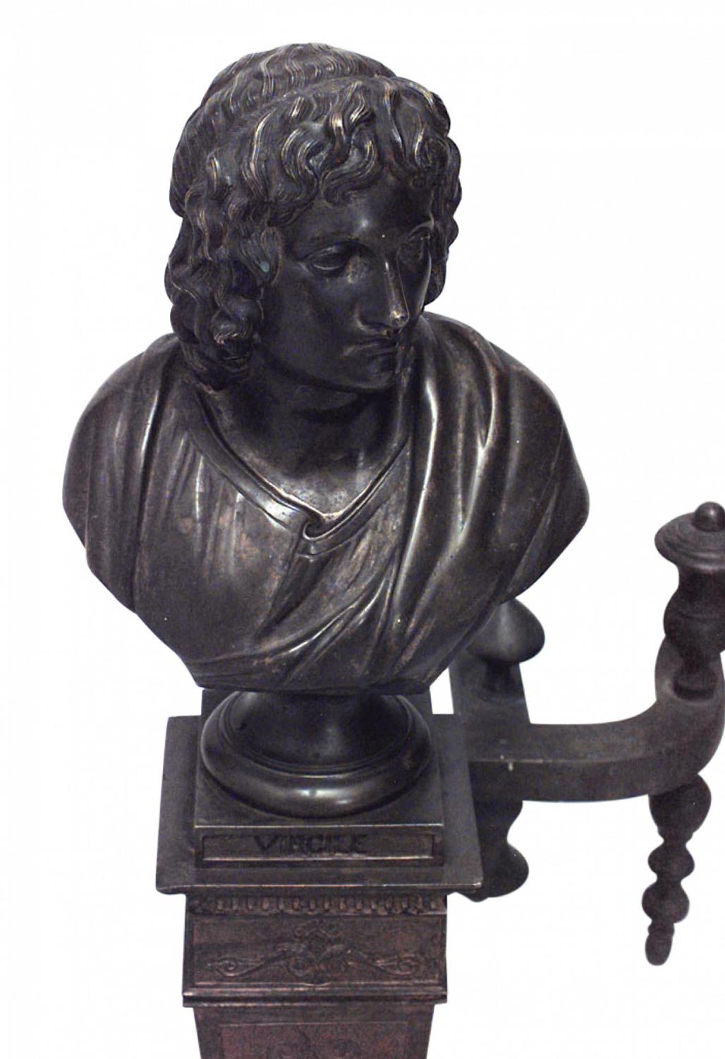 PAIR of Italian Neo-classic-style (19th Century) bronze andirons of busts of Homer and Virgil on etched pedestal bases (PRICED AS PAIR)