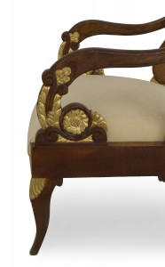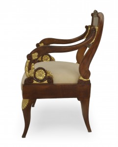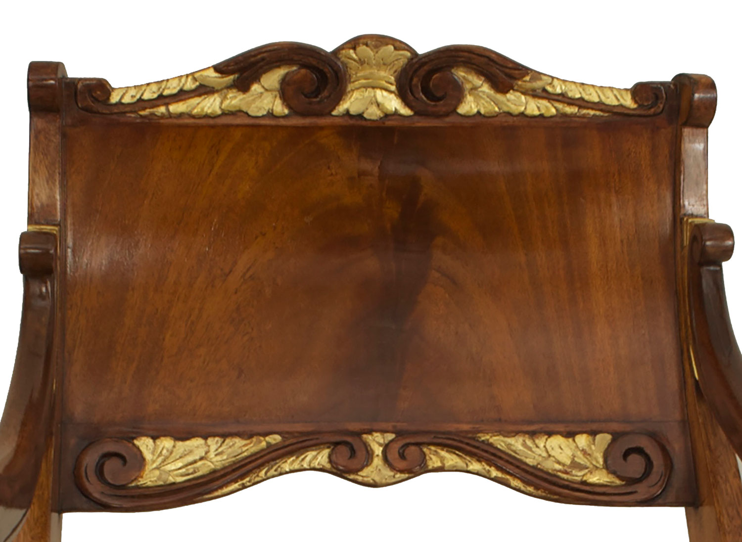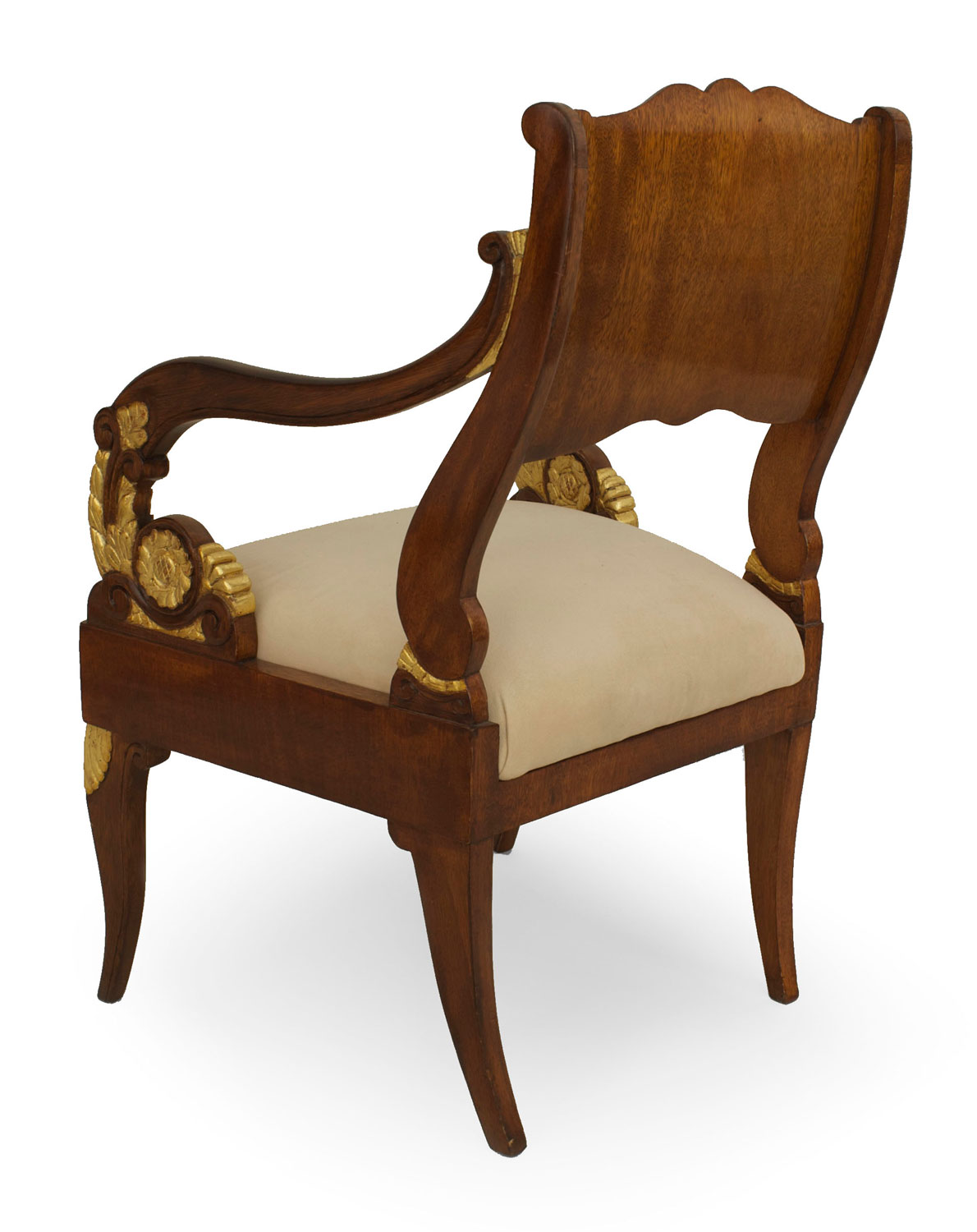 2 Russian (19th Cent) mahogany open scroll design arm chairs with gilt carved trim on back and arms and an upholstered seat (PRICED EACH)