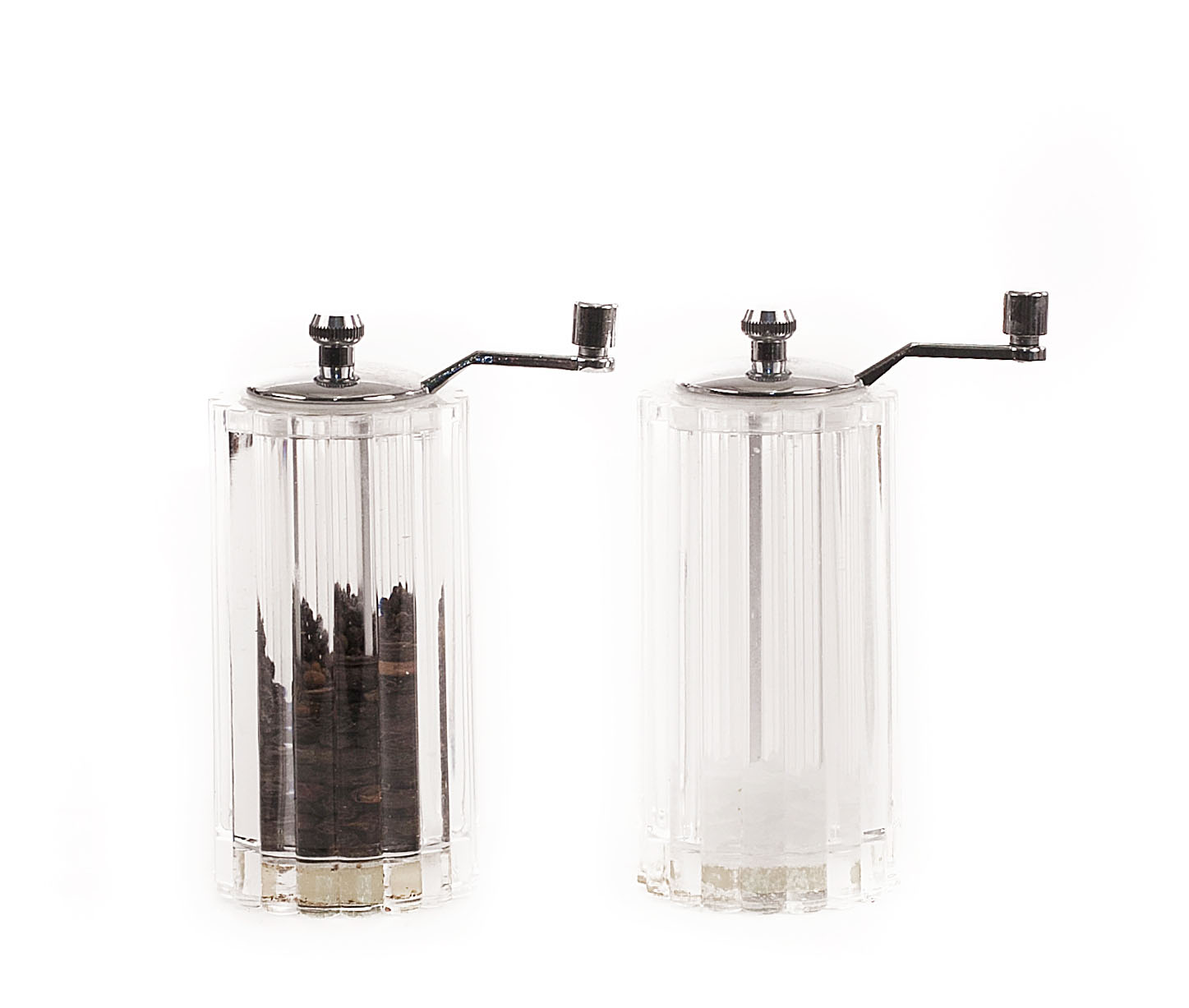 Pair of vertically ribbed glass salt and pepper grinders with silver handles (PRICED AS PAIR)