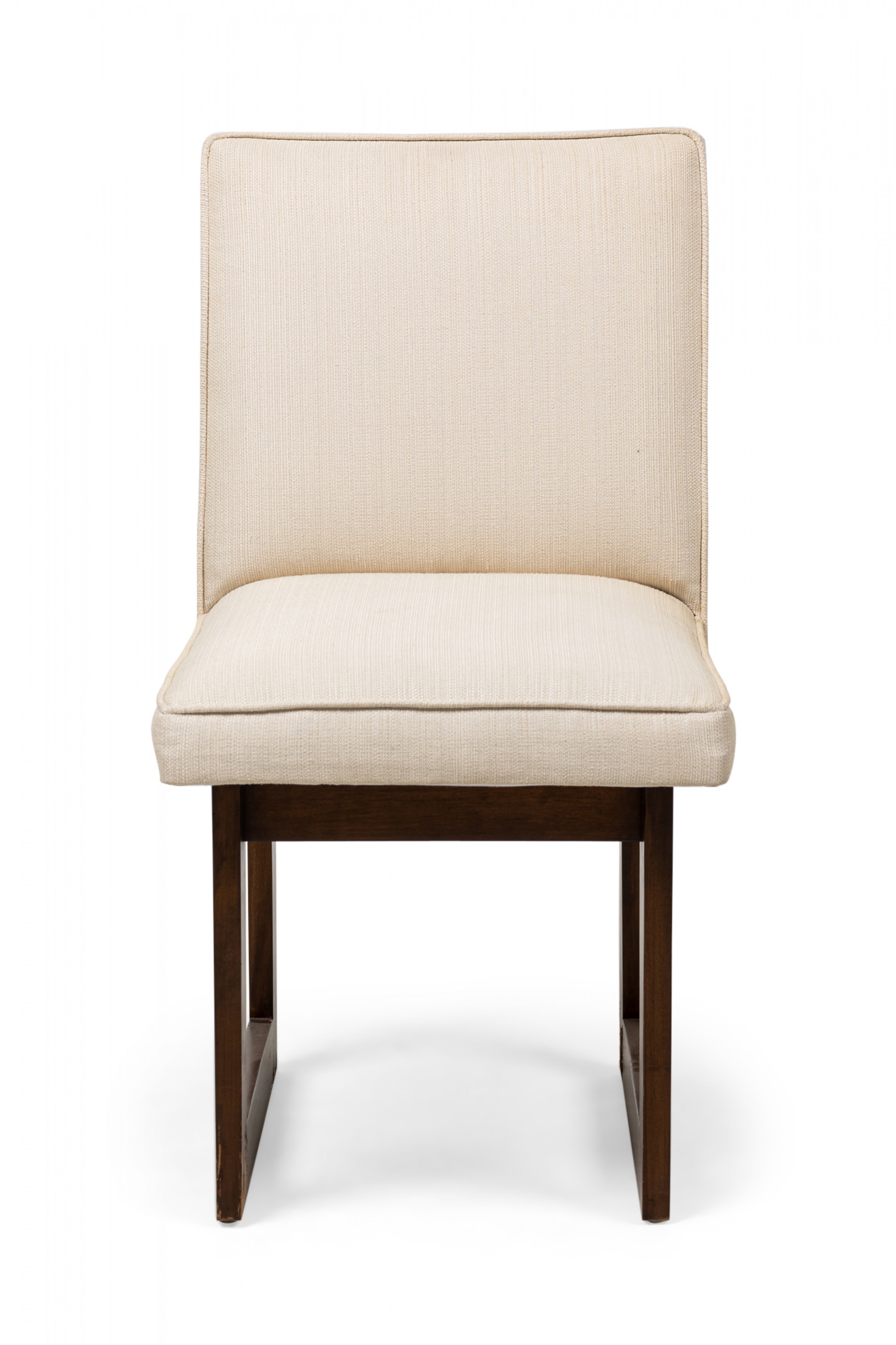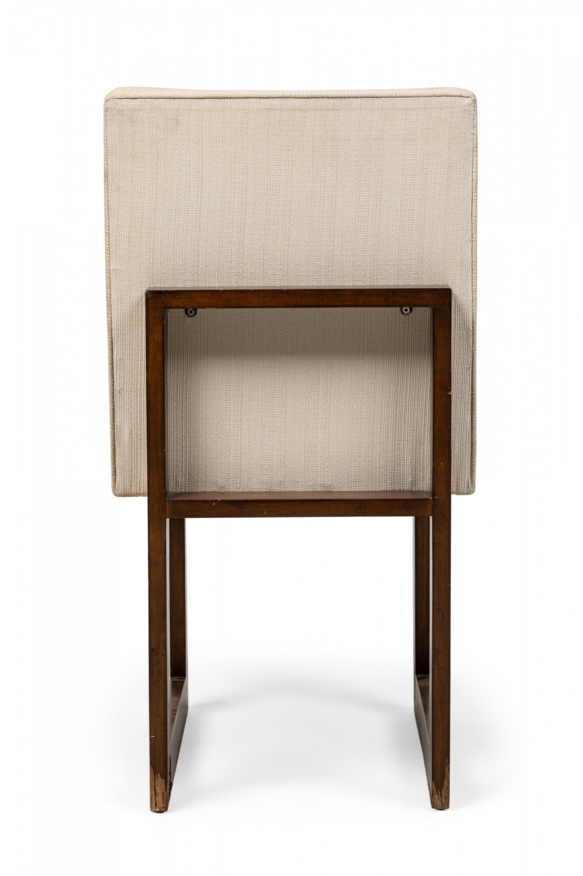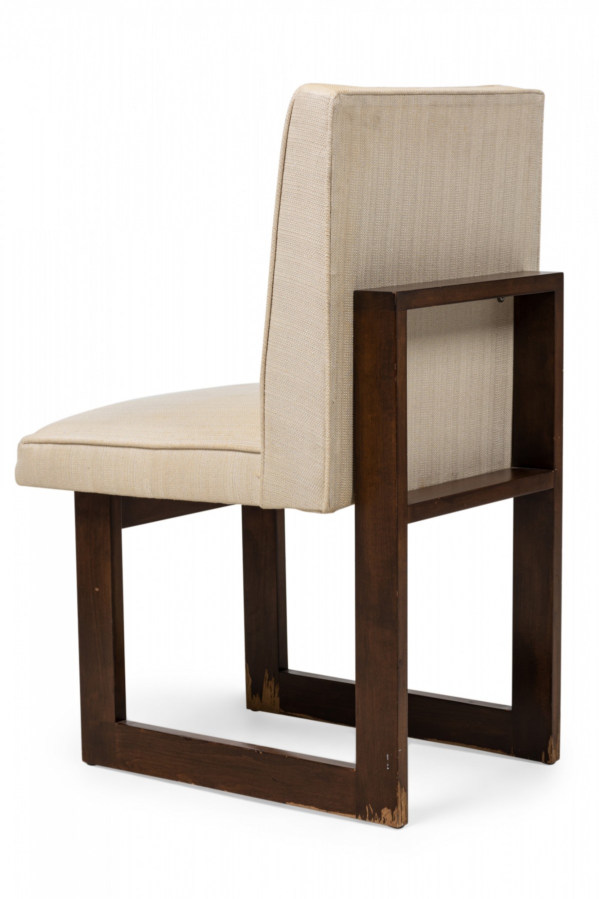 2 Contemporary American dining chairs feature a flattened minimalist openwork frame with back and seat anchored to the front and back supports, upholstered in a textured beige fabric. (PRICED EACH)