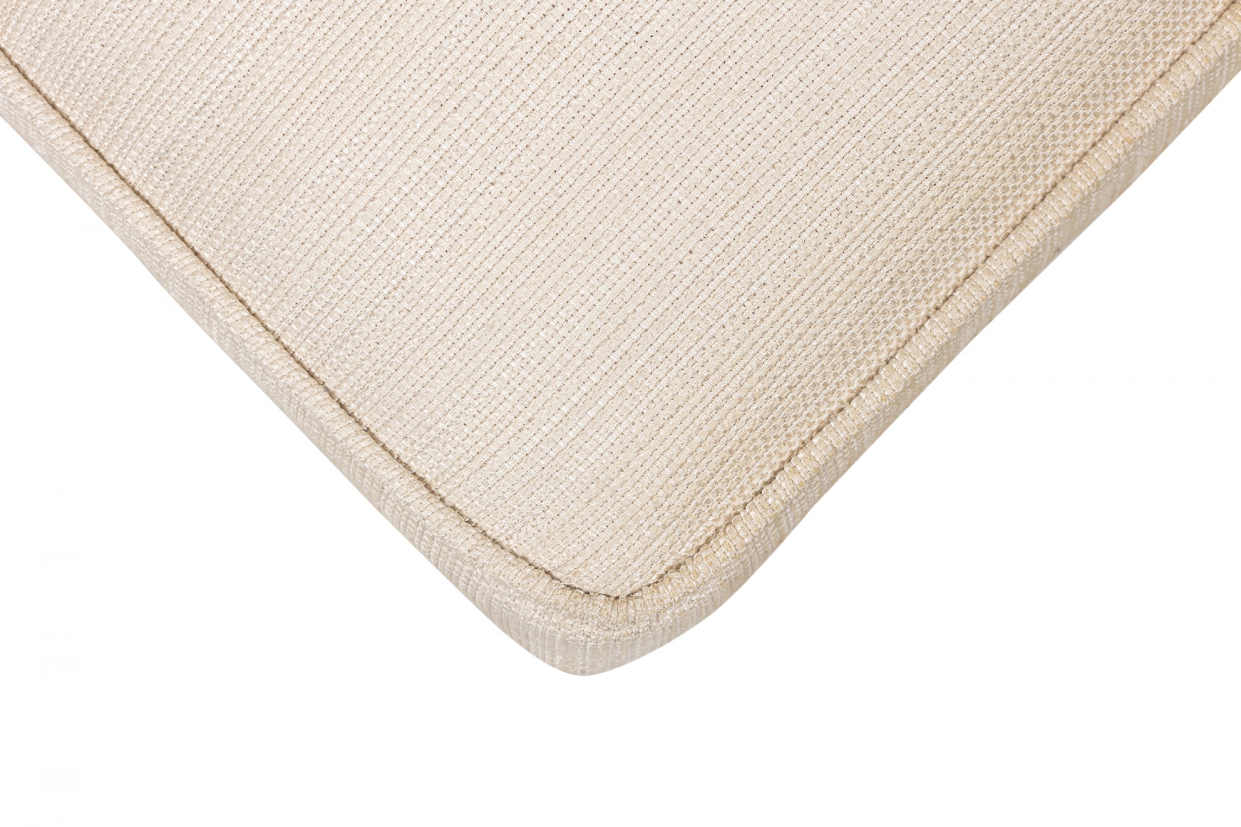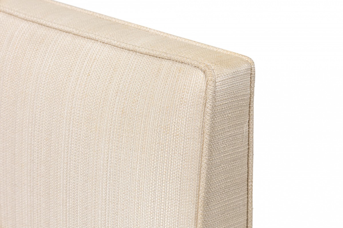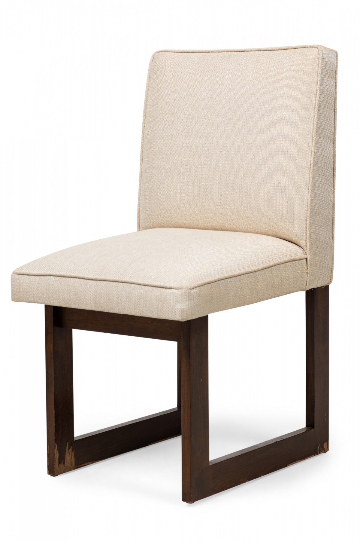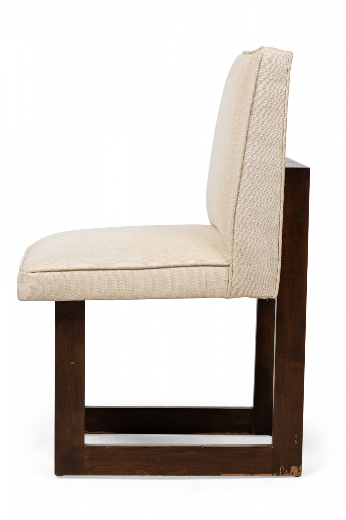 2 Contemporary American dining chairs feature a flattened minimalist openwork frame with back and seat anchored to the front and back supports, upholstered in a textured beige fabric. (PRICED EACH)