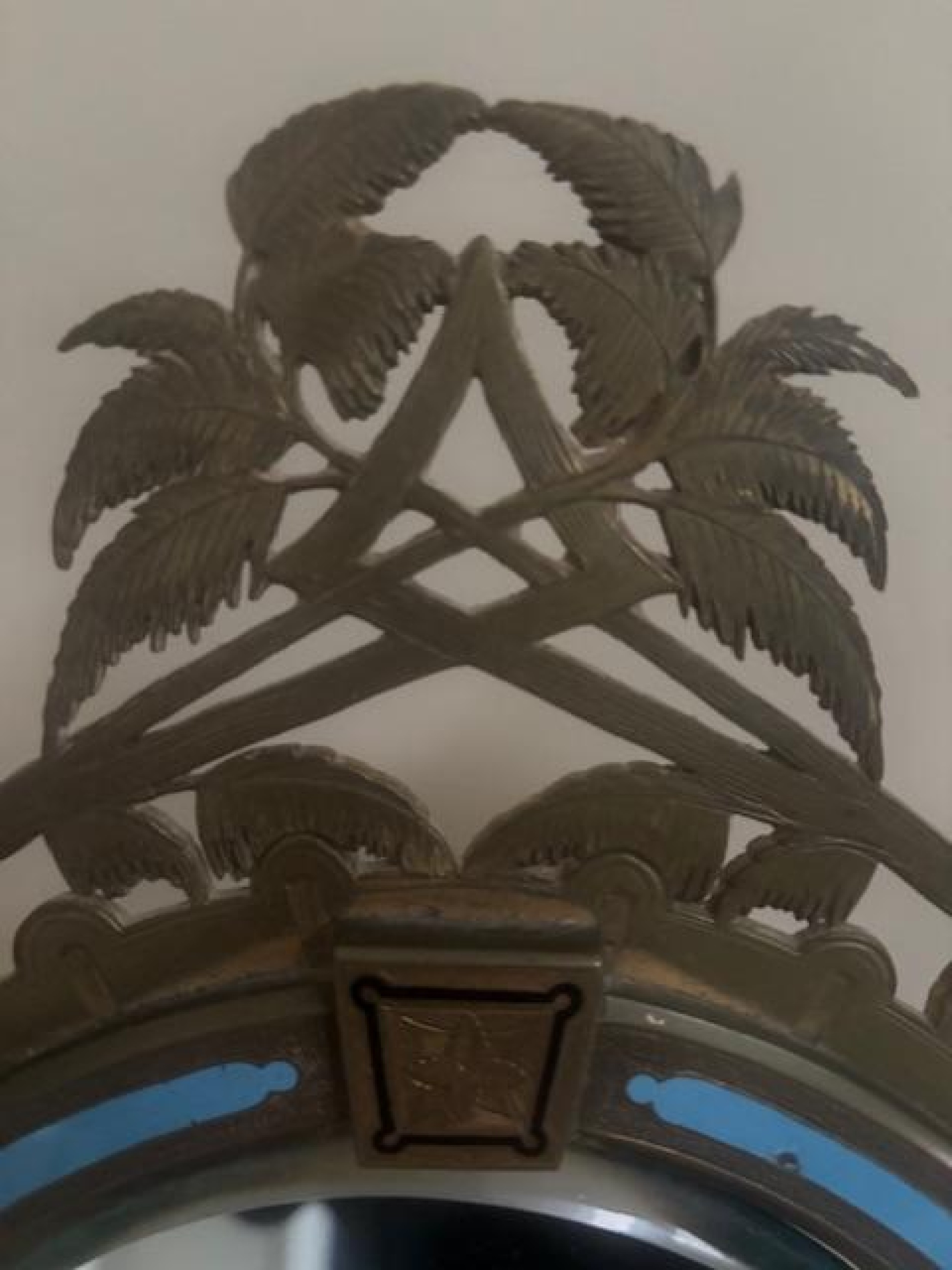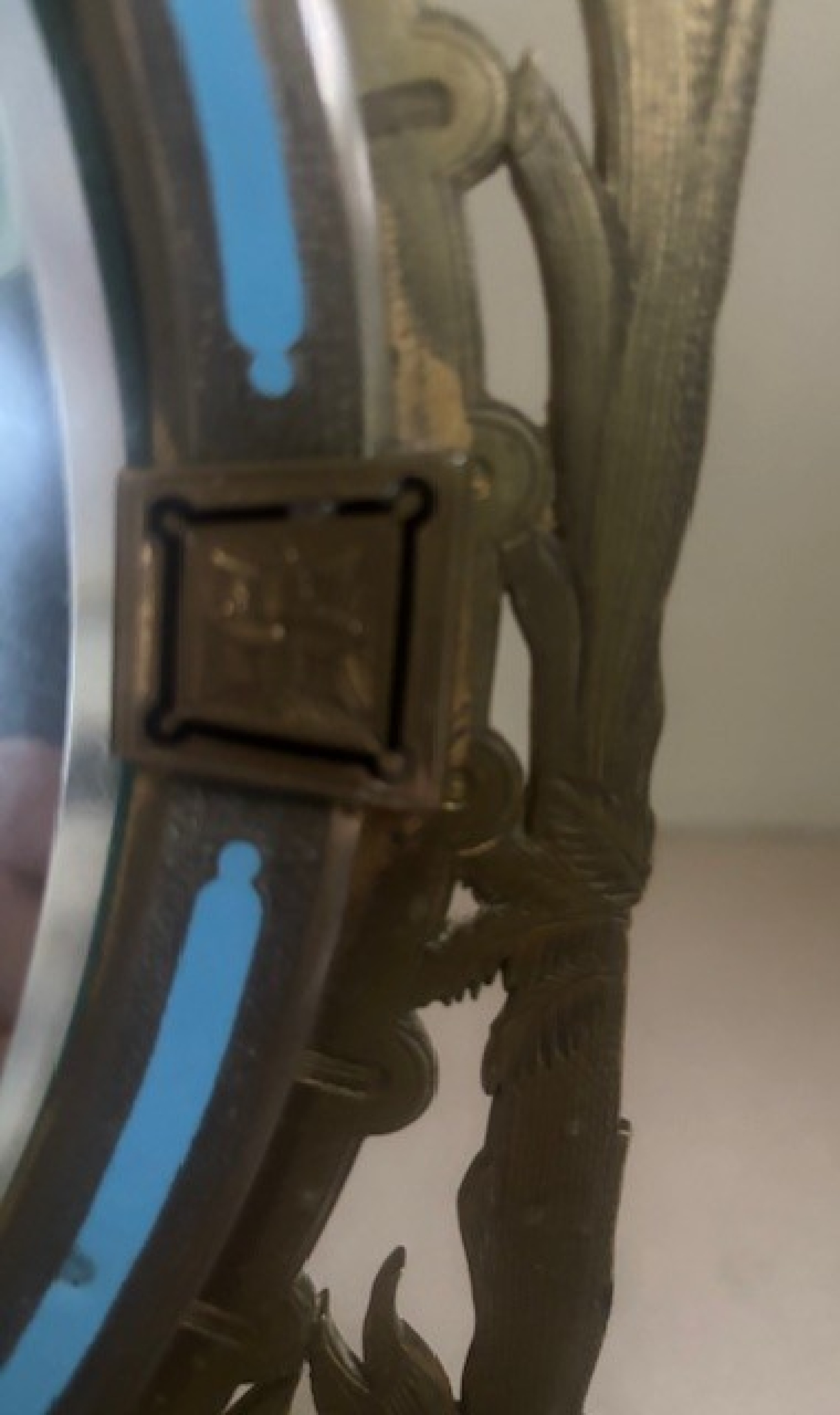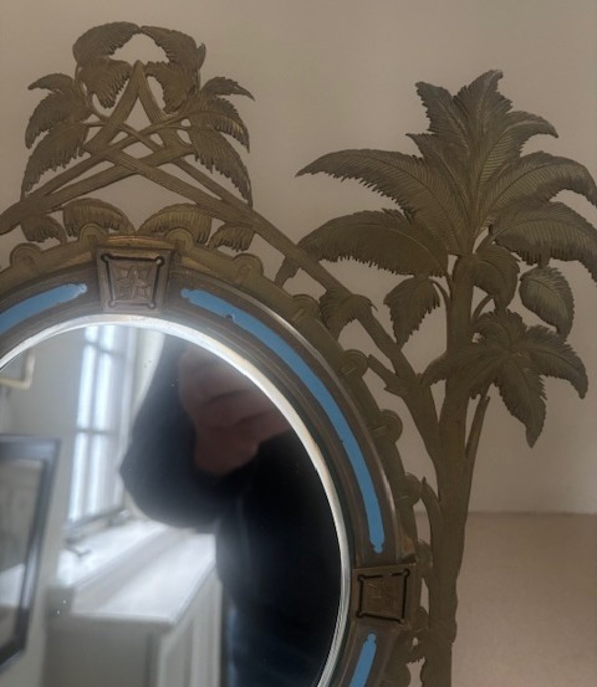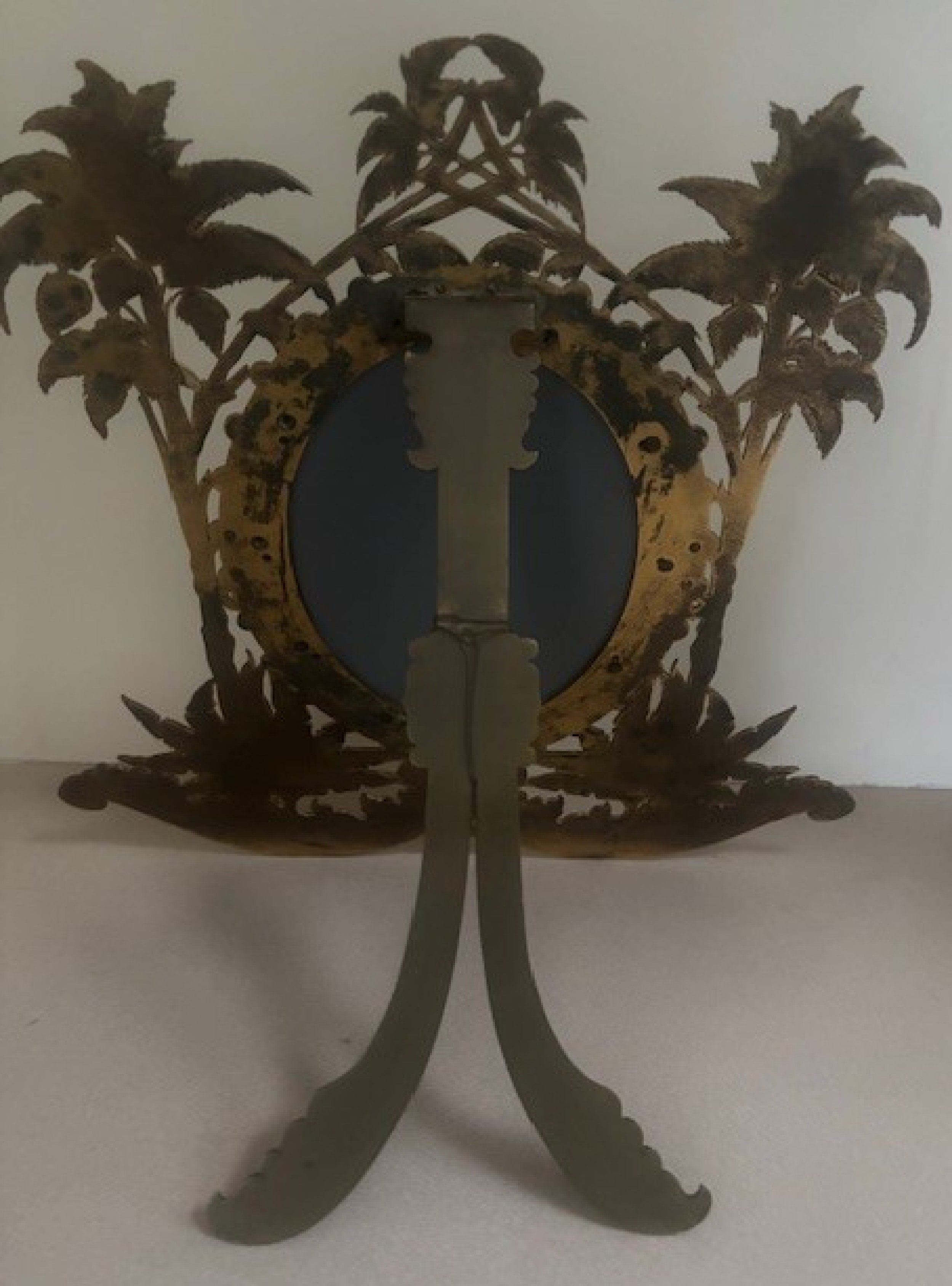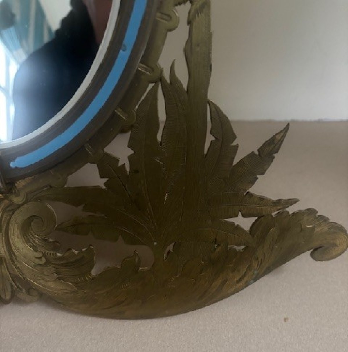 French Victorian bronze dressing table mirror having a filigree palm tree and floral design frame centering an oval mirror with blue enamel trim