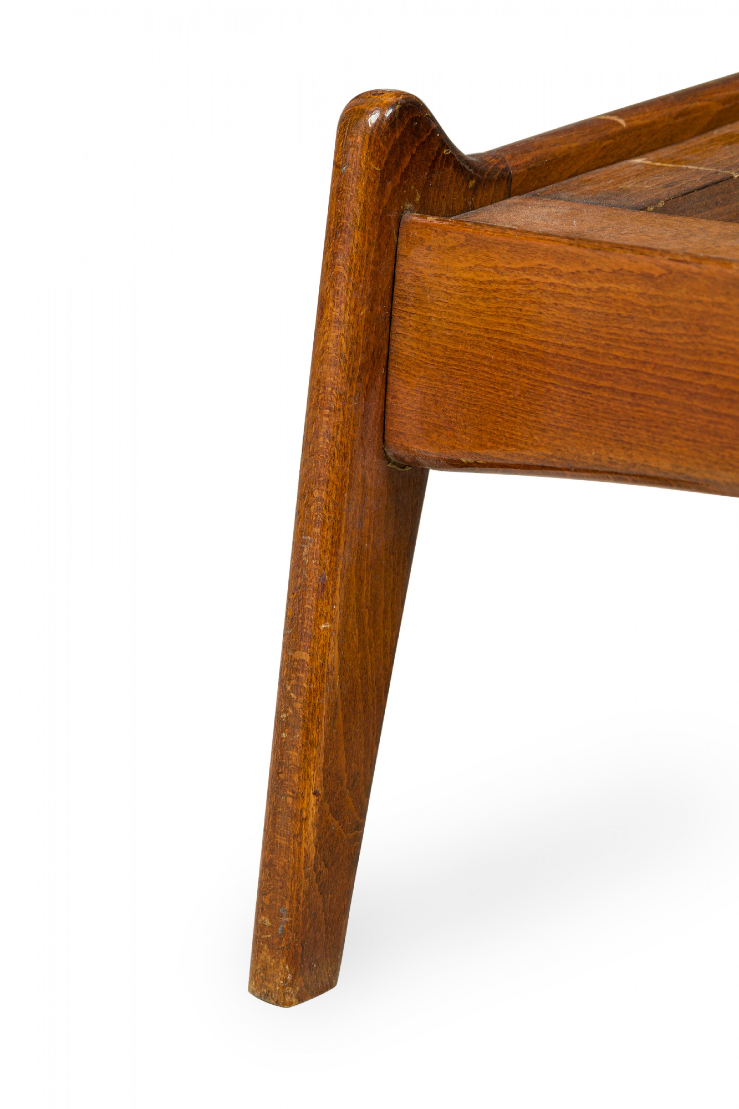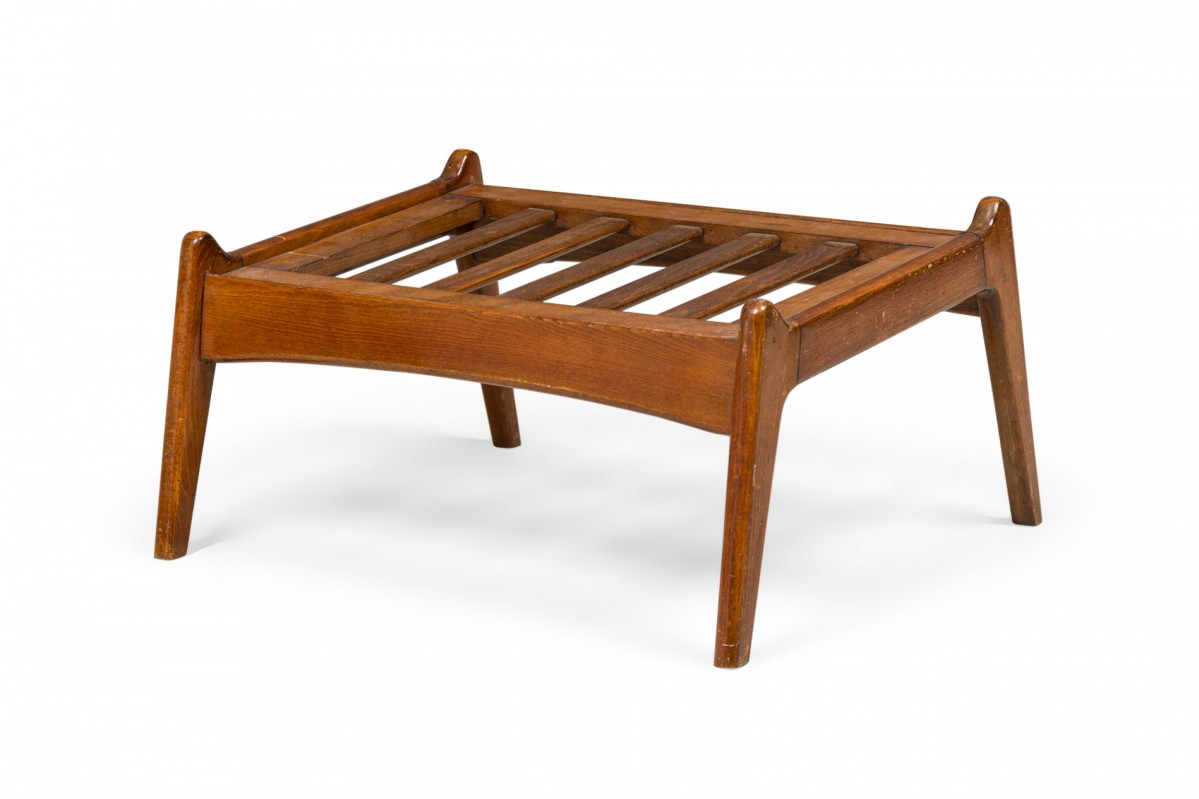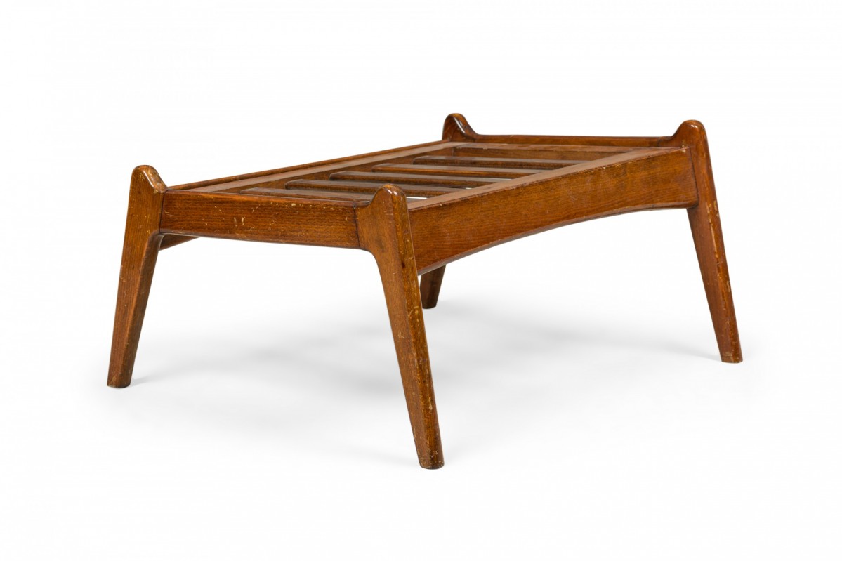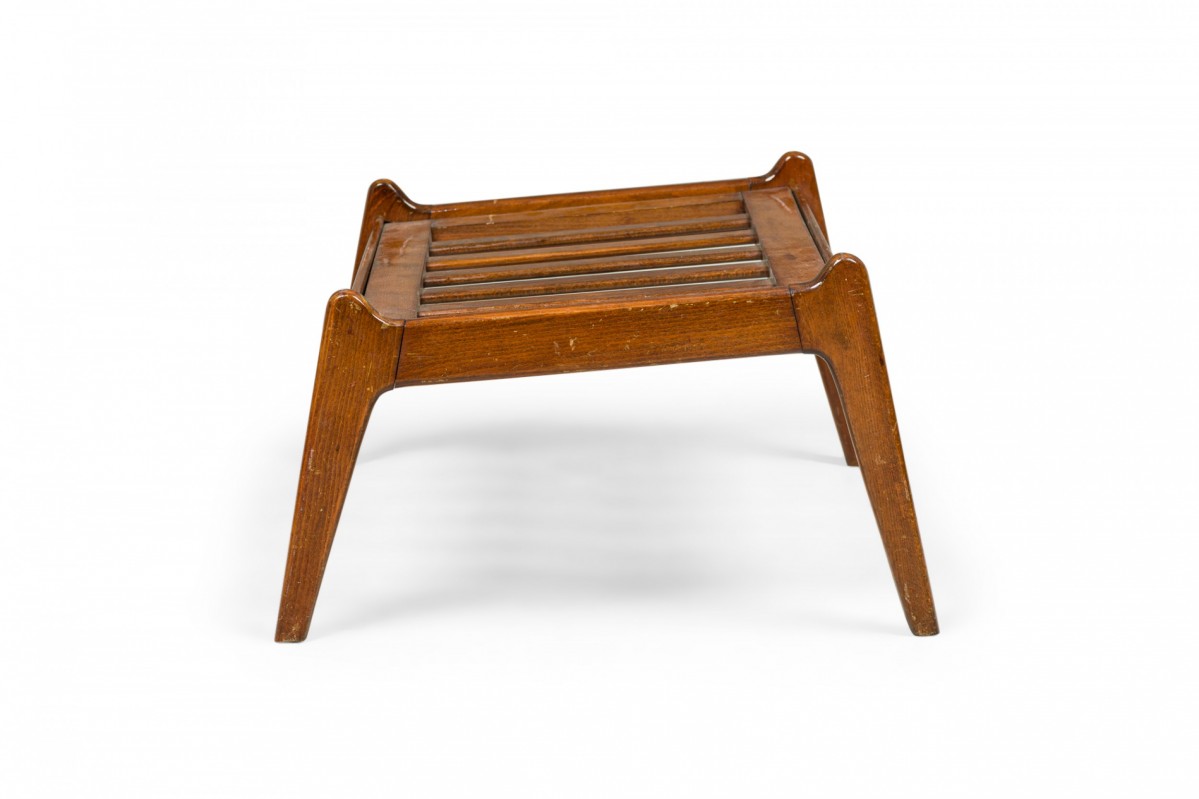 Italian Mid-Century walnut ottomans with openwork slat tops, resting on four slightly splayed tapered legs