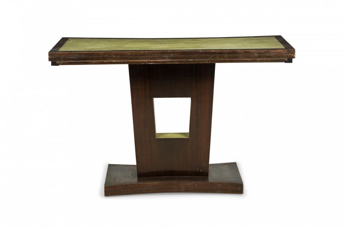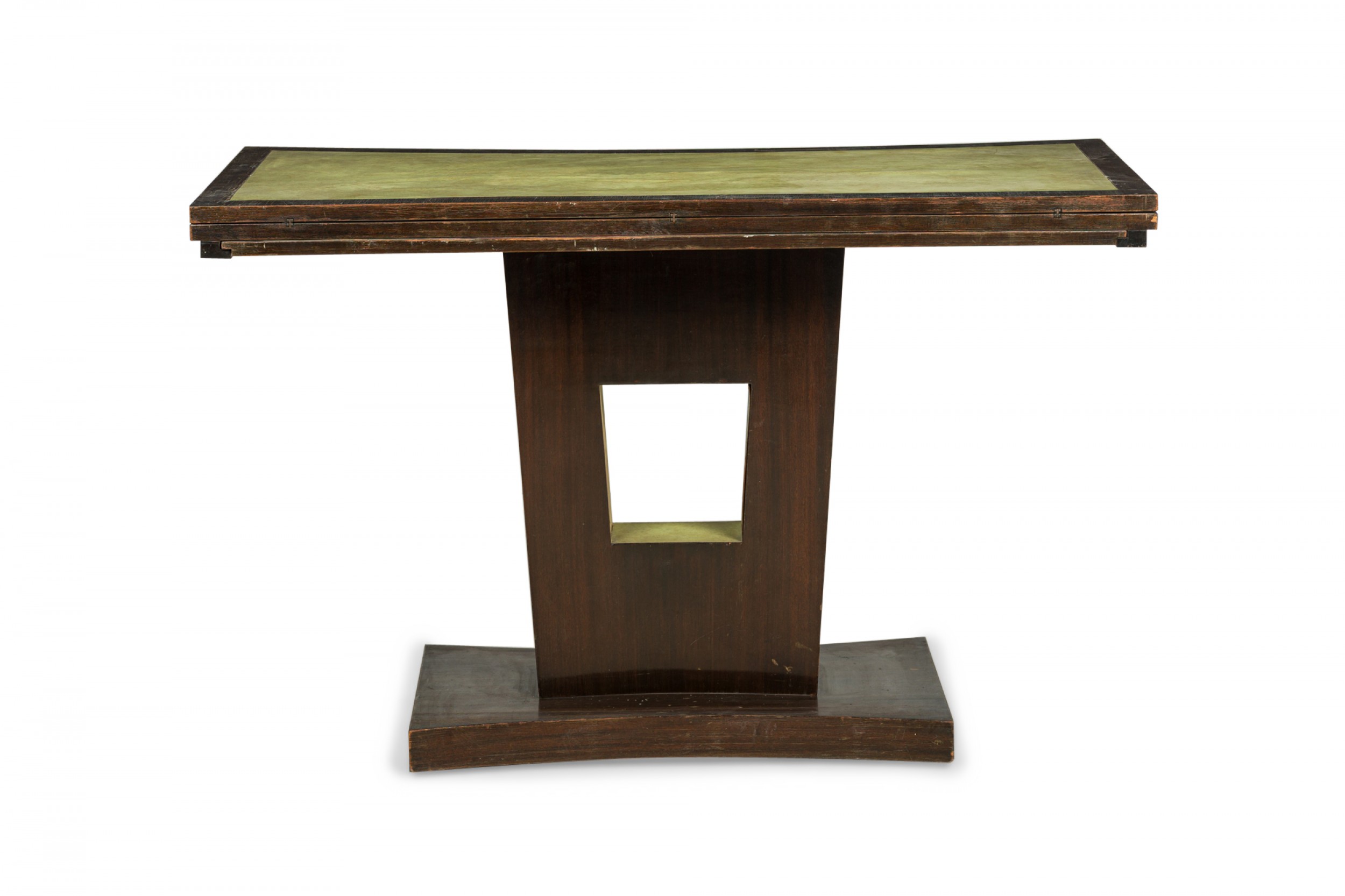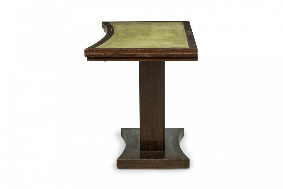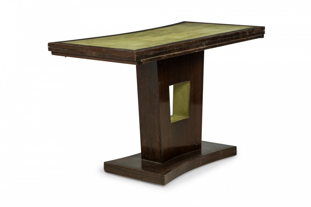 American Art Deco mahogany console table with a rectangular top with one concave side and green leather inset top, which slides and folds open to create a larger surface resting on a curved pedestal base with central square cutout