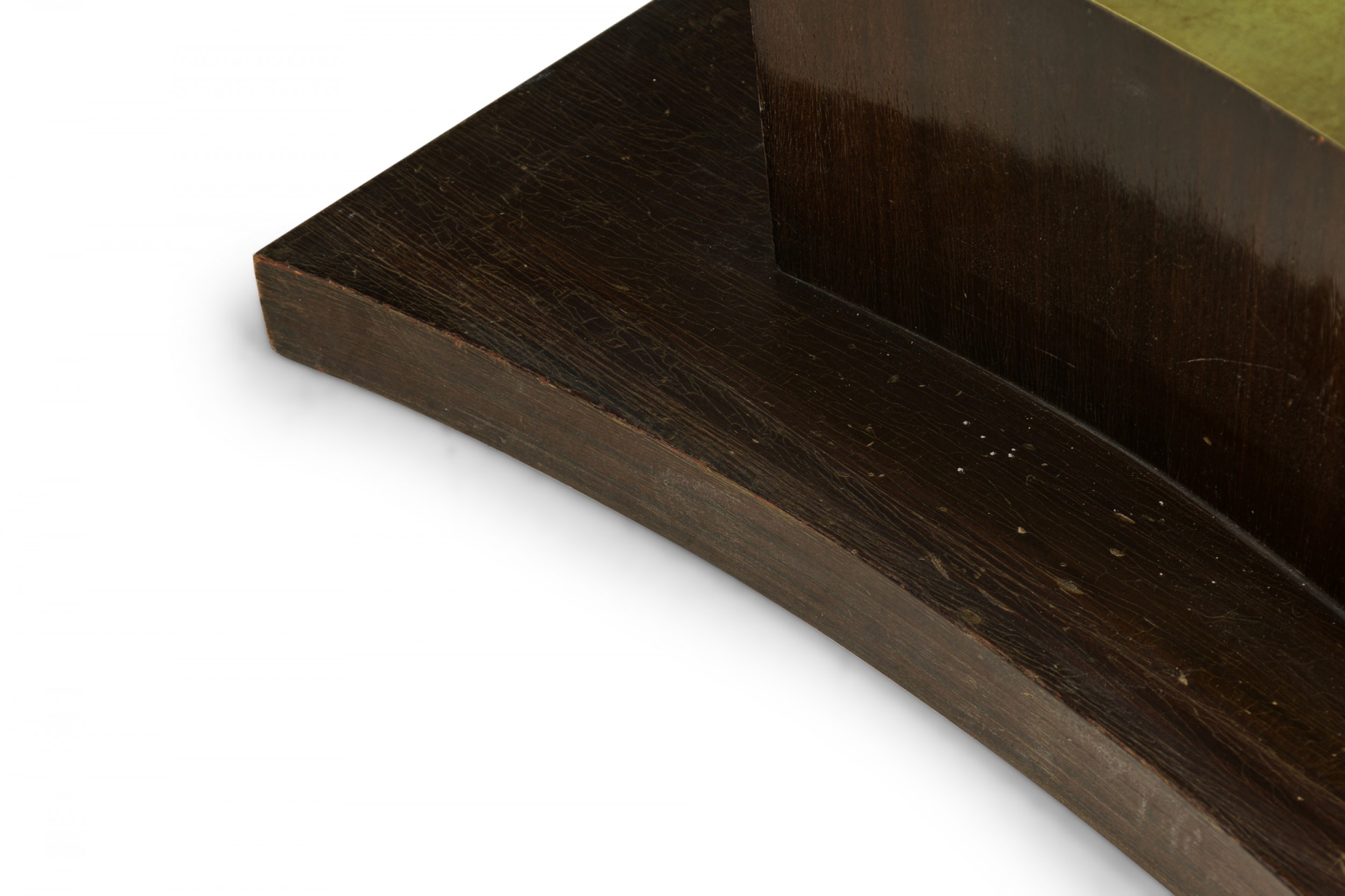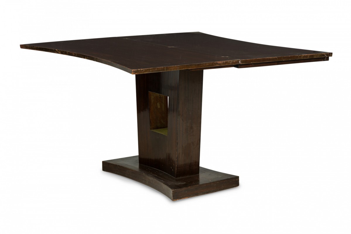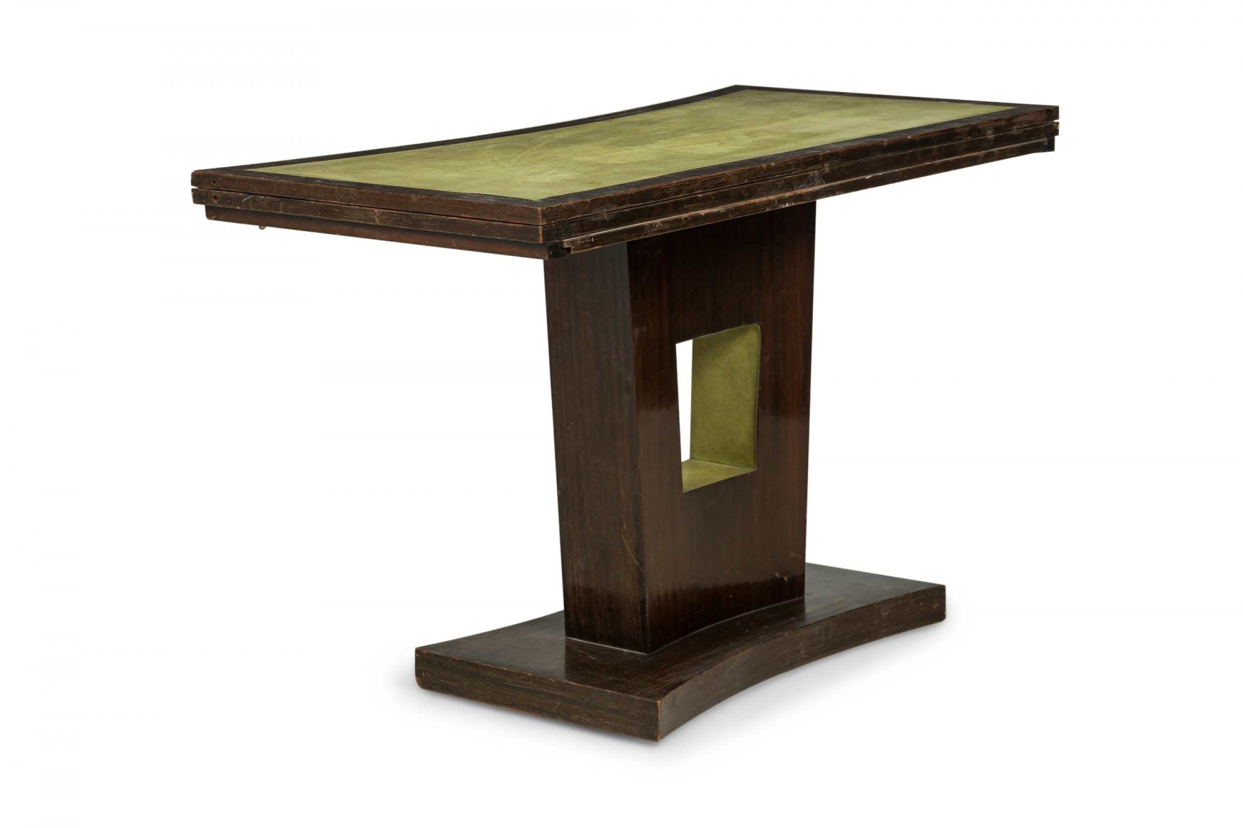 American Art Deco mahogany console table with a rectangular top with one concave side and green leather inset top, which slides and folds open to create a larger surface resting on a curved pedestal base with central square cutout