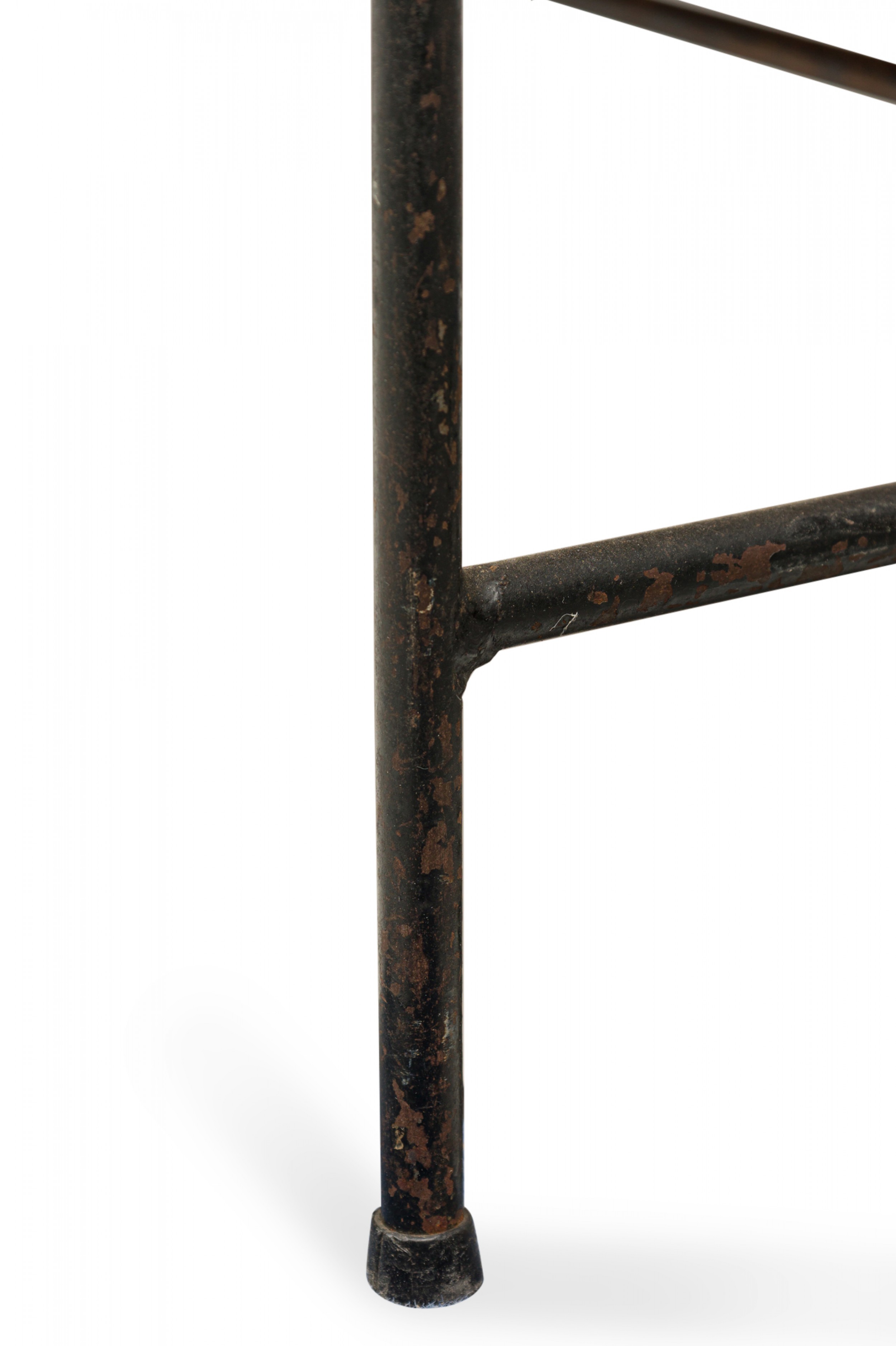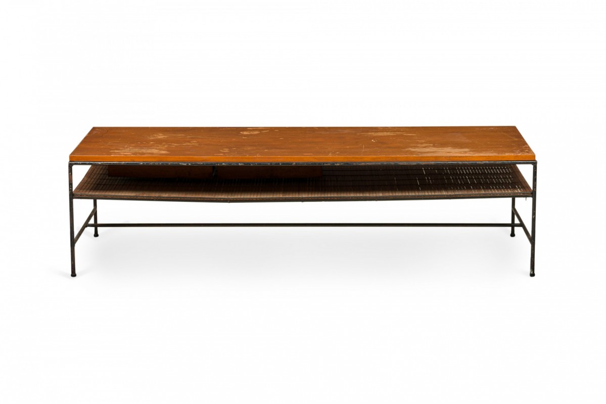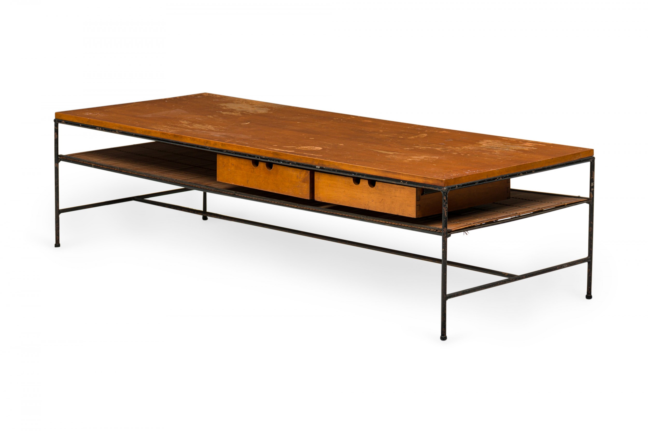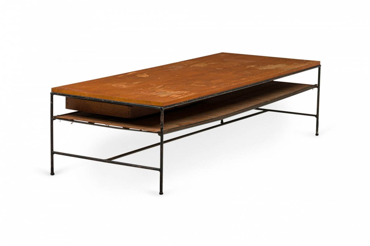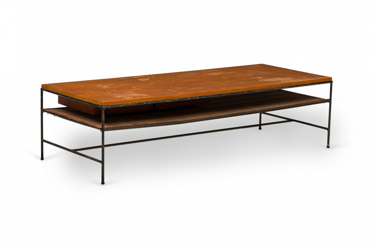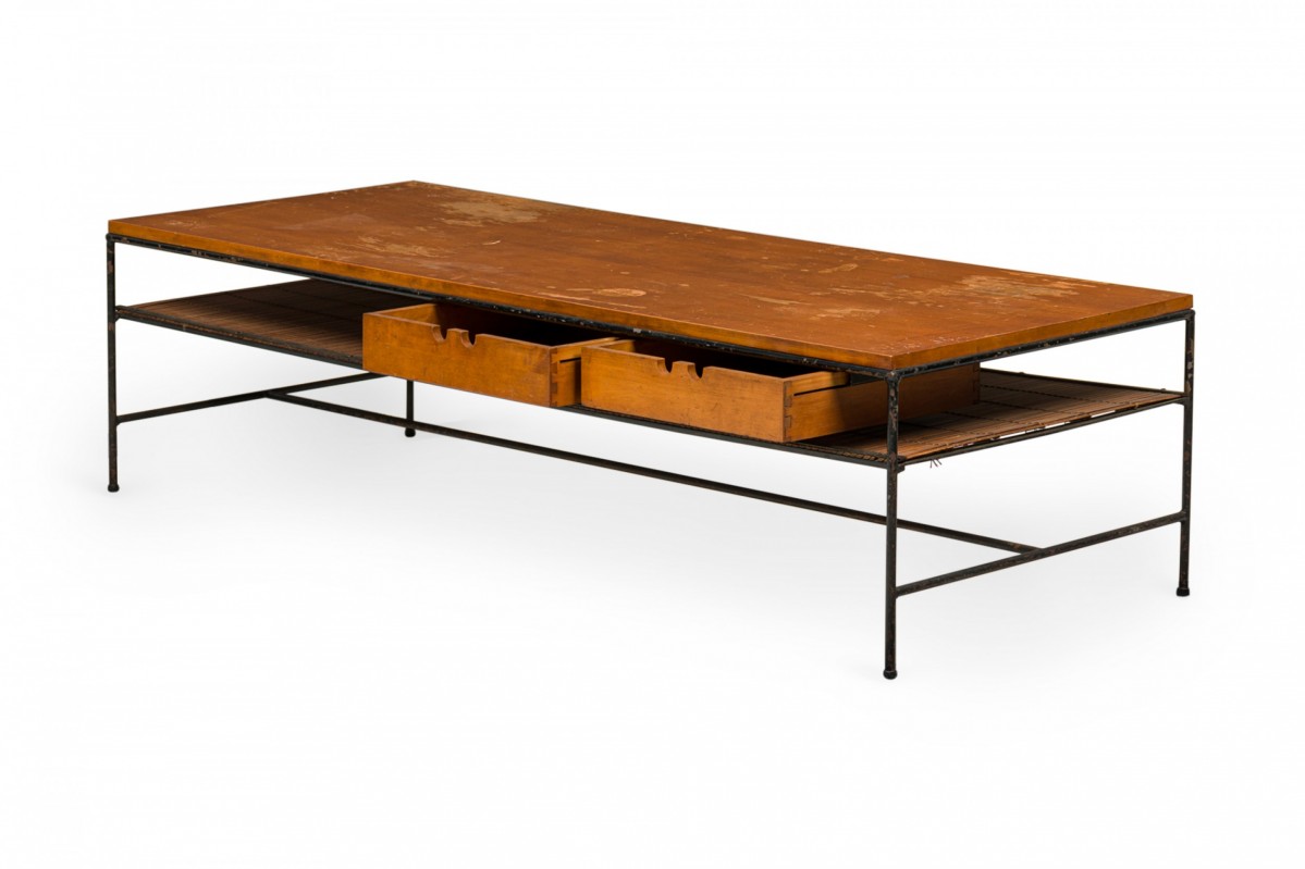 American Mid-Century 'Planner' coffee / cocktail table with a rectangular wooden top with two drawers and a shallow shelf below, supported by a black iron frame with a stretcher base. (Similar table: DUF0769)