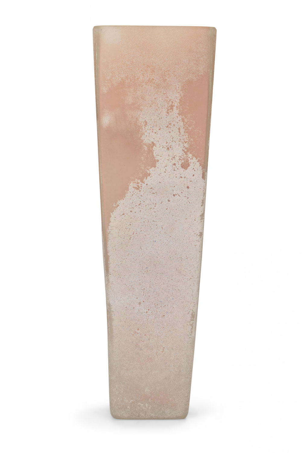 Tall tapered square-based peach-color tinted glass vase with a rough weathered "sea glass" finish