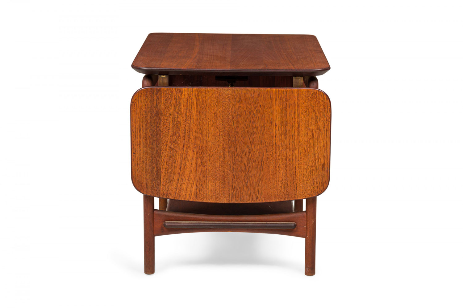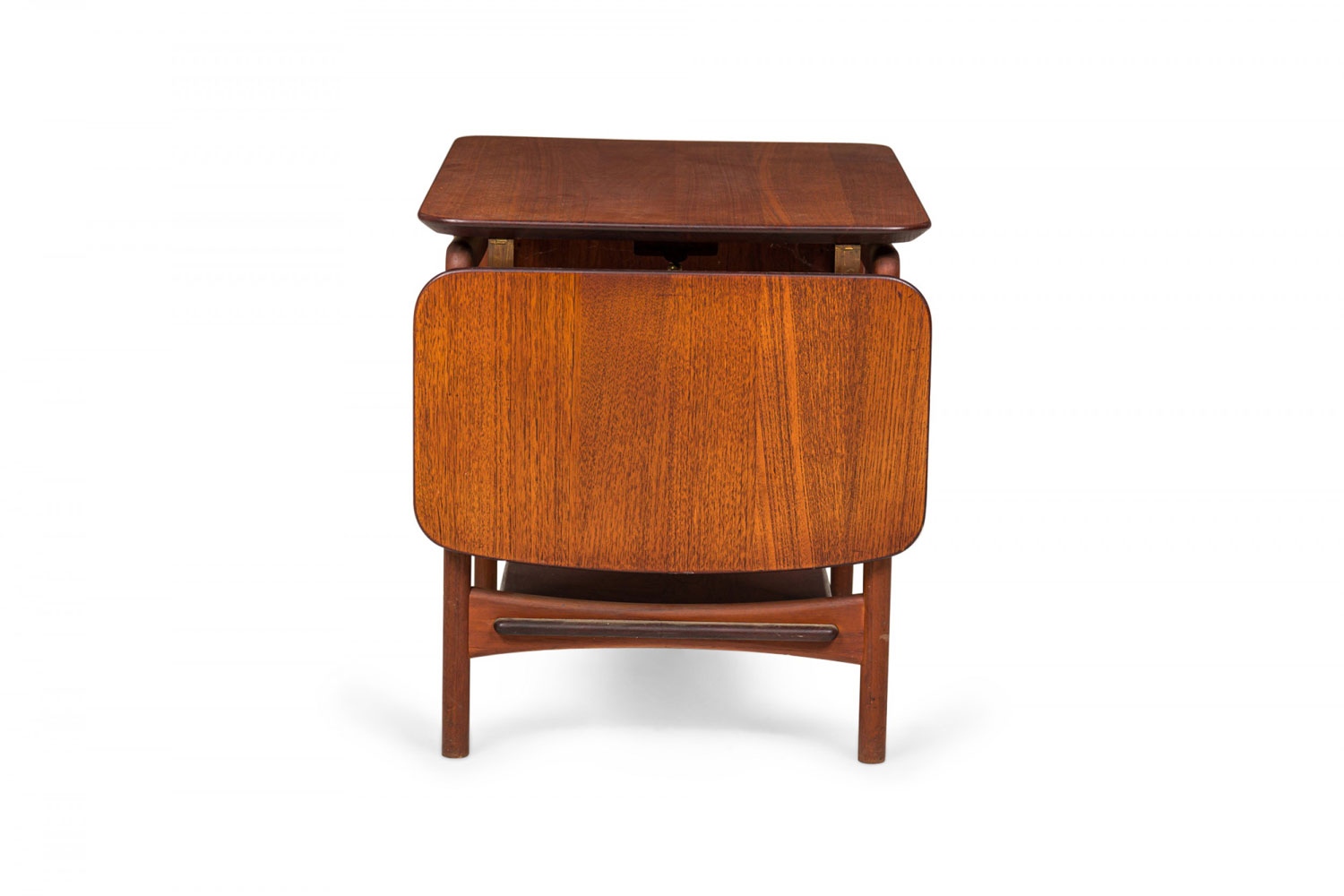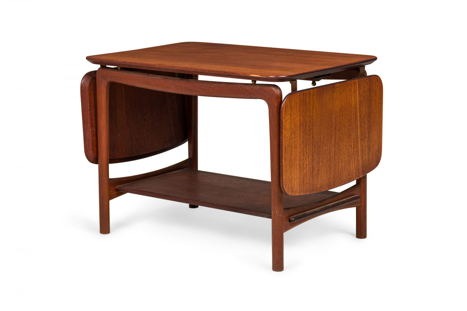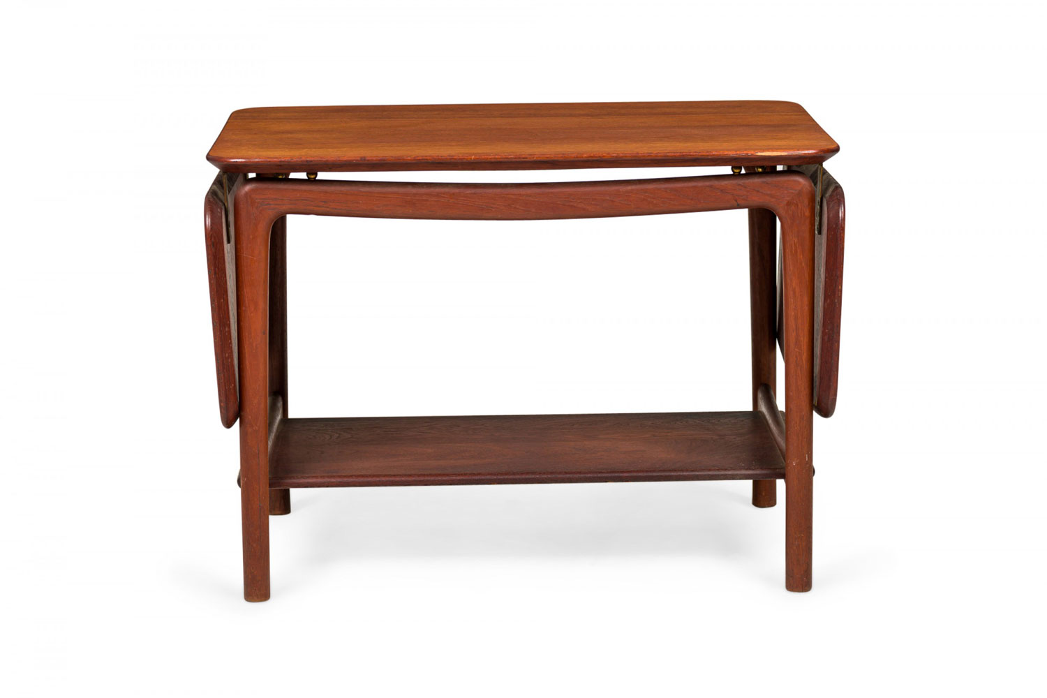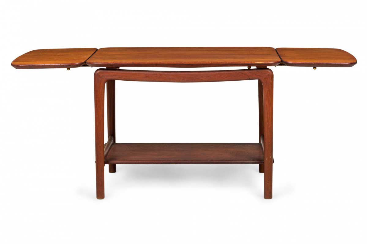 Danish Mid-Century rectangular teak end/side table with two drop leaves, supported by a four legged frame with a bottom stretcher shelf. (Similar tables: DUF0382, DUF0383)