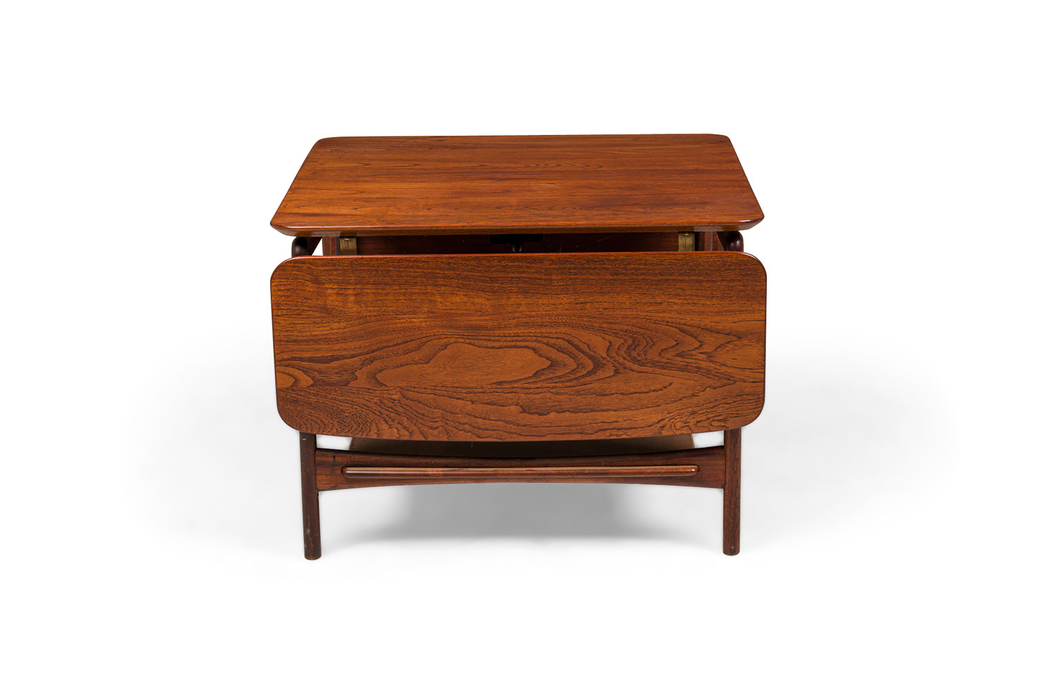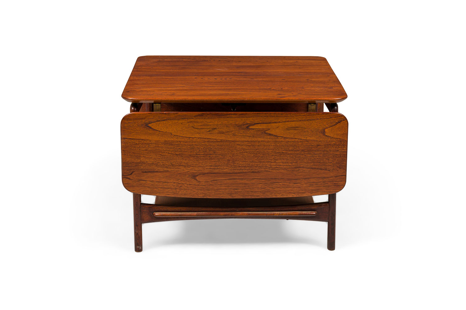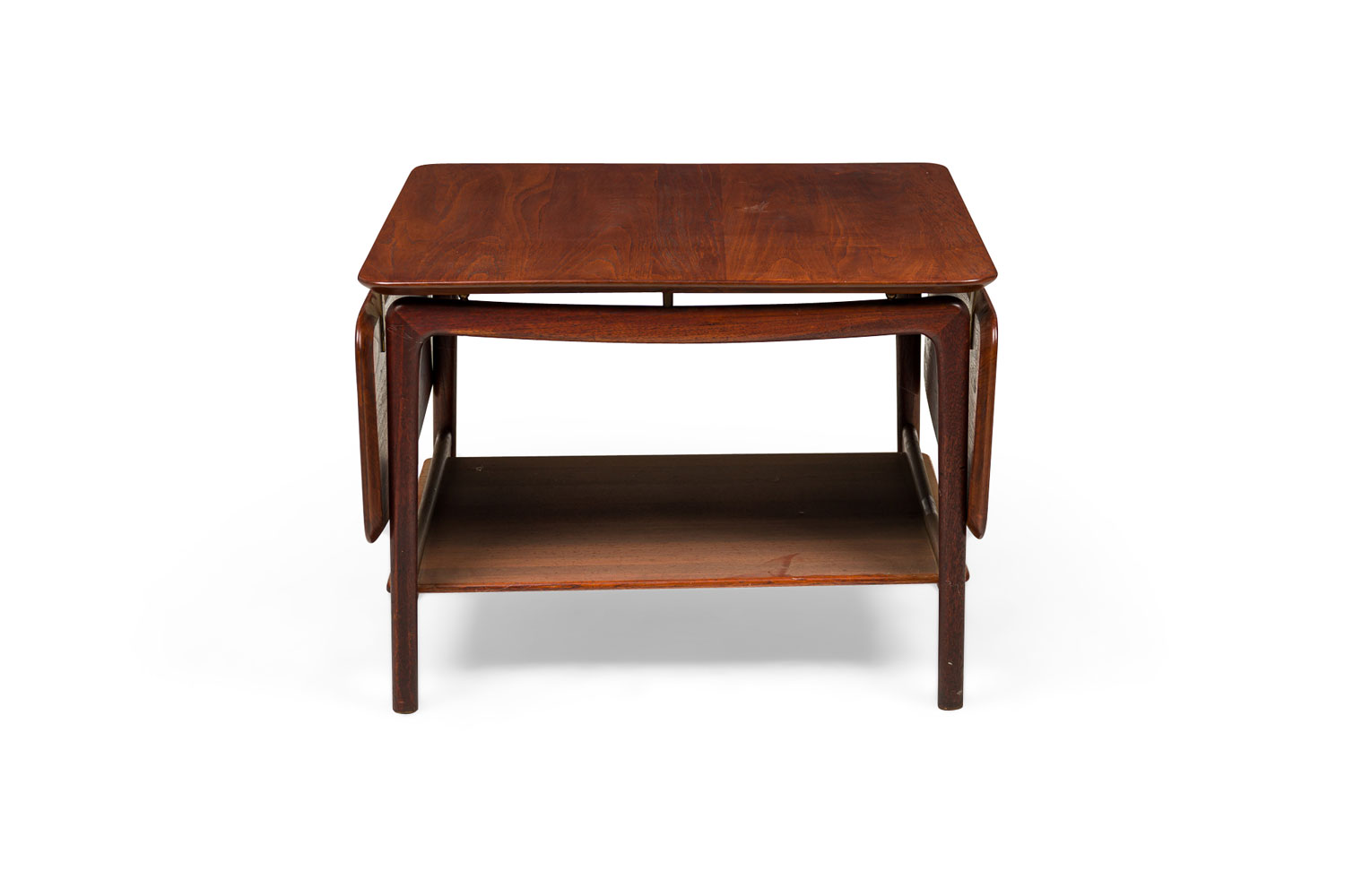 Danish Mid-Century square teak end/side table with two drop leaves, supported by a four legged frame with a bottom stretcher shelf.(Similar tables: DUF0381, DUF0382)